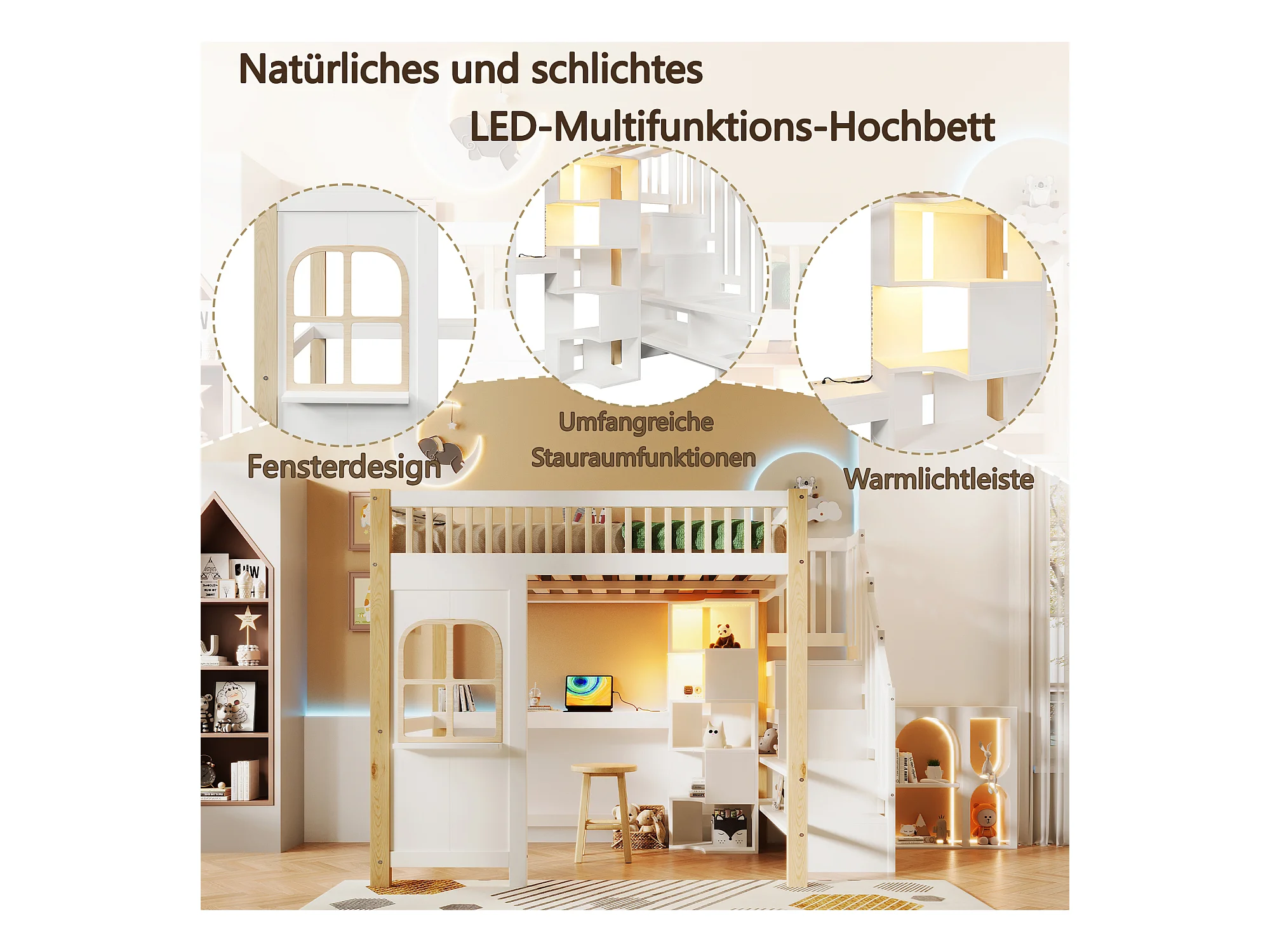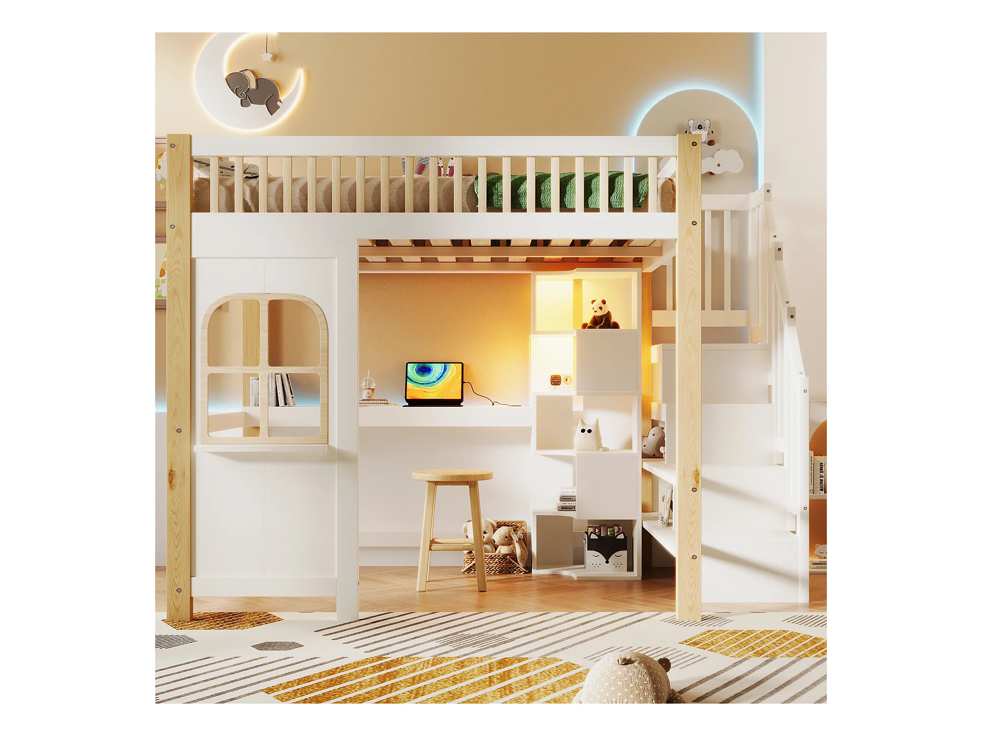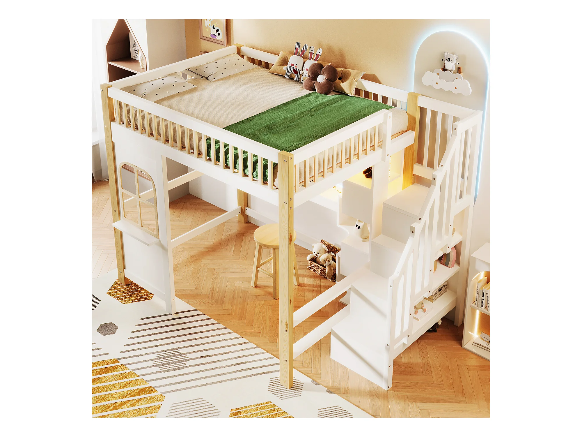 Lit mezzanine enfant - 140 x 200 cm - avec Leds + échelle de rangement - forme fenêtre - bois - blanc + naturel