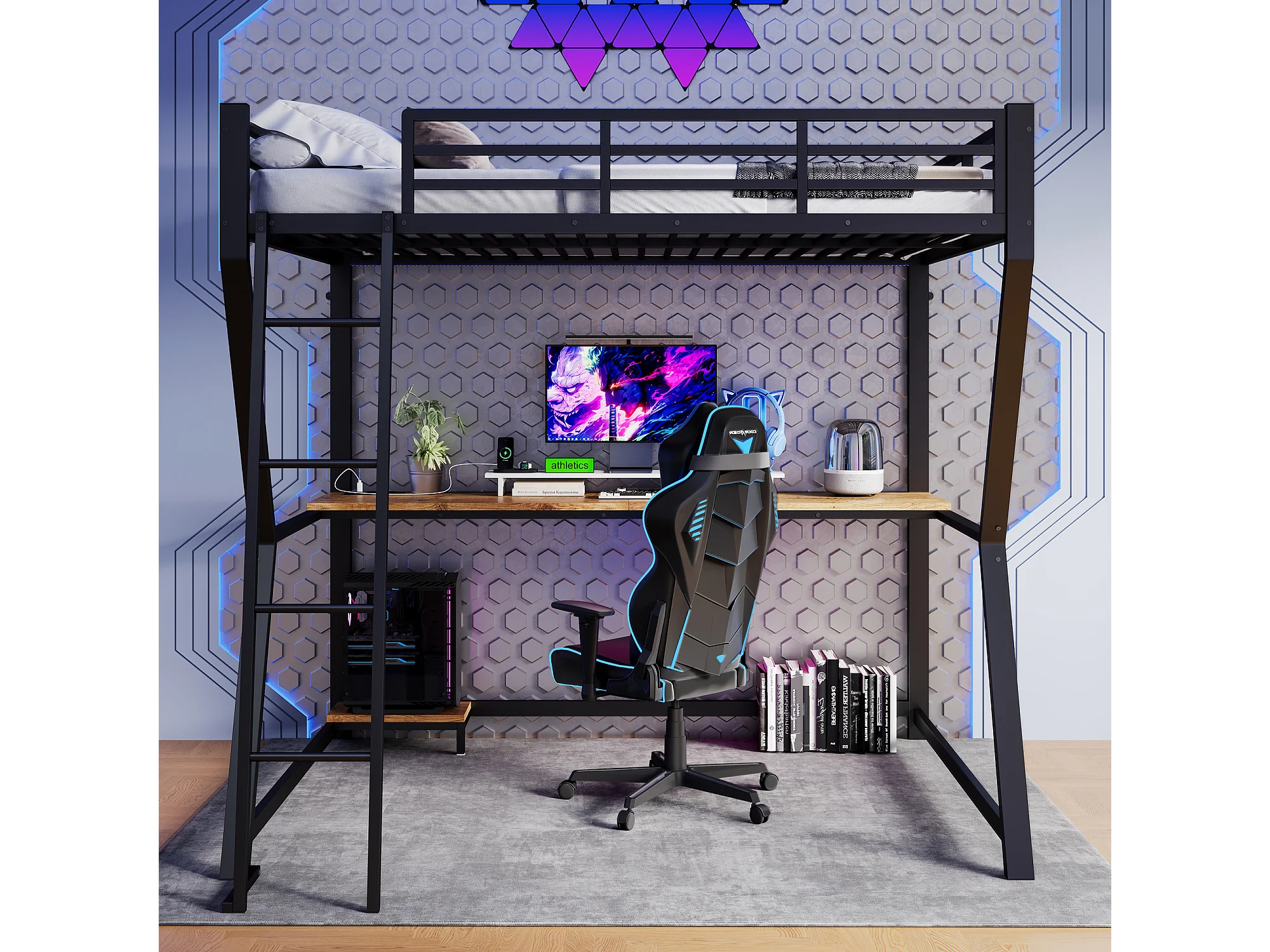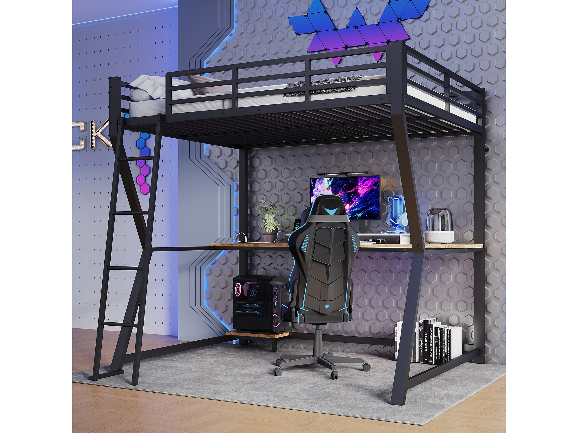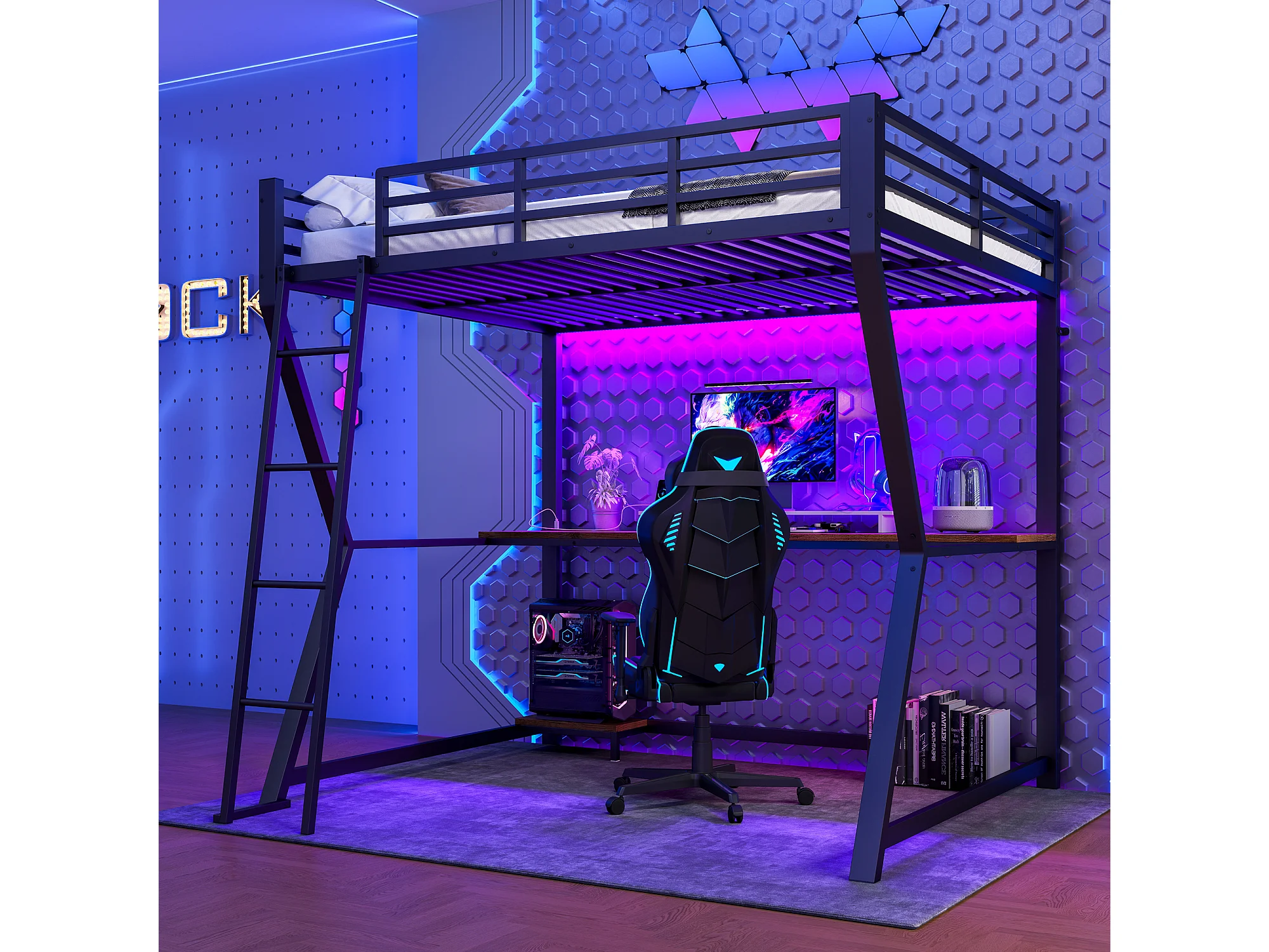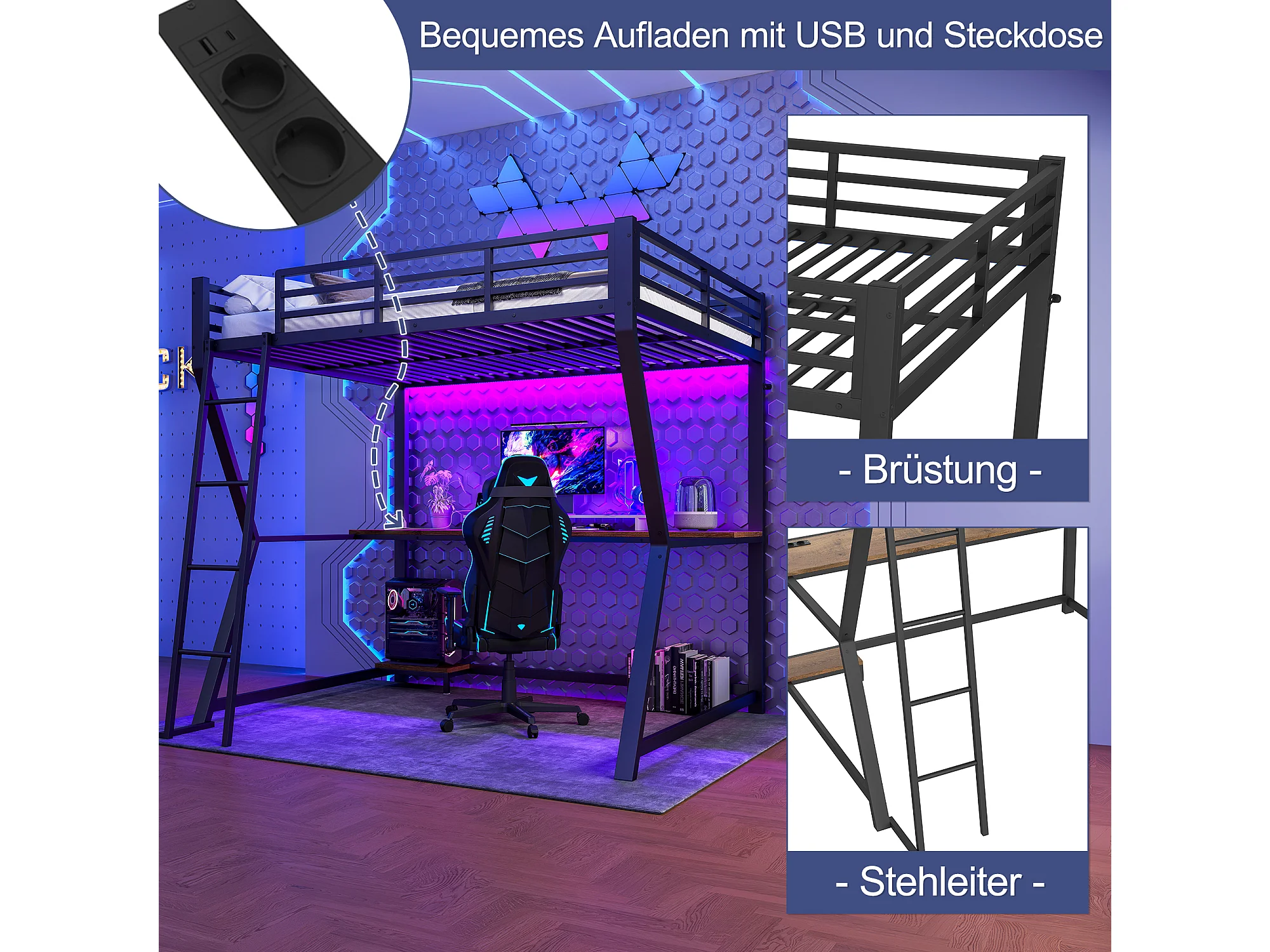 Lit mezzanine enfant - 140 x 200 cm - avec Leds + étagère + bureau + USB - Métal - noir