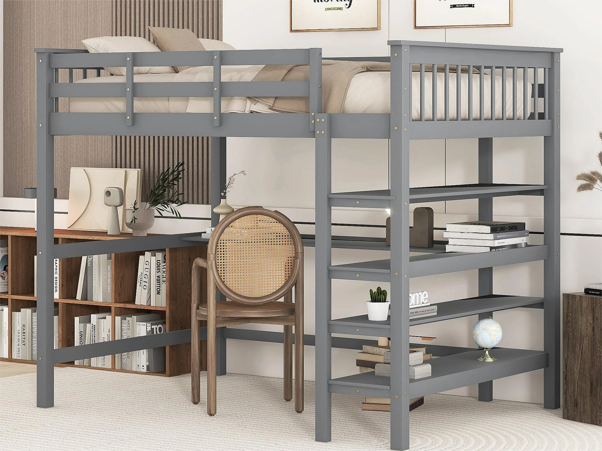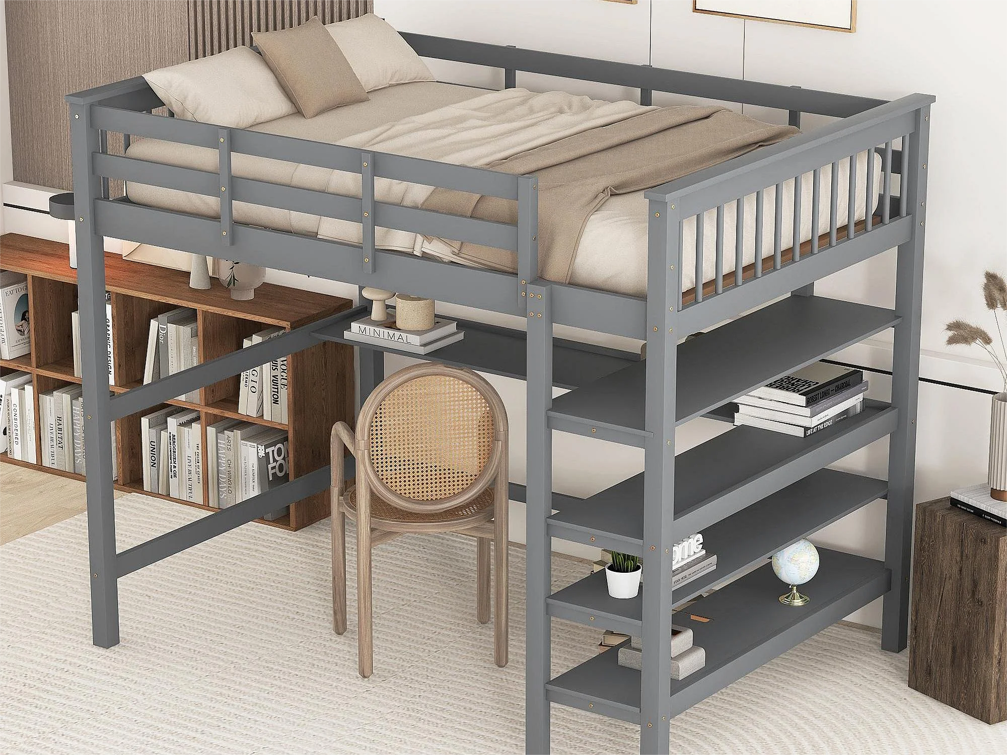 Lit mezzanine 140 x 200 cm - bureau + étagères de rangement - pin et MDF - gris