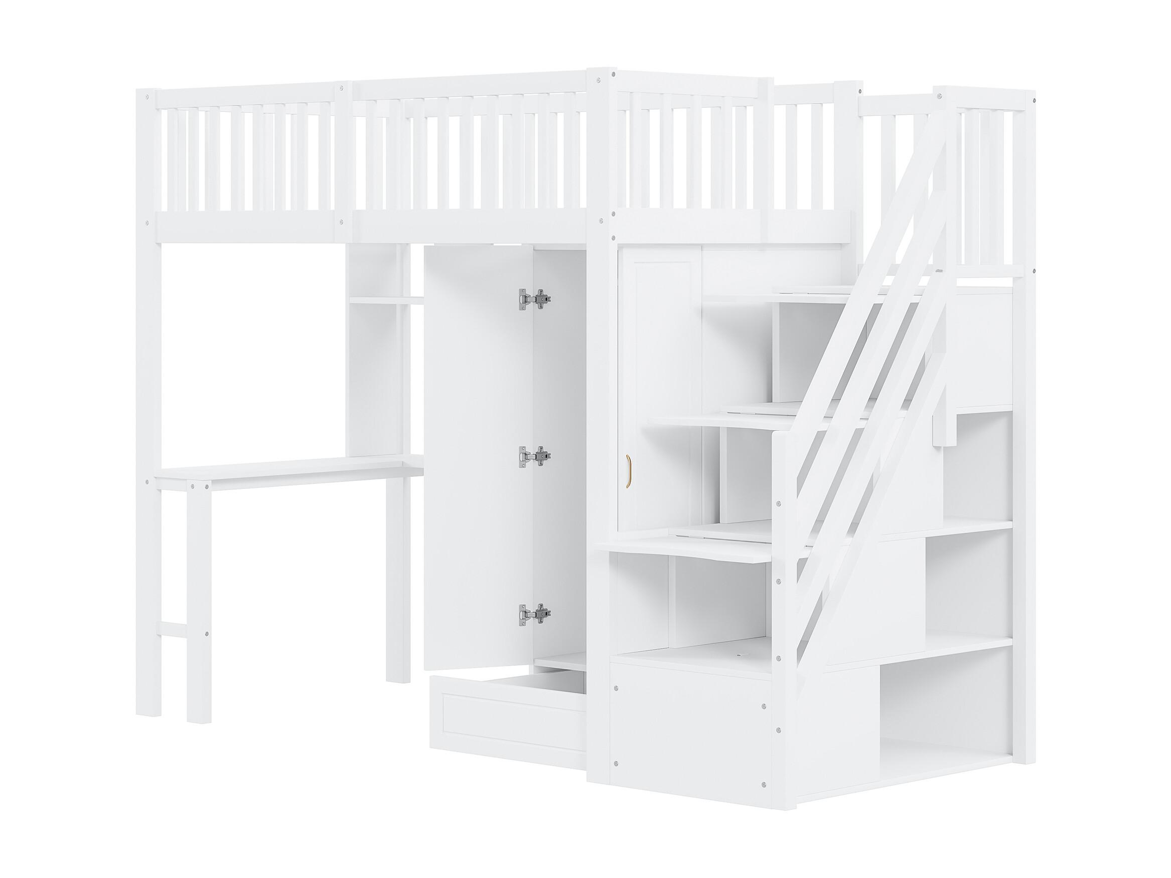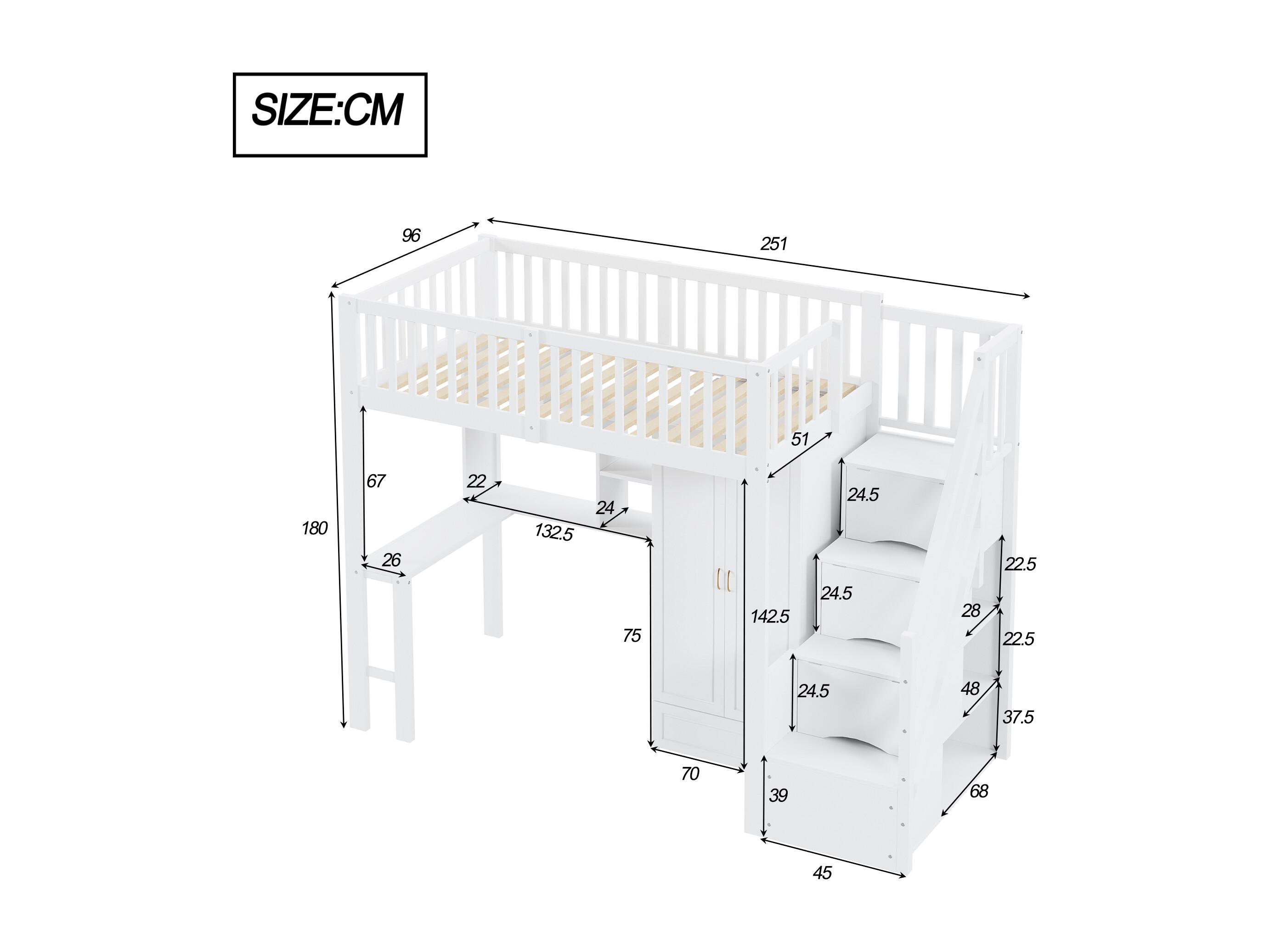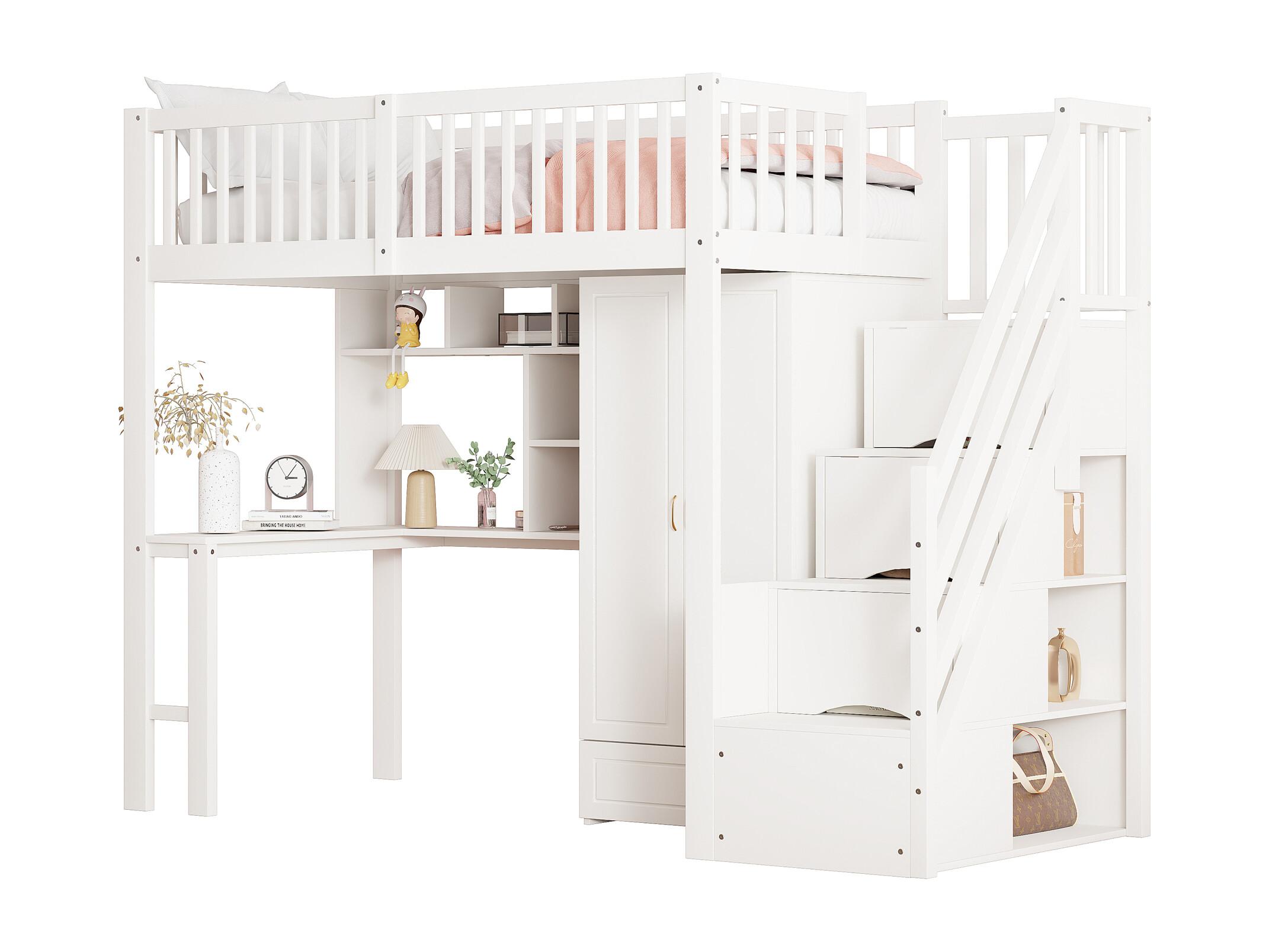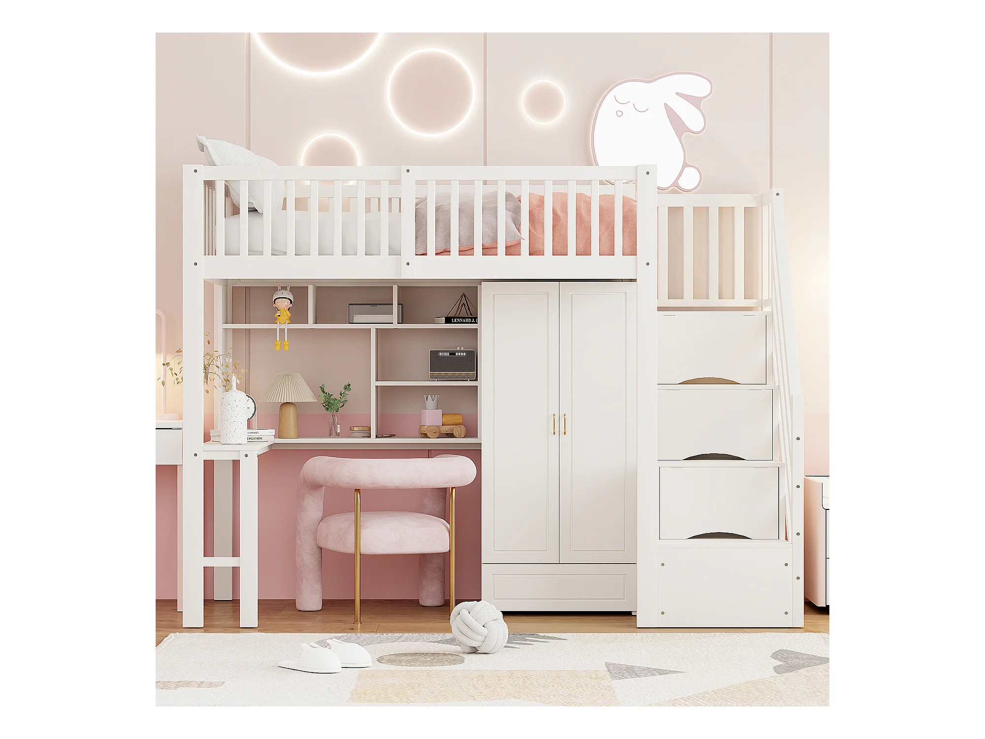 Lit mezzanine enfant - 90 x 200 - avec penderie + table + escalier de rangement - bois - blanc