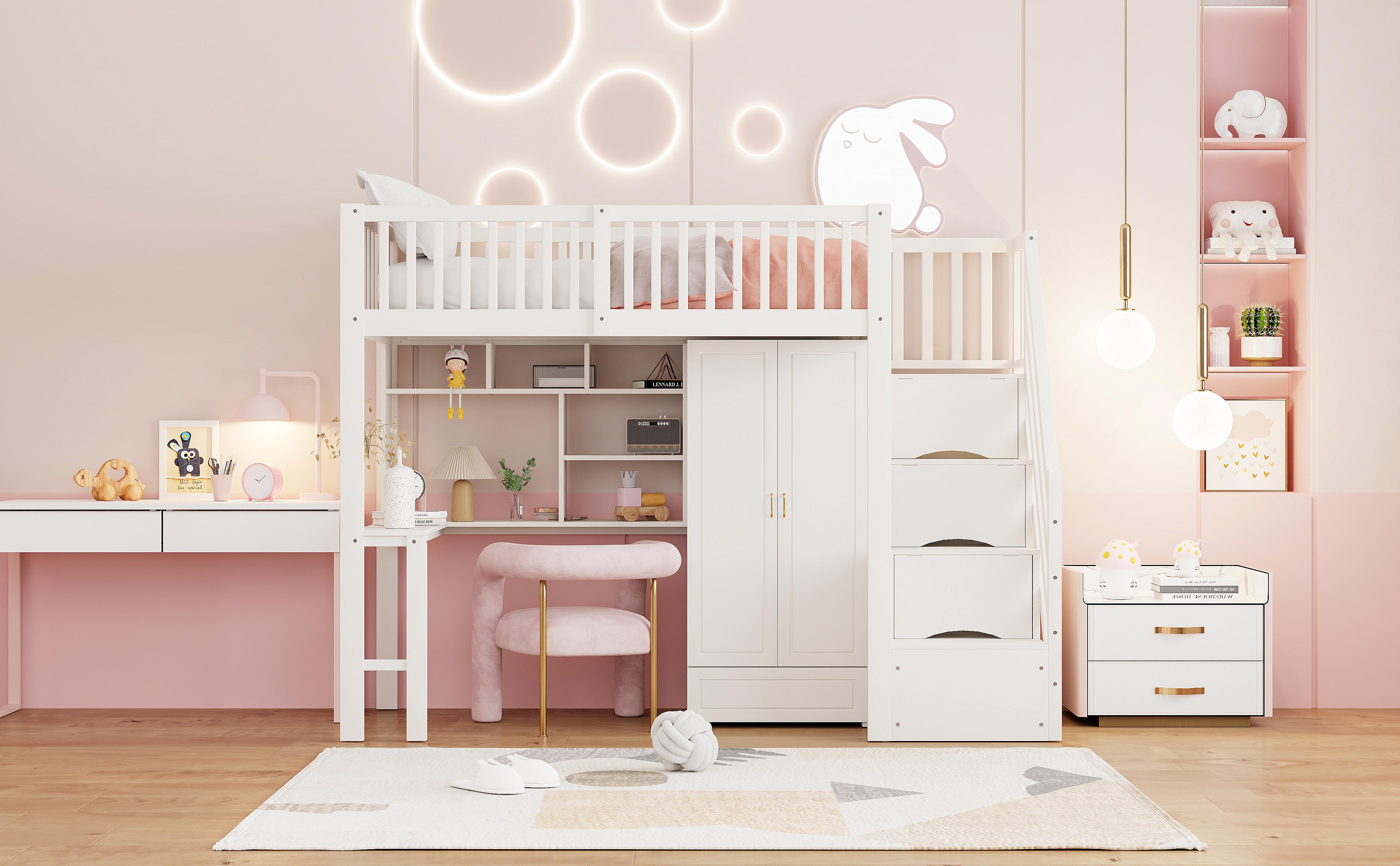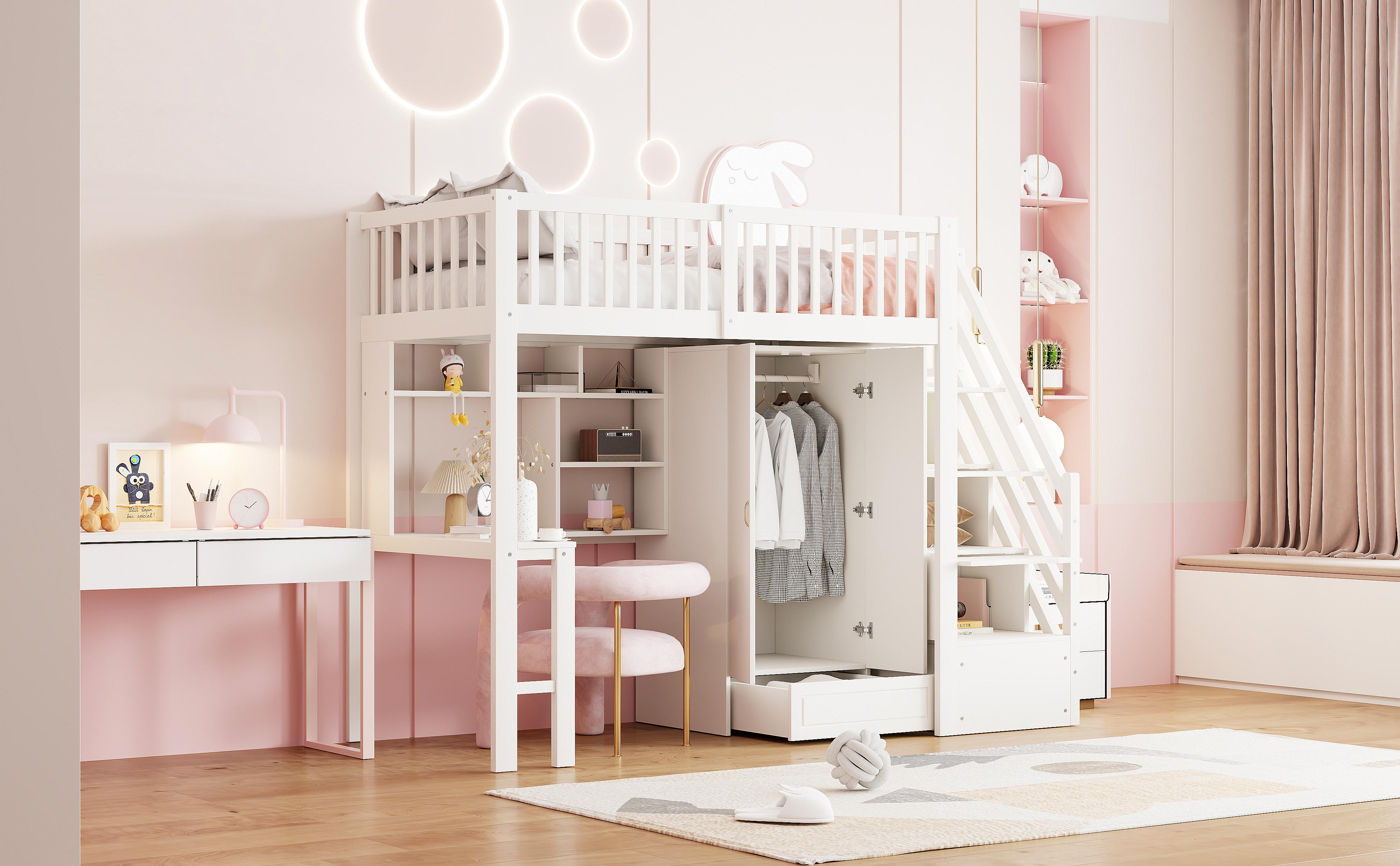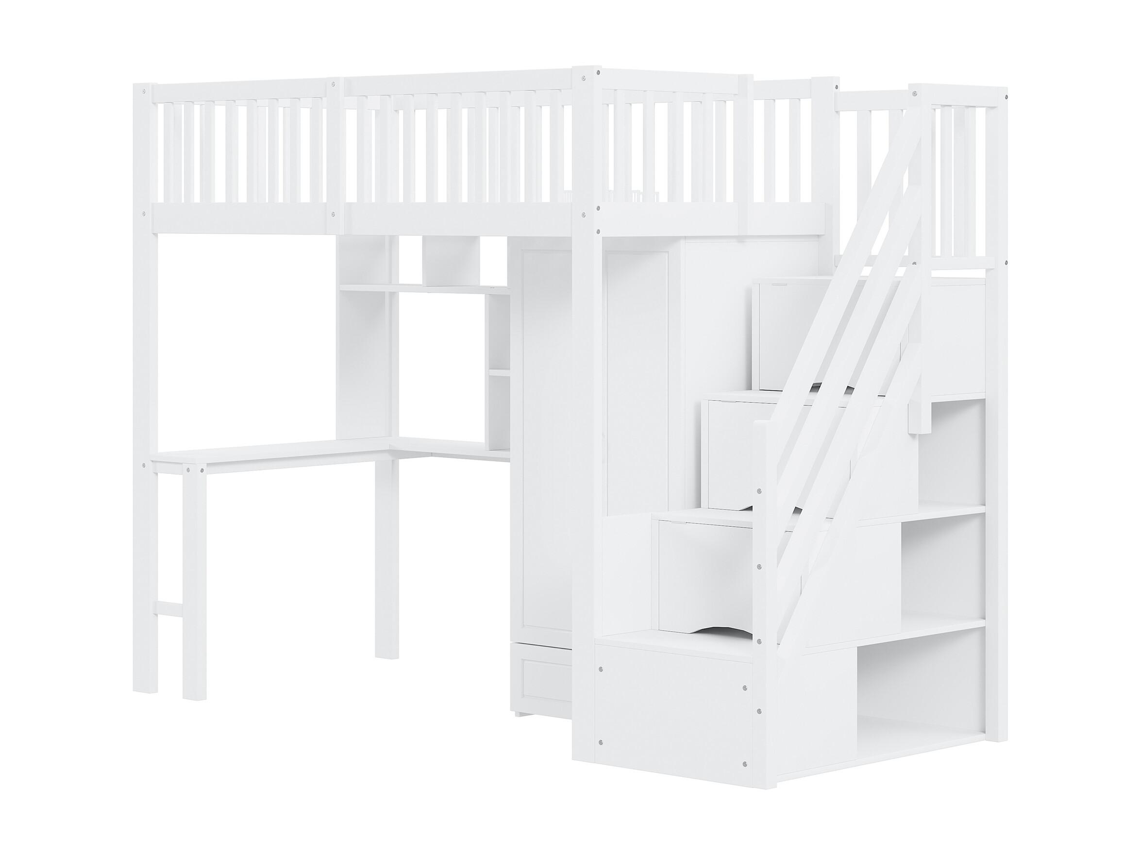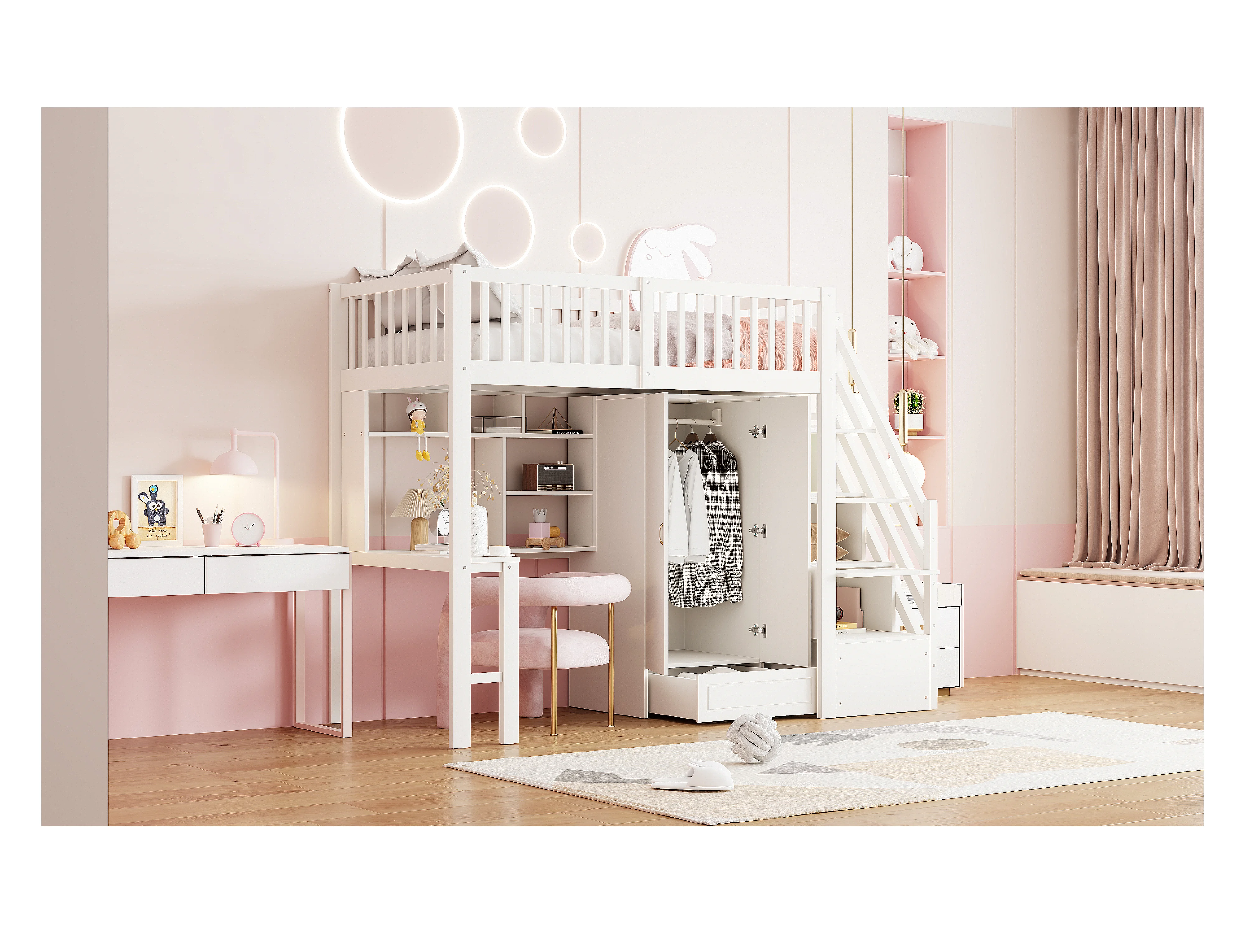 Lit mezzanine enfant - 90 x 200 - avec penderie + table + escalier de rangement - bois - blanc