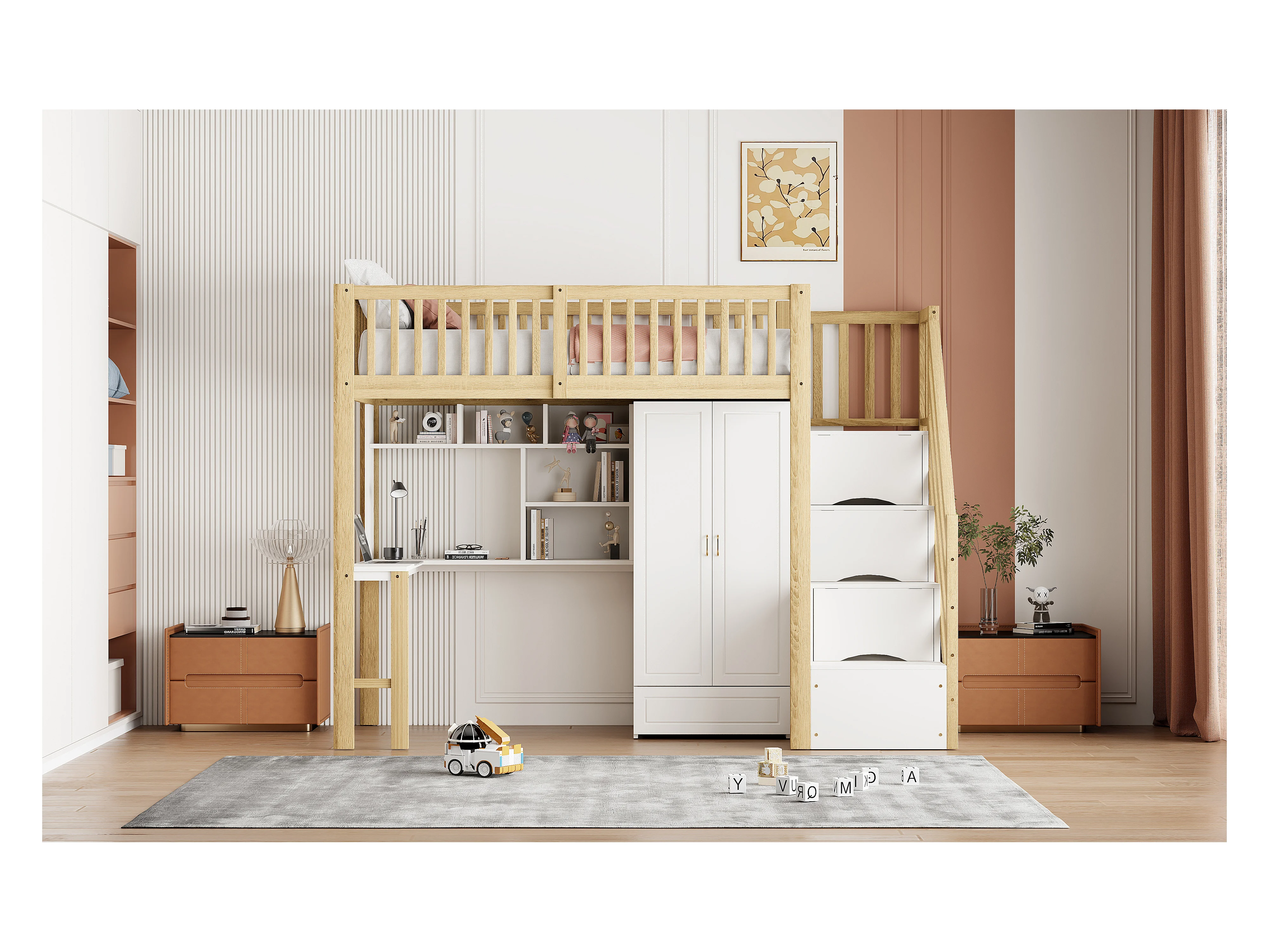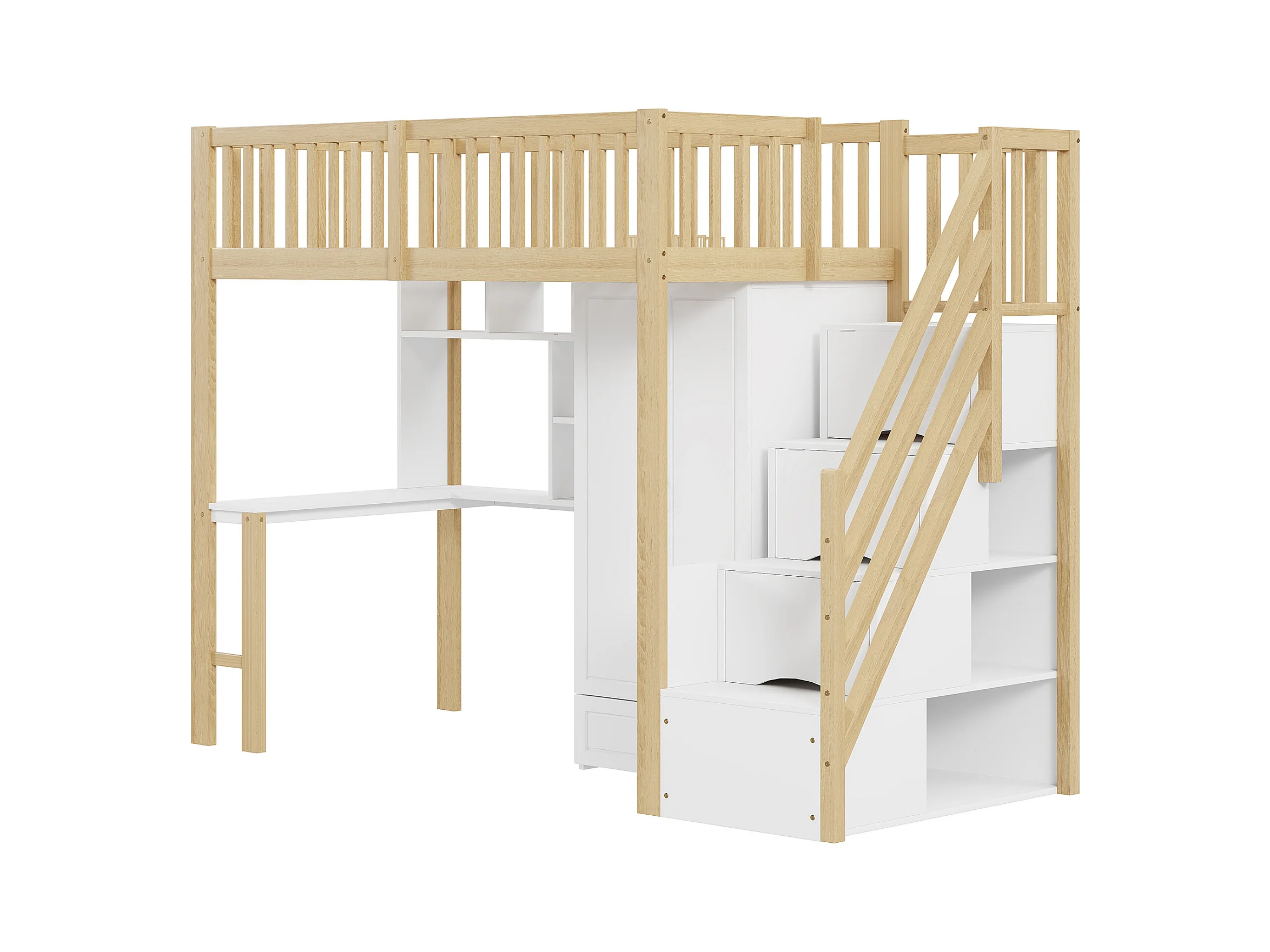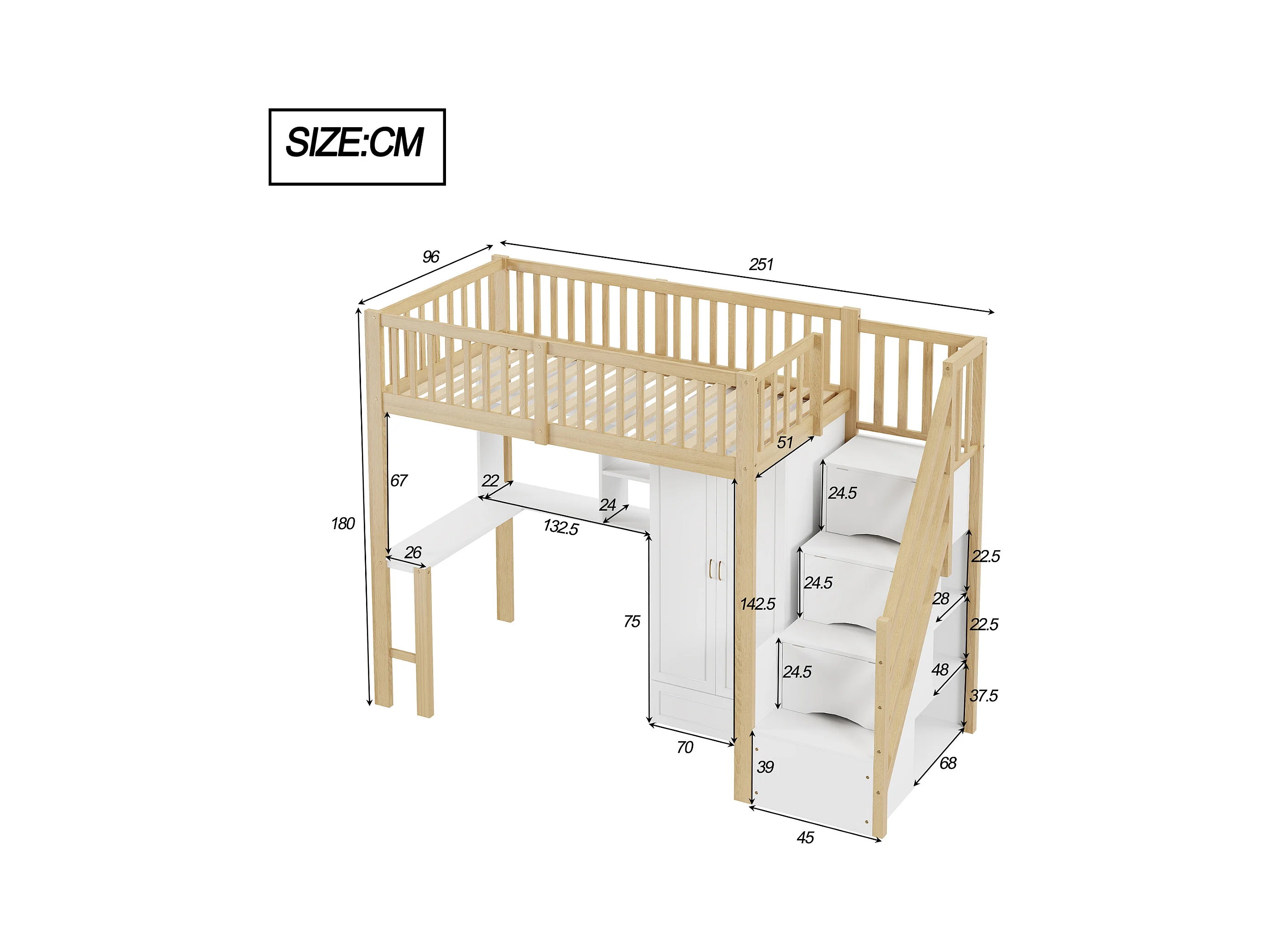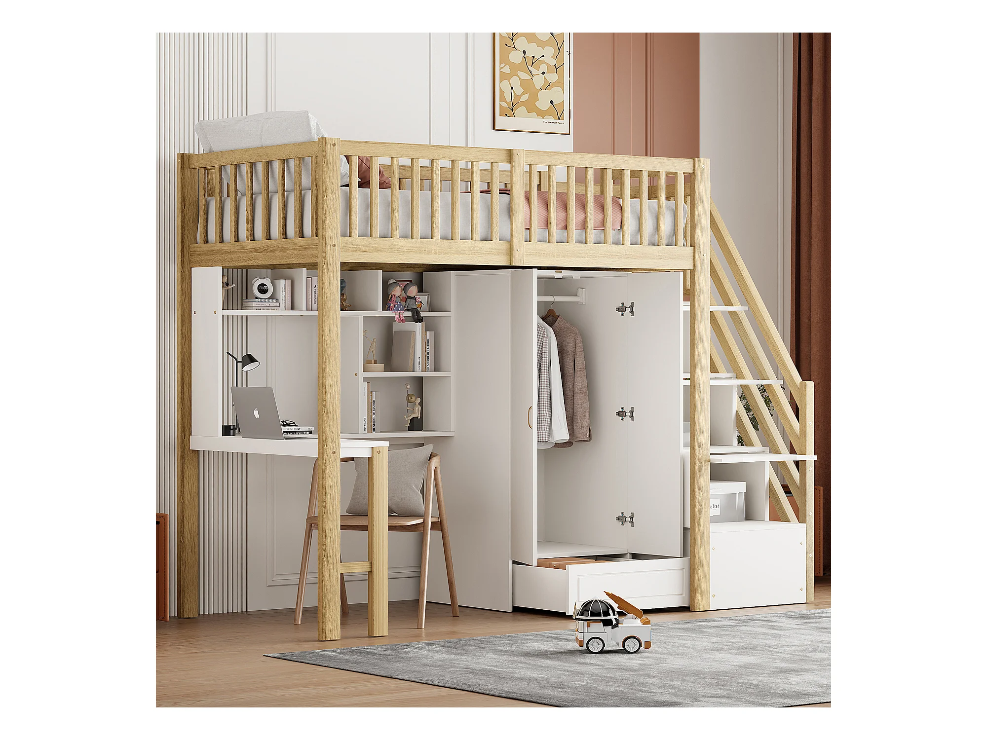 Lit mezzanine enfant - 90 x 200 - avec penderie + table + escalier de rangement - bois - blanc + naturel