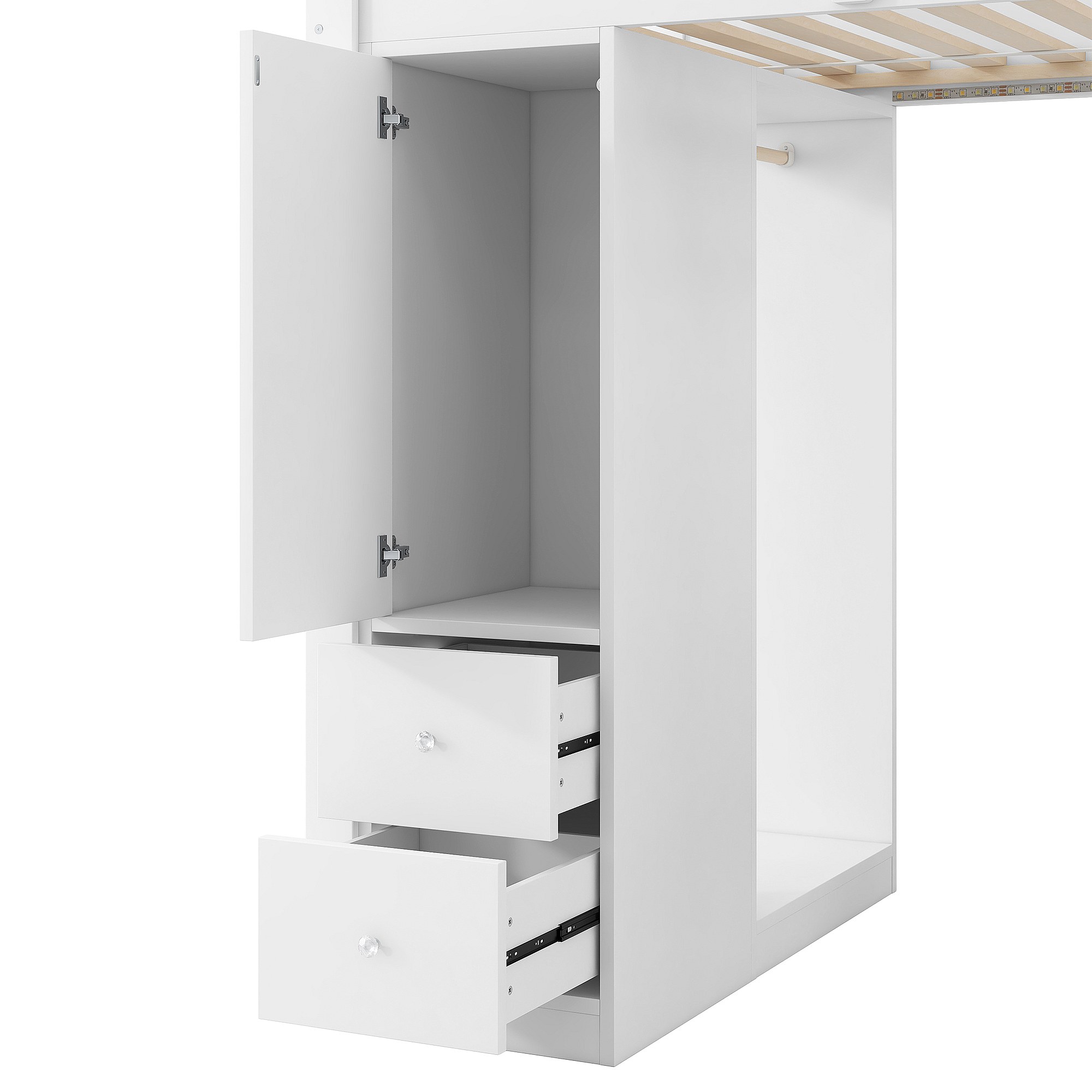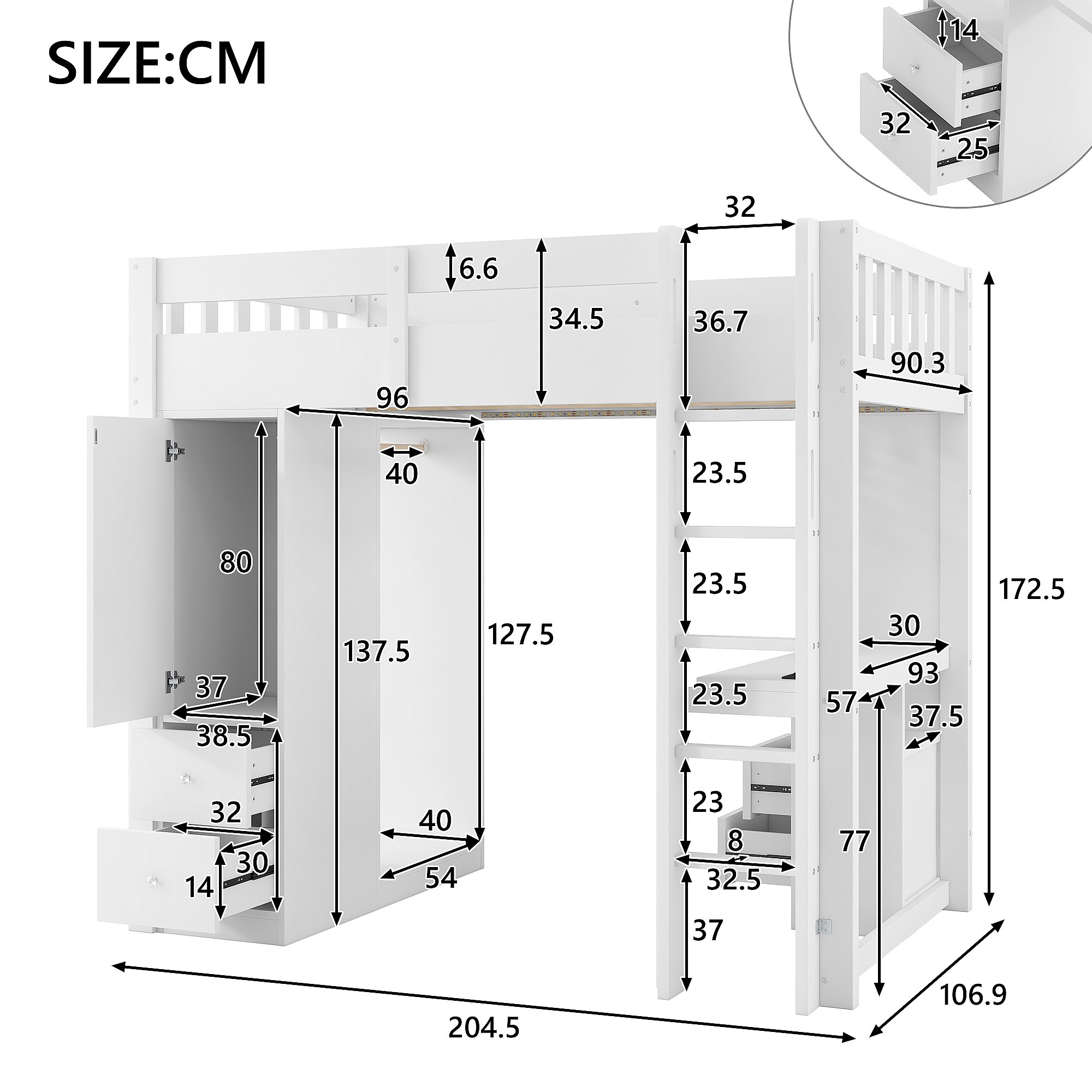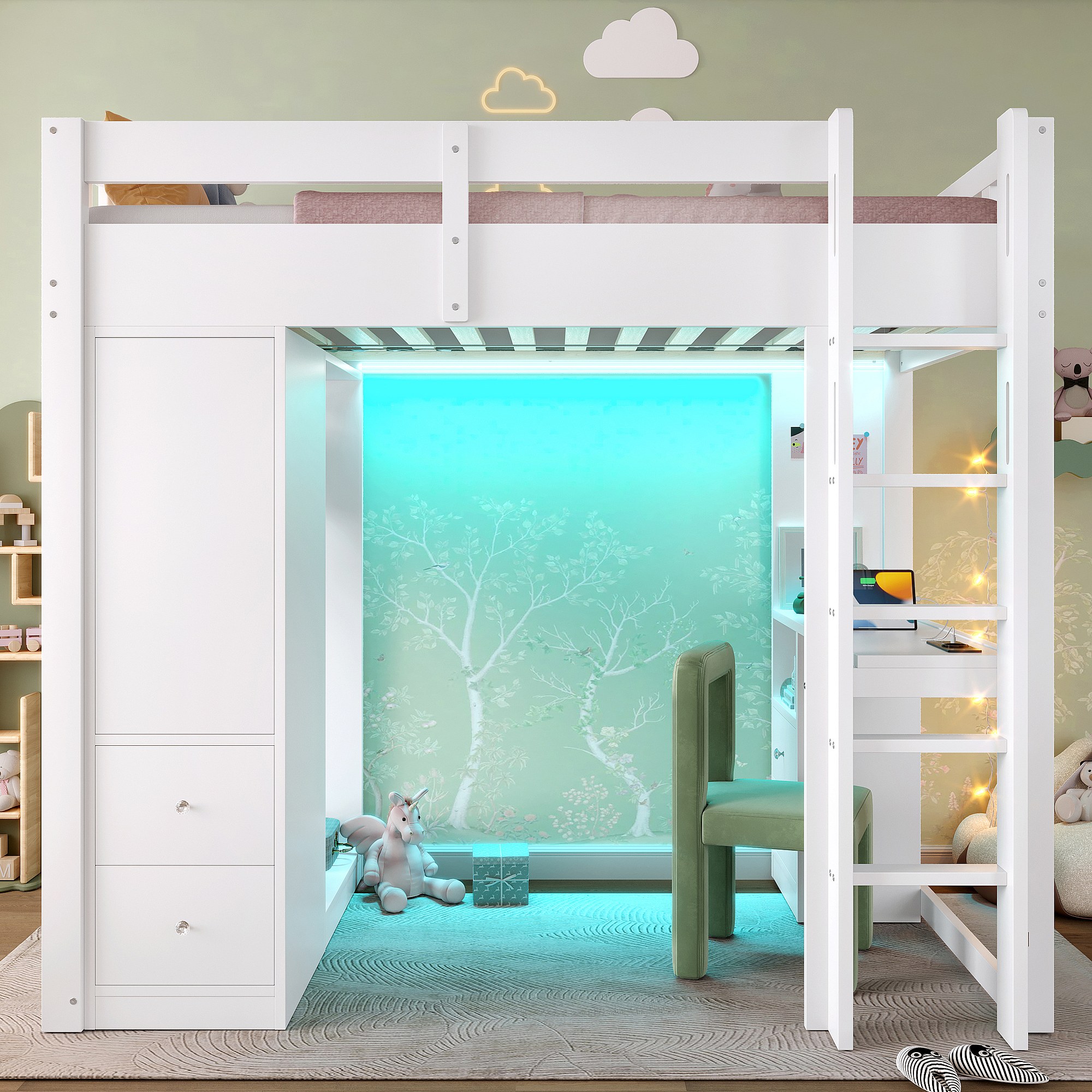Lit mezzanine enfant - 90 x 200 cm - avec 4 tiroirs + armoir + bureau + Leds et USB - bois + MDF - blanc