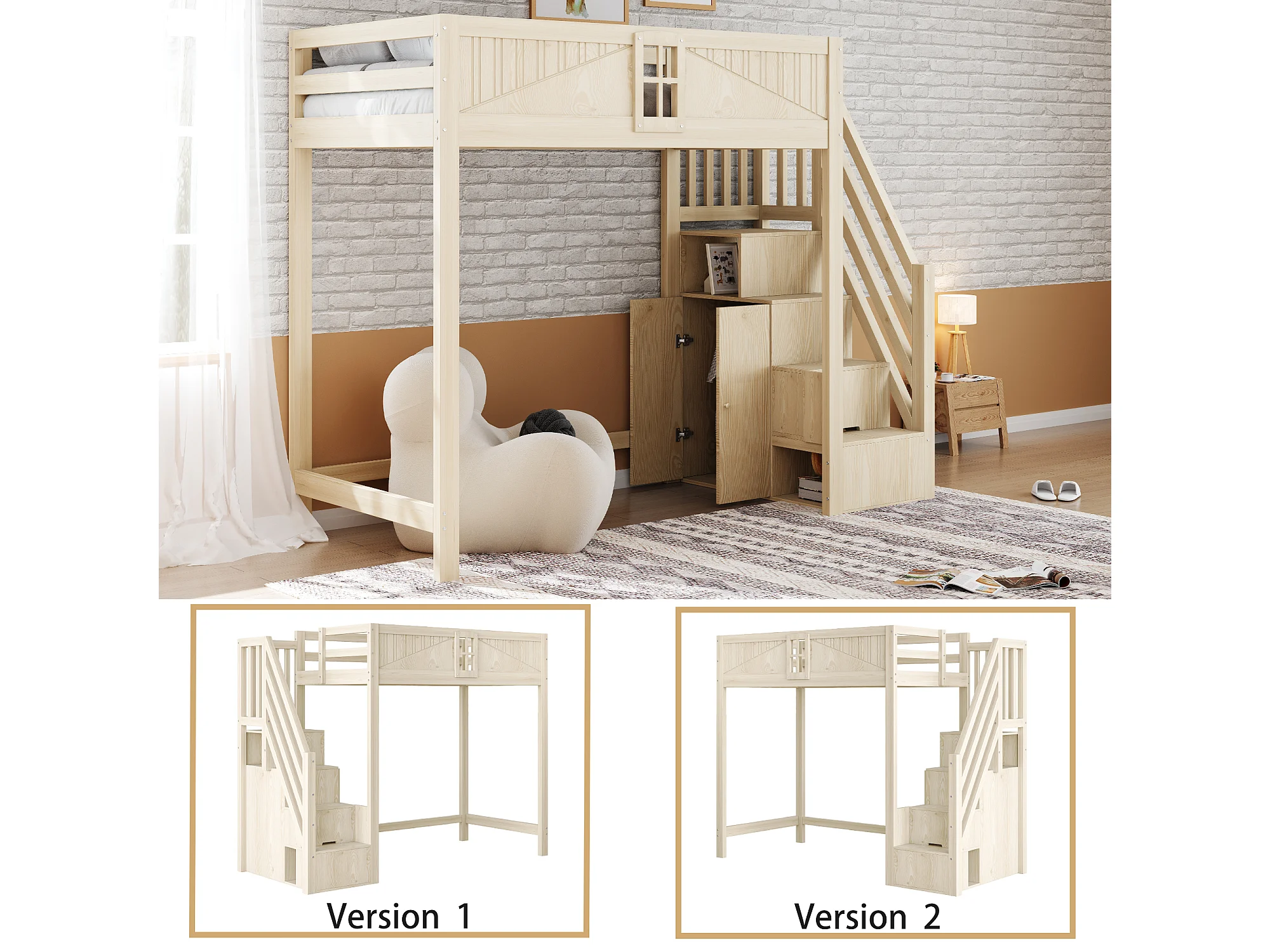 Lit mezzanine 90x200cm - avec escalier 、un placard amovible et barrières de sécurité - cadre de lit en bois massif - Blanc & Naturel