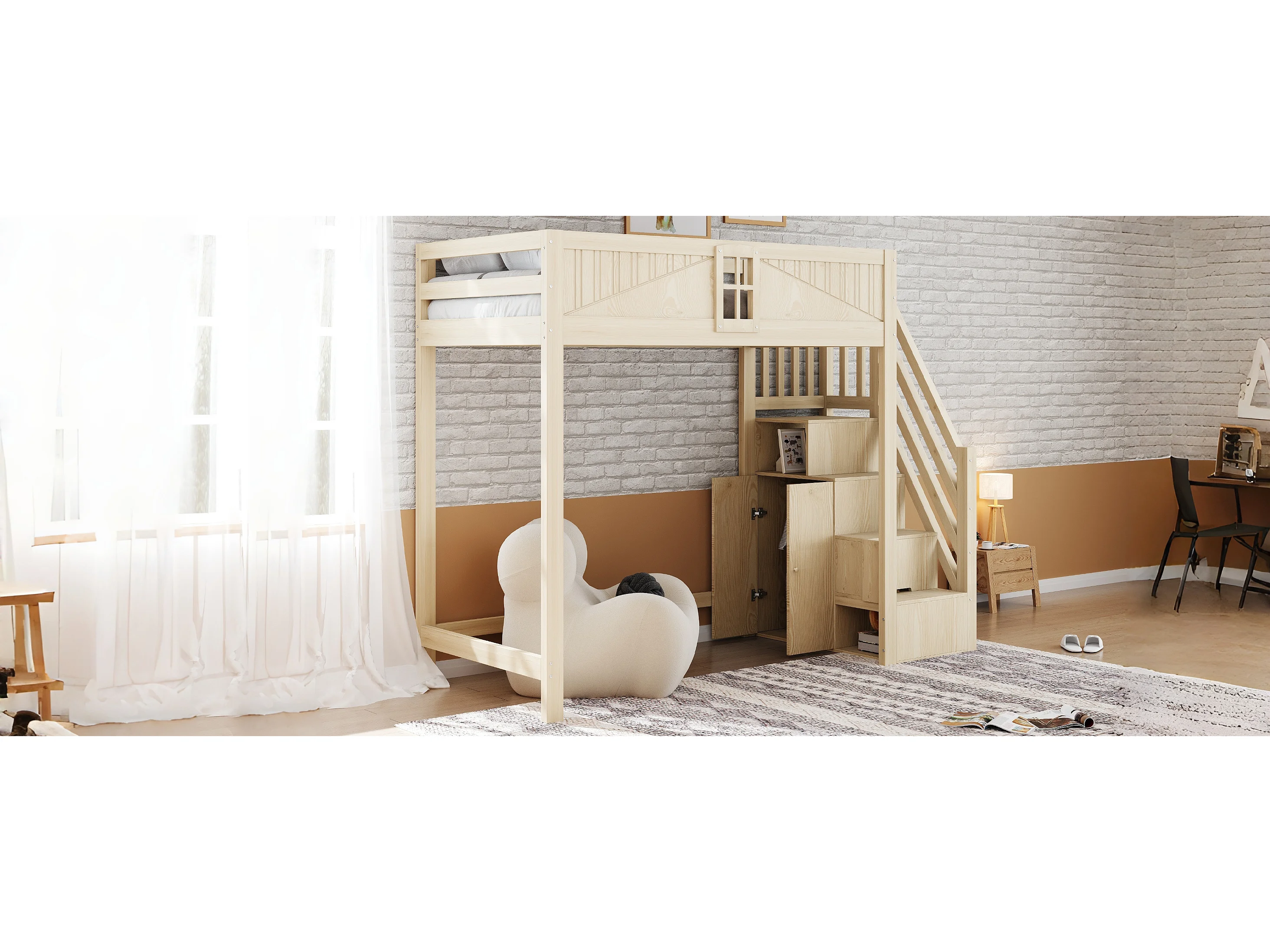 Lit mezzanine enfant - 90 x 200 cm - avec escalier rangement + fenêtre + armoire - bois + MDF - naturel