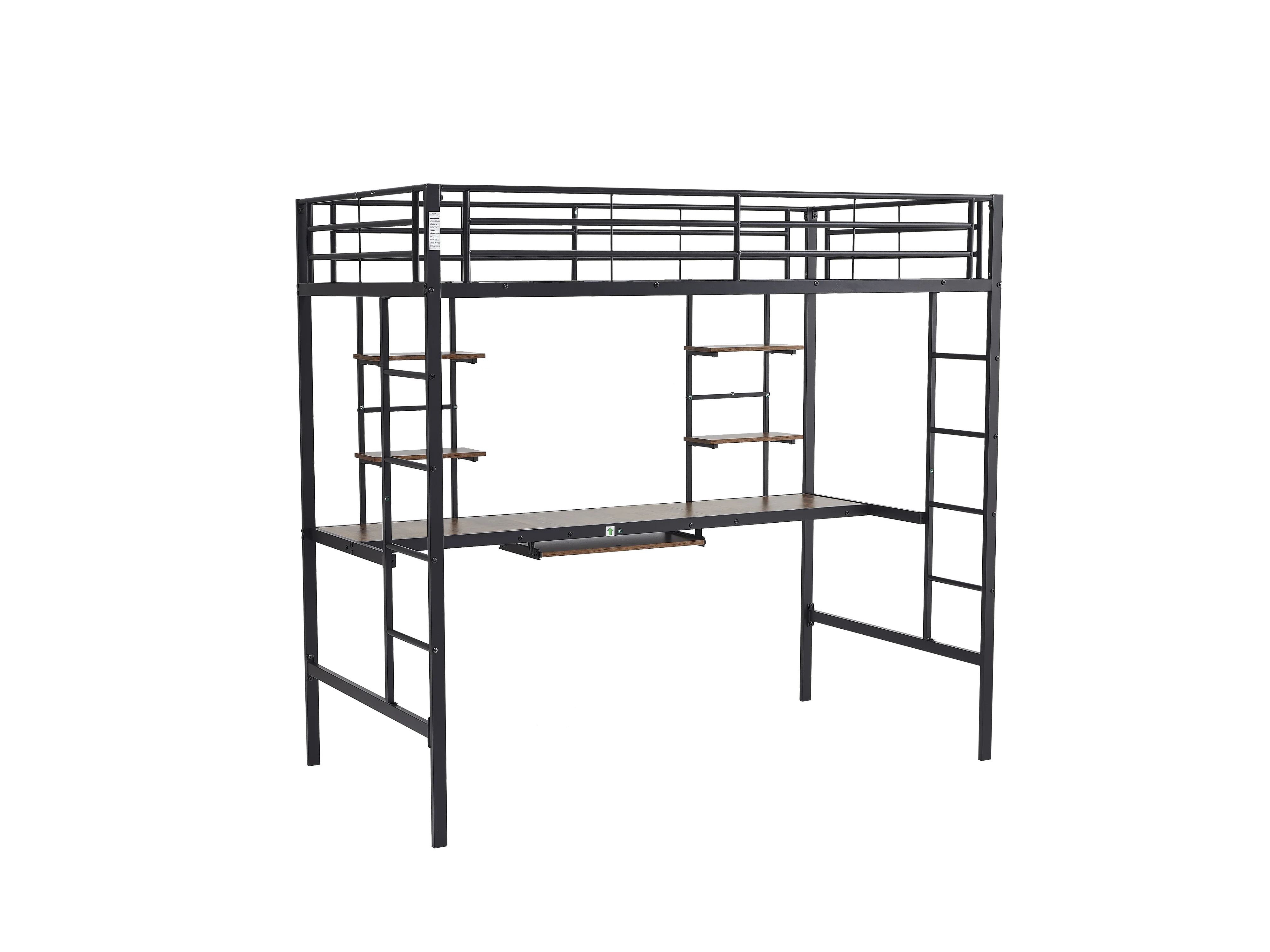 Lit mezzanine enfant 90x190 cm noir avec table, étagère et barrières de sécurité, structure métallique (sans matelas)
