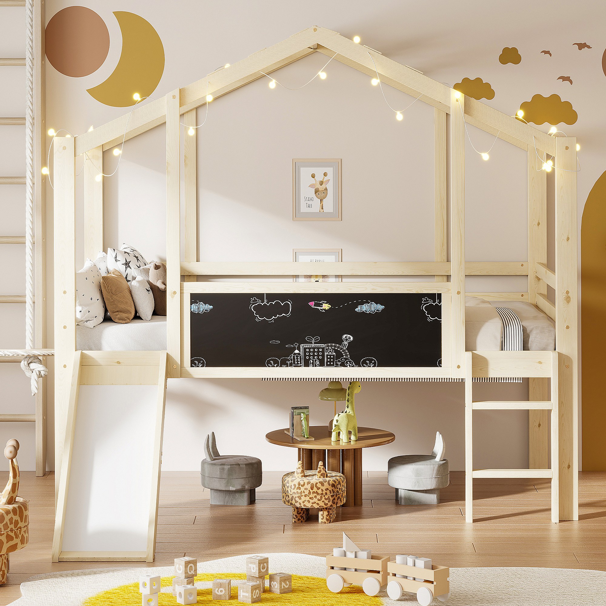 Lit mezzanine enfant 90x200 cm - avec échelle de sécurité - avec toboggan - avec tableau à dessin - Naturel (matelas non inclus)