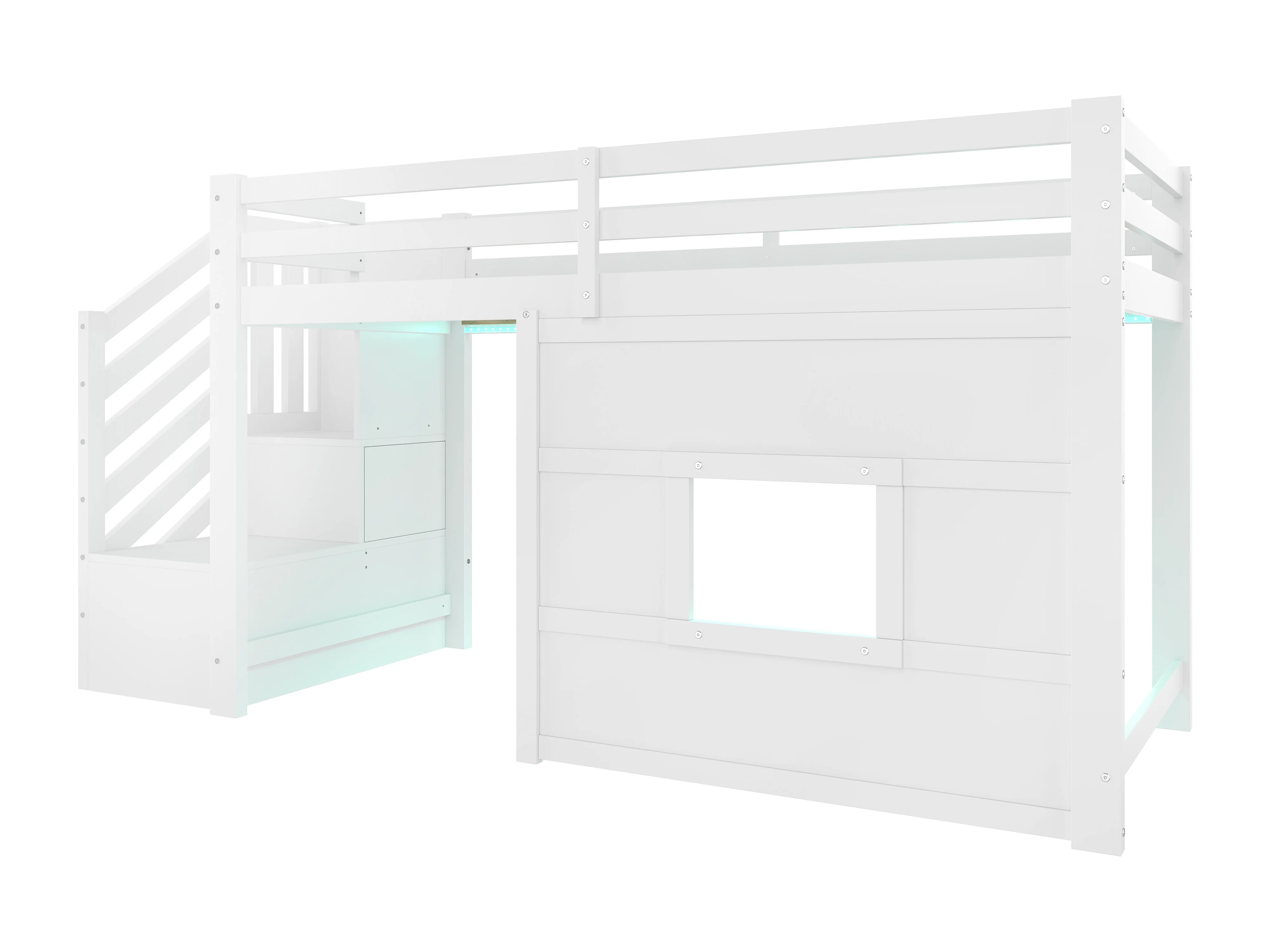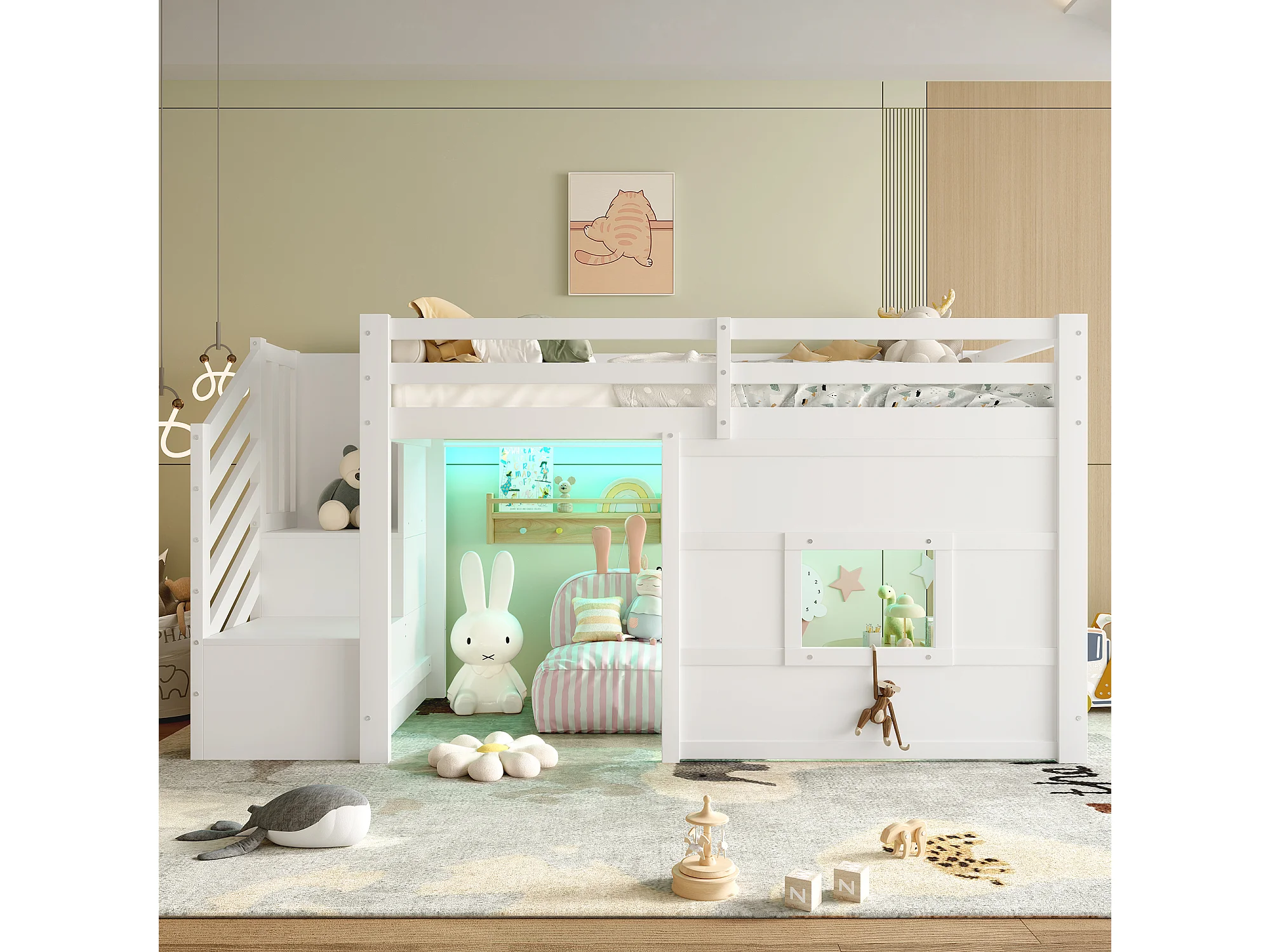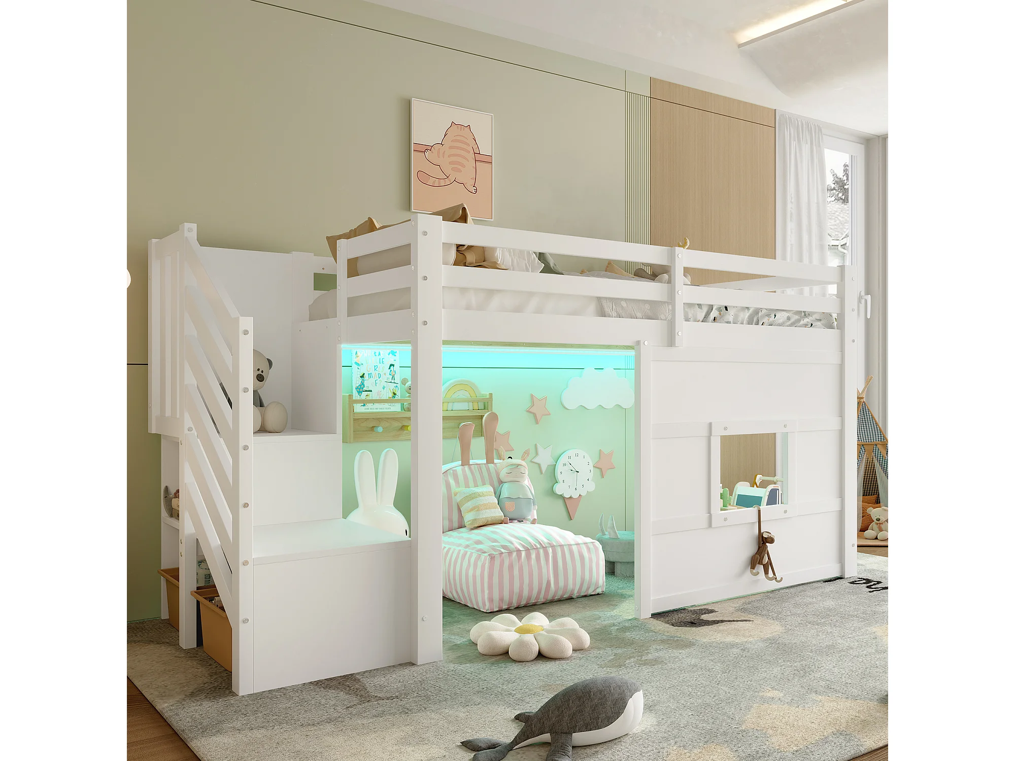 Lit mezzanine enfant 90x200 cm - avec escalier de rangement et fenêtre - blanc (sans matelas)