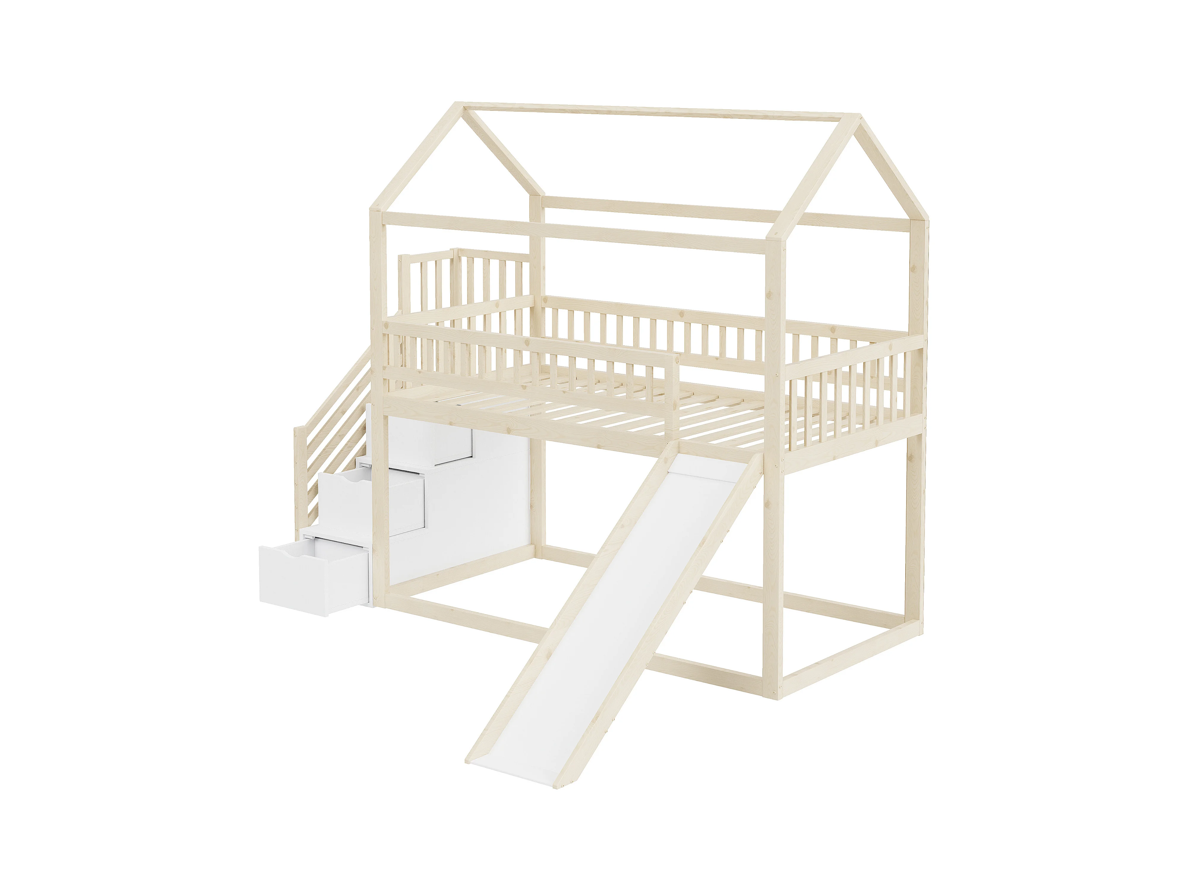 Lit mezzanine 90x200 cm - avec échelle de rangement - avec toboggan - avec barrières de sécurité - naturel + blanc (matelas non inclus)