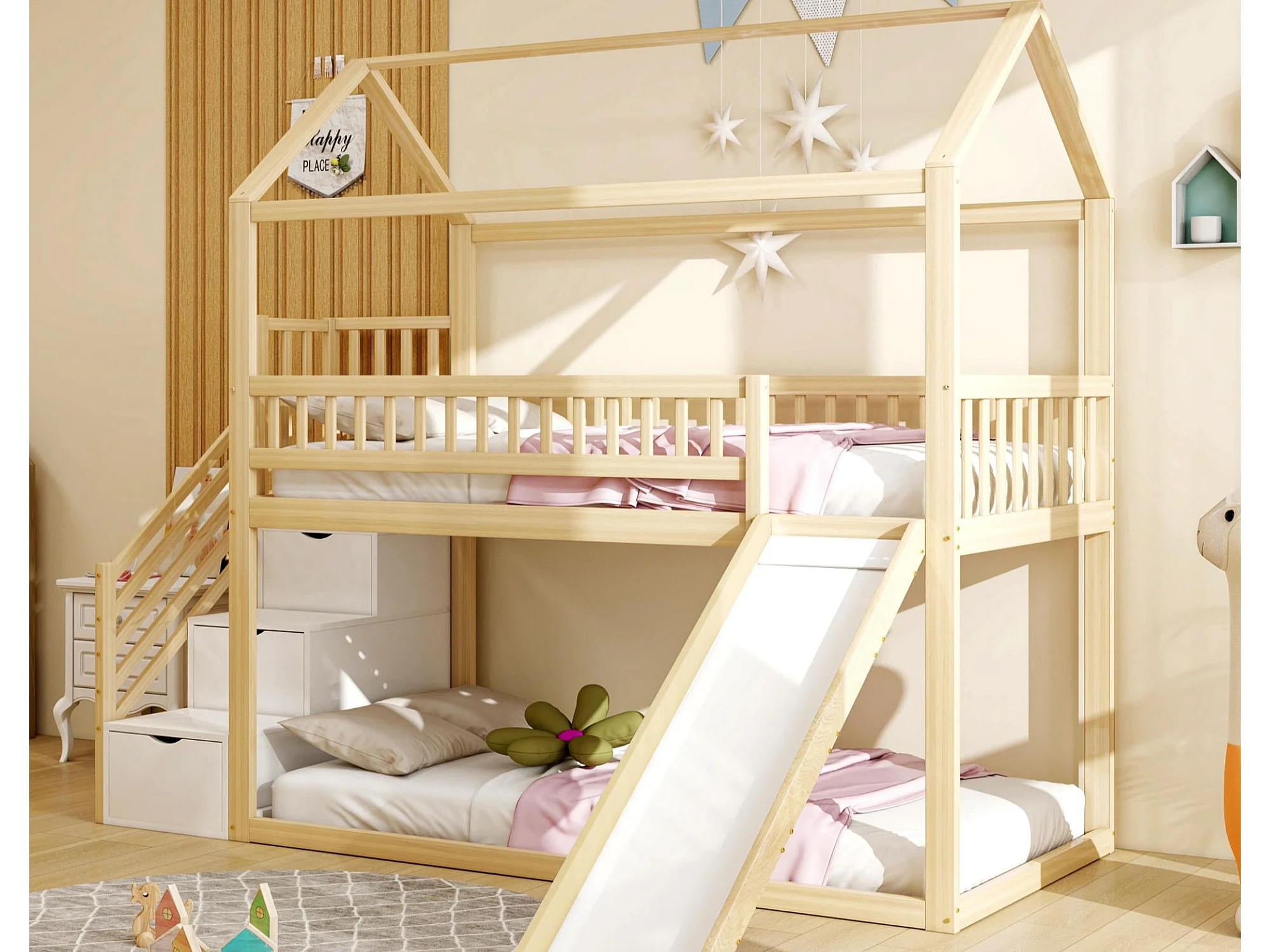 Lit mezzanine enfant 90x200 cm - avec toboggan - avec échelle de sécurité - avec 3 tiroirs - naturel (matelas non inclus)