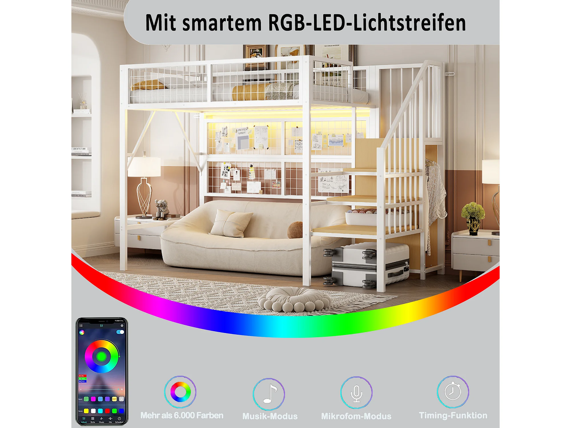 Lit mezzanine enfant en métal - 90 x 200 cm - avec armoire + Leds + rangements dans l'escalier - MDF + Métal - blanc