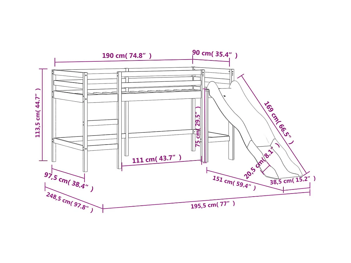 Lit mezzanine enfants avec tour sans matelas 90x190 cm