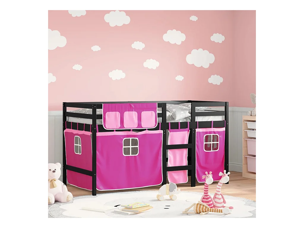 Lit mezzanine enfants et rideaux rose 80x200cm bois pin massif FR69529