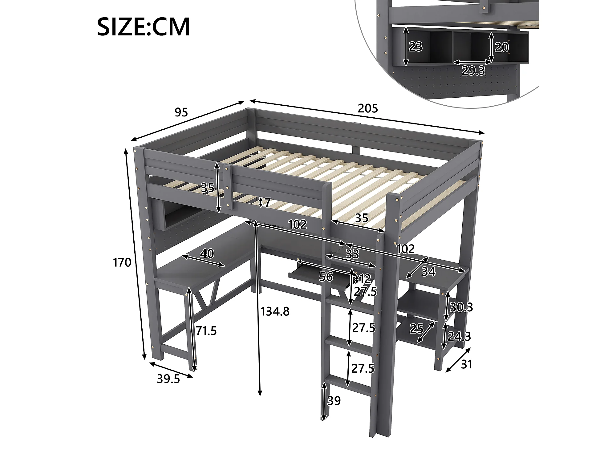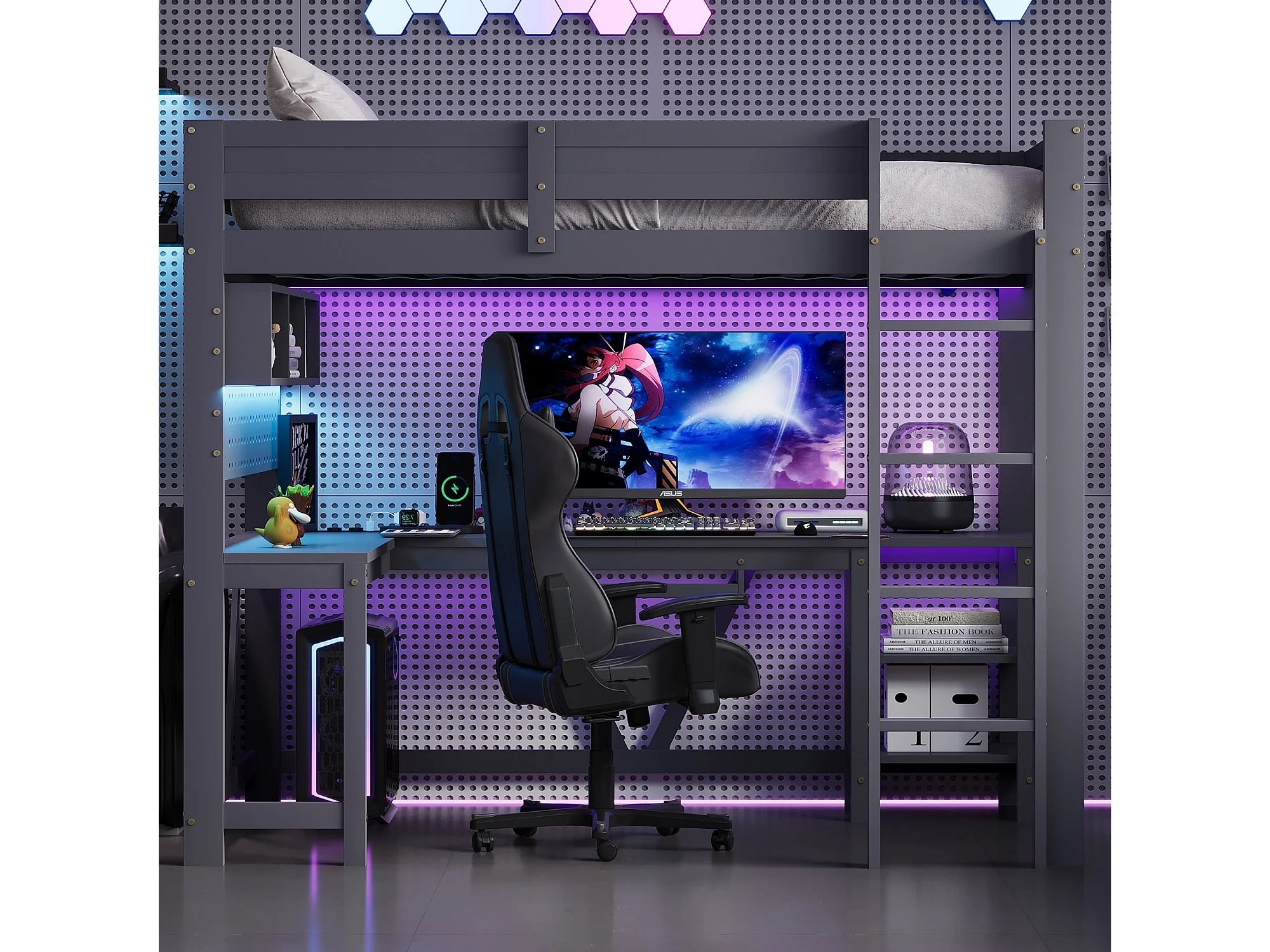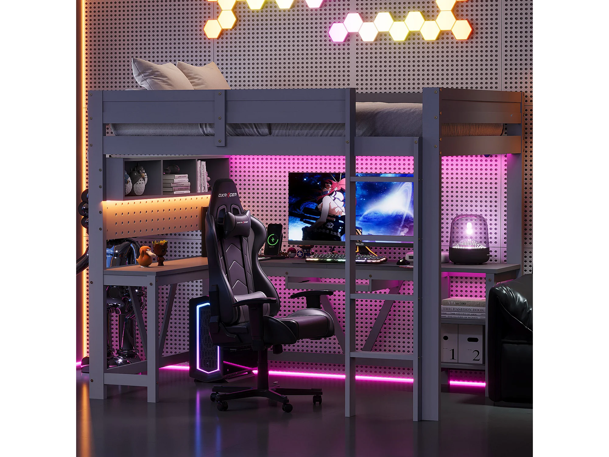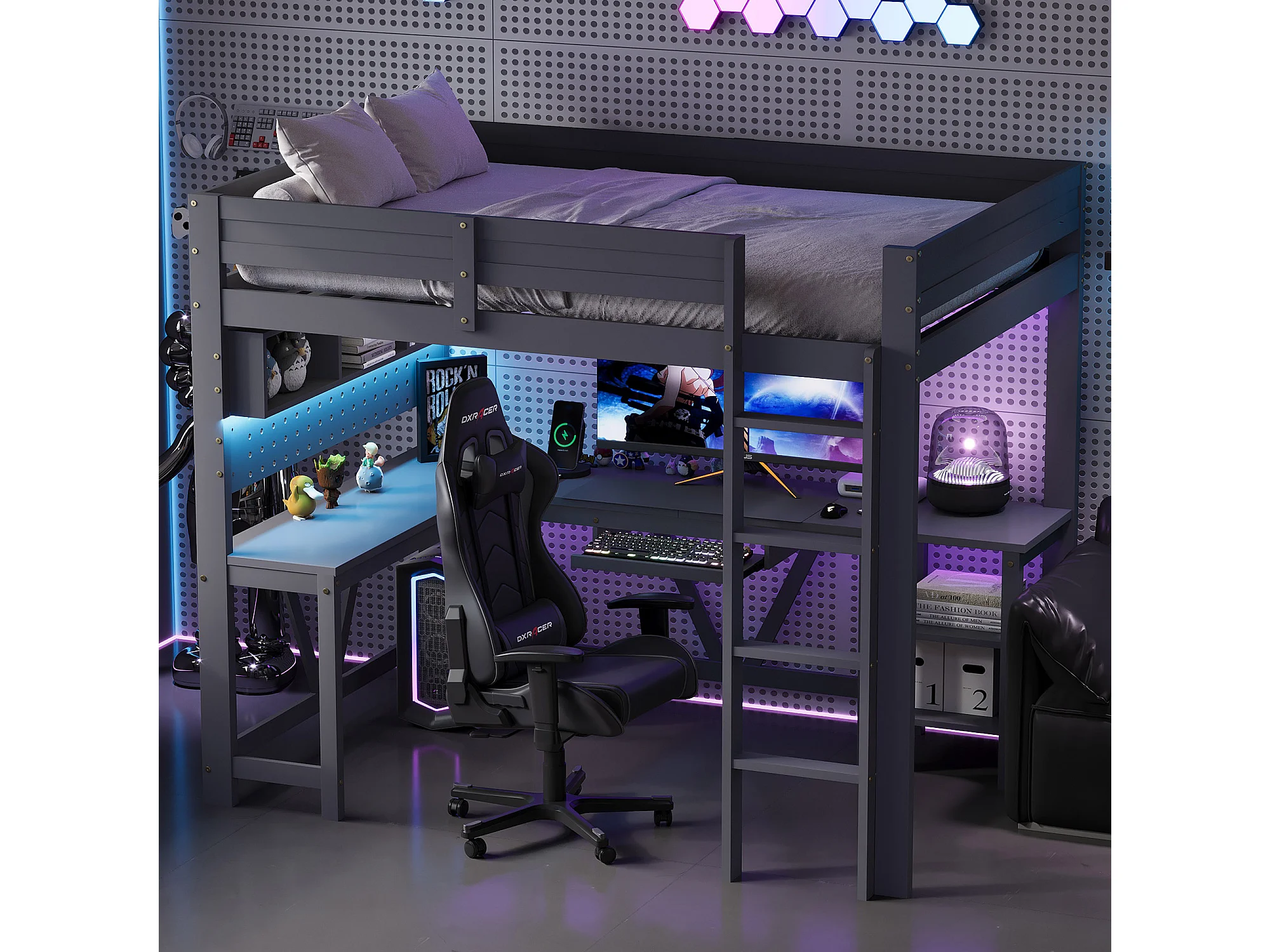 Lit mezzanine gaming en bois pour enfant - 90 x 200 cm - avec bureau + étagère de rangement + Leds - MDF + bois - gris