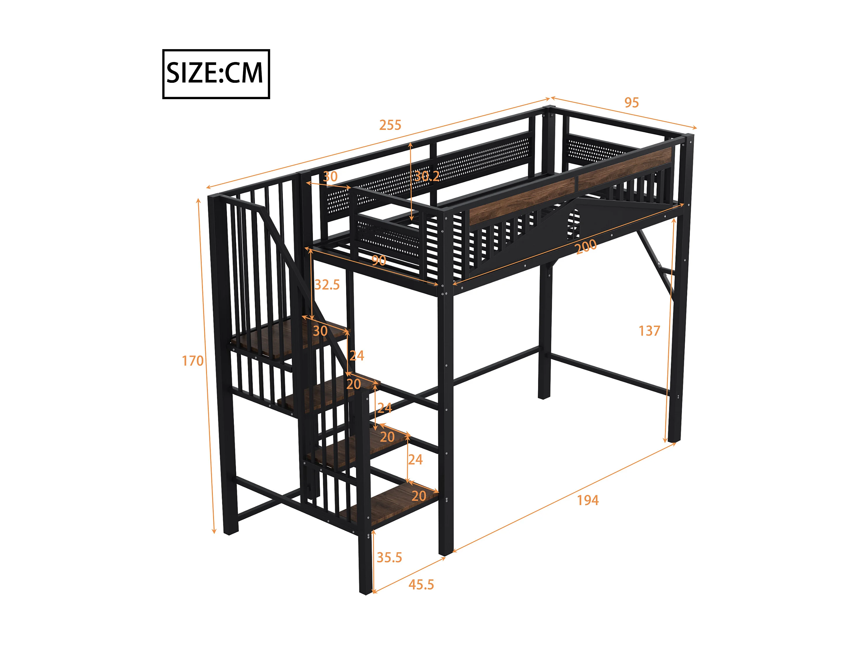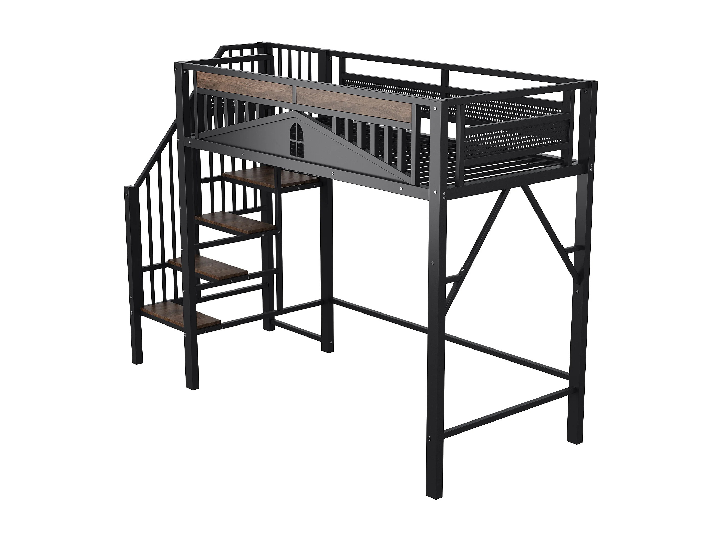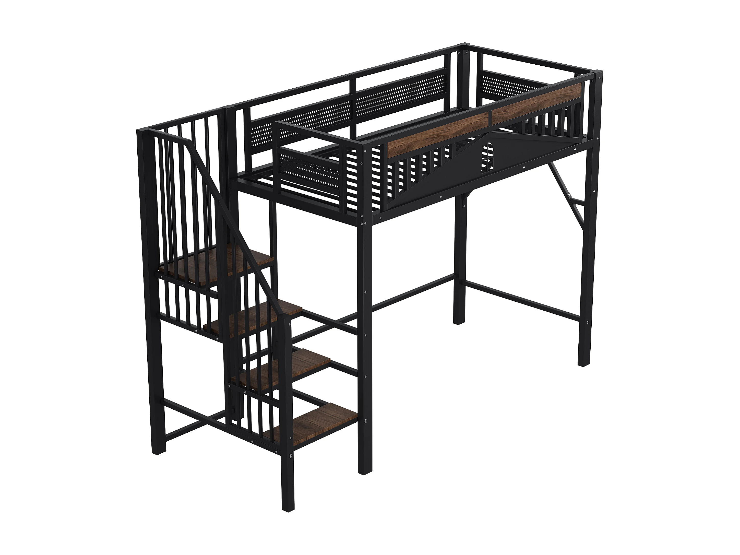 Lit mezzanine noir et bois foncé 90x200cm avec barrières de sécurité et escalier, métal + MDF (sans matelas)