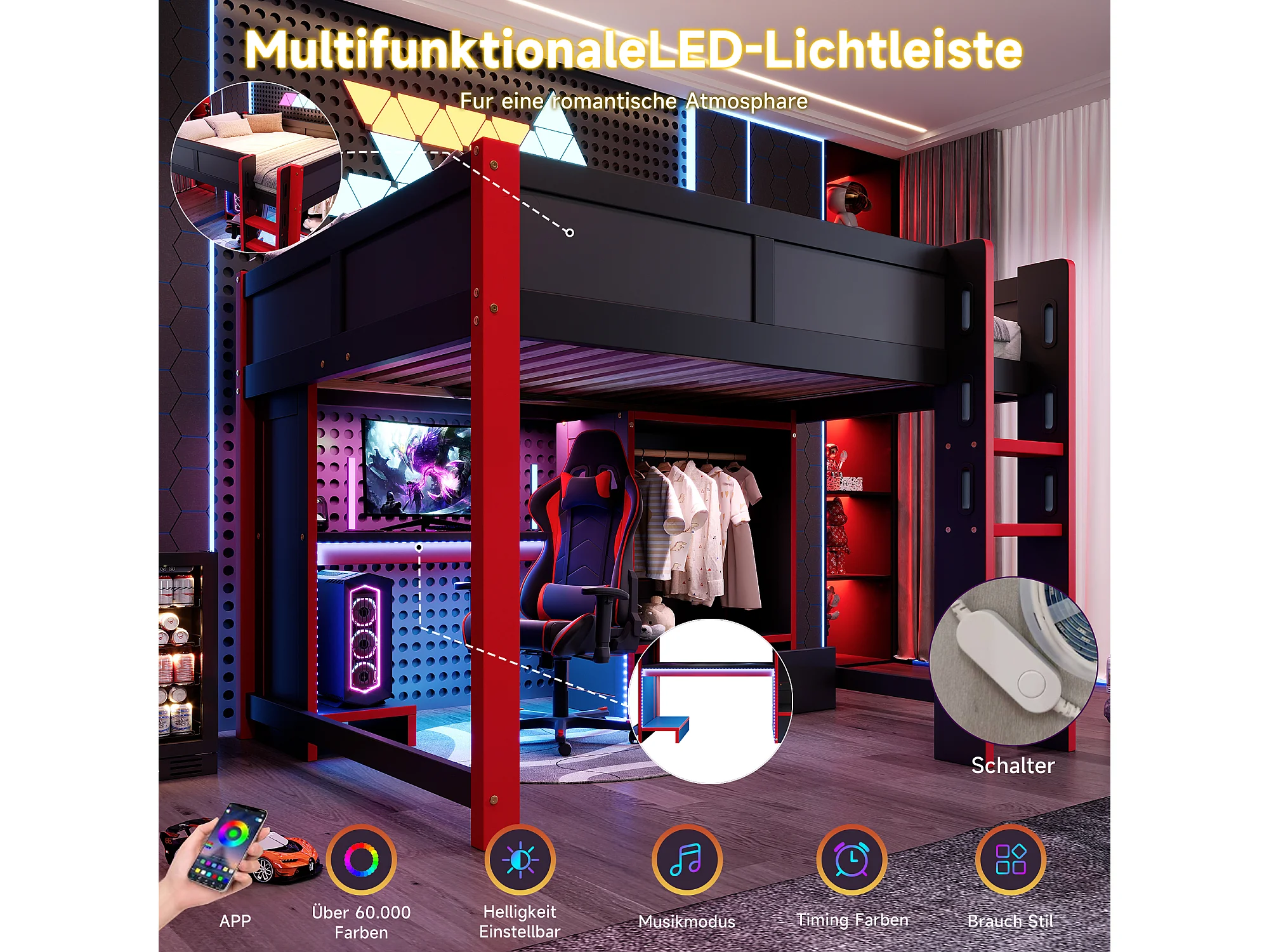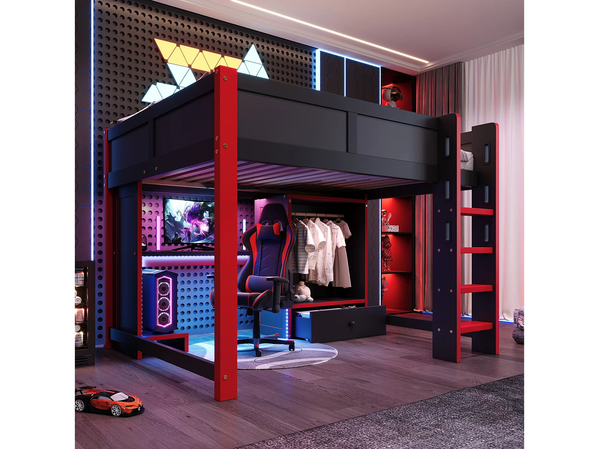 Lit mezzanine pour enfant - 140 x 200 cm - avec Leds + bureau + échelle + armoire + tiroir - bois - noir + rouge