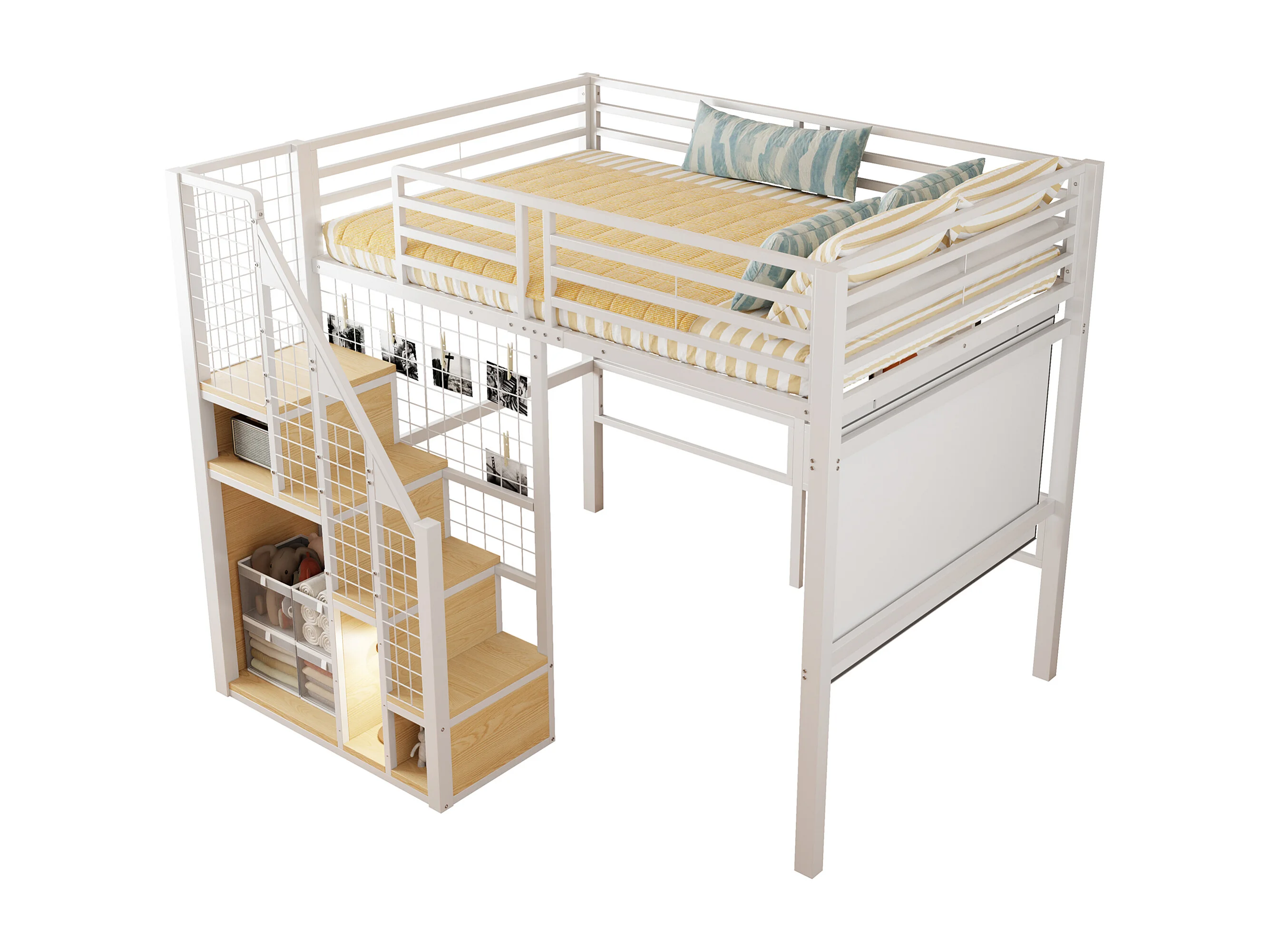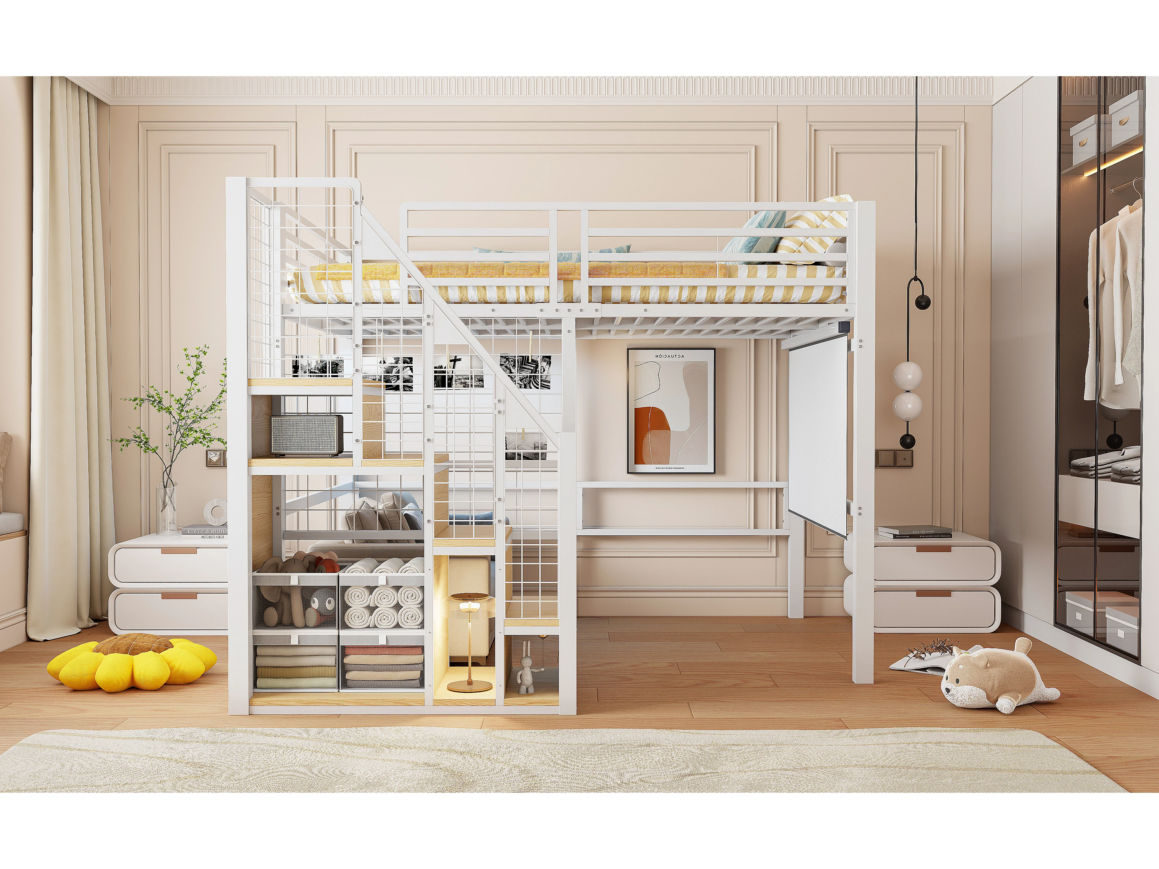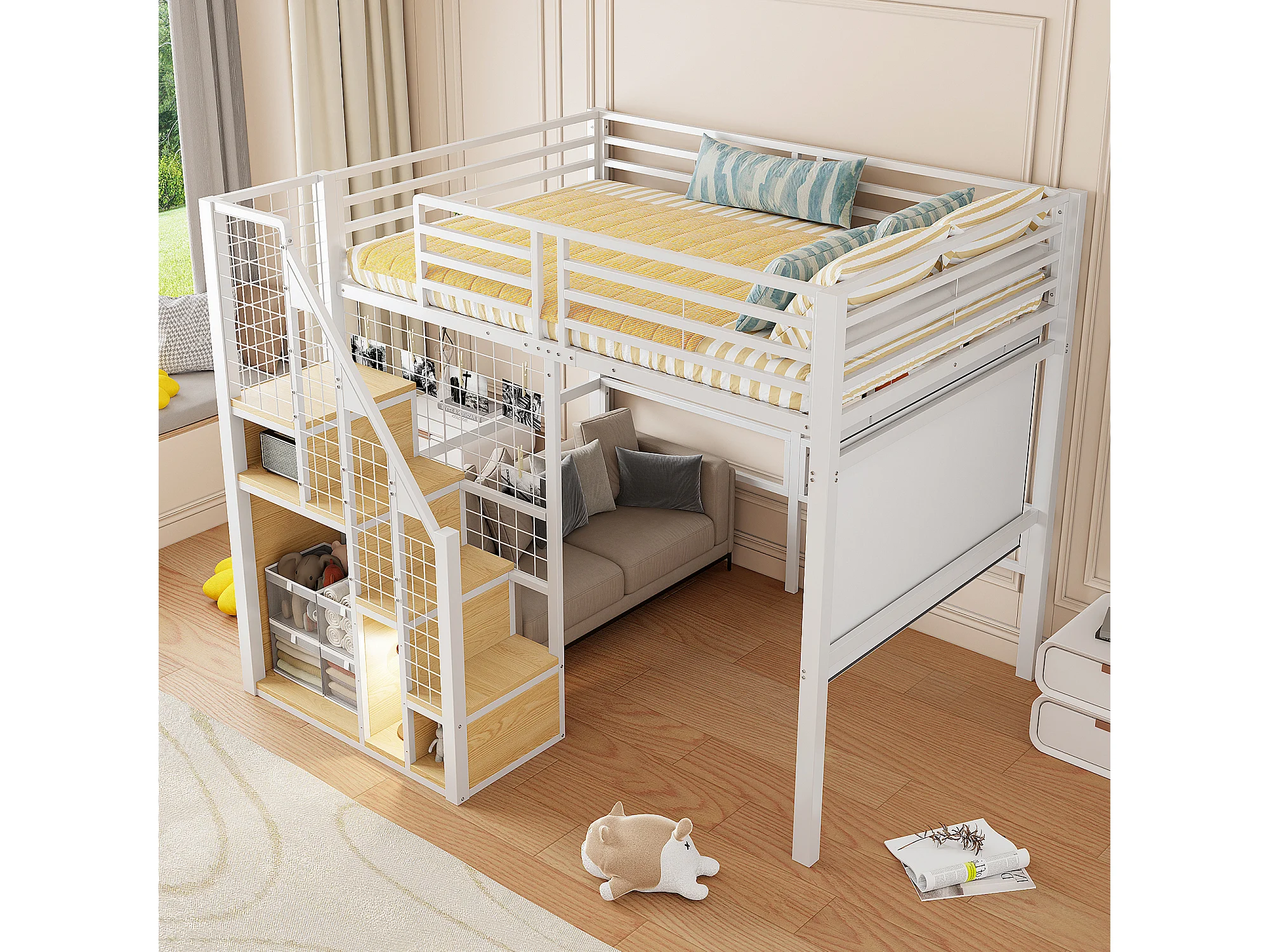 Lit mezzanine pour enfant - 140 x 200 cm - structure en fer - avec escalier de rangement et de sécurité - métal - blanc