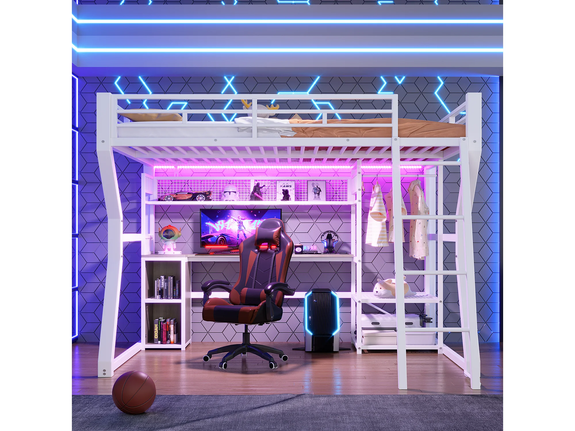 Lit mezzanine pour enfant - 140 x 200 cm - structure en fer - avec Leds + bureau + rangements + étagères - MDF + métal - blanc