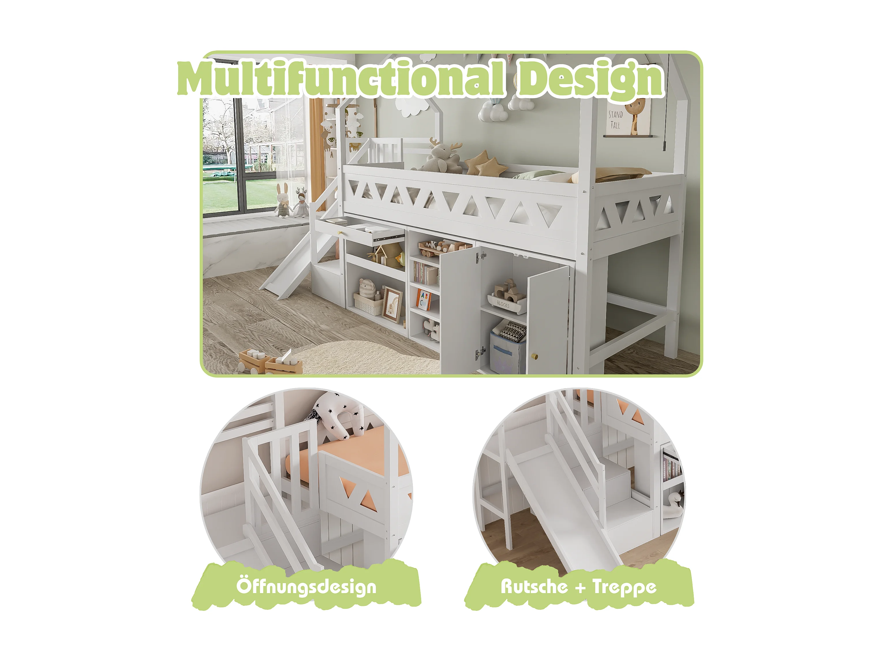 Lit mezzanine pour enfant - 90 x 200 cm - avec toboggan + escalier + tiroir + étagère + casier - bois - blanc