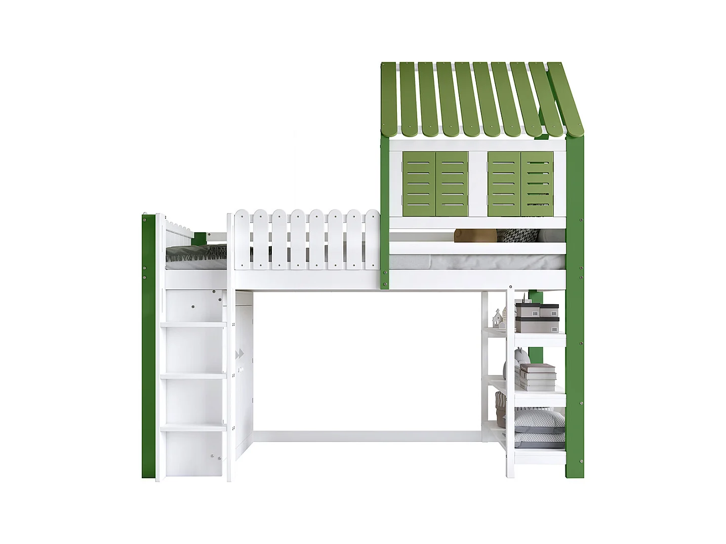 Lit mezzanine pour enfant 90x200, avec barrières de sécurité, toit, fenêtre, escalier, blanc + vert