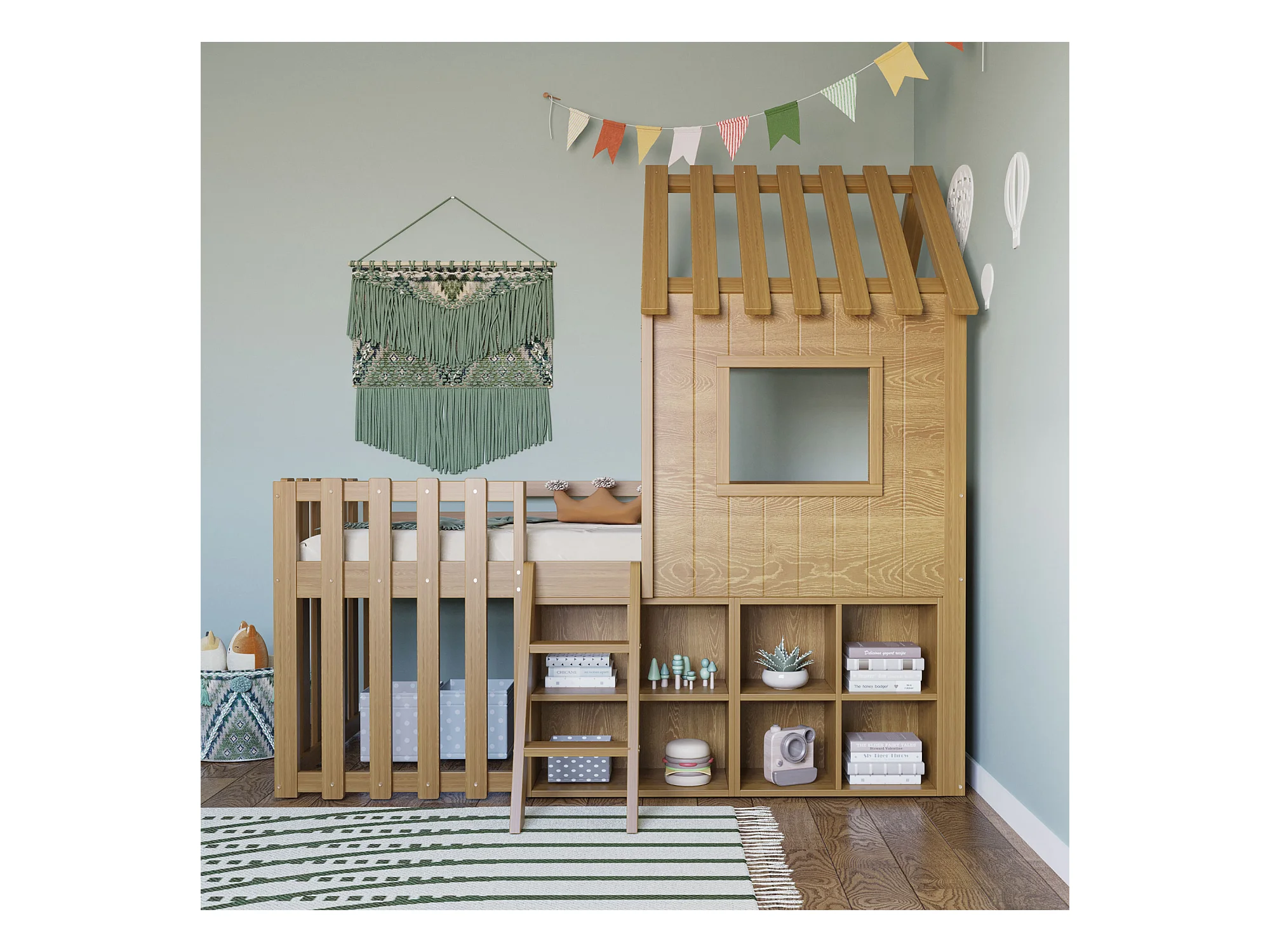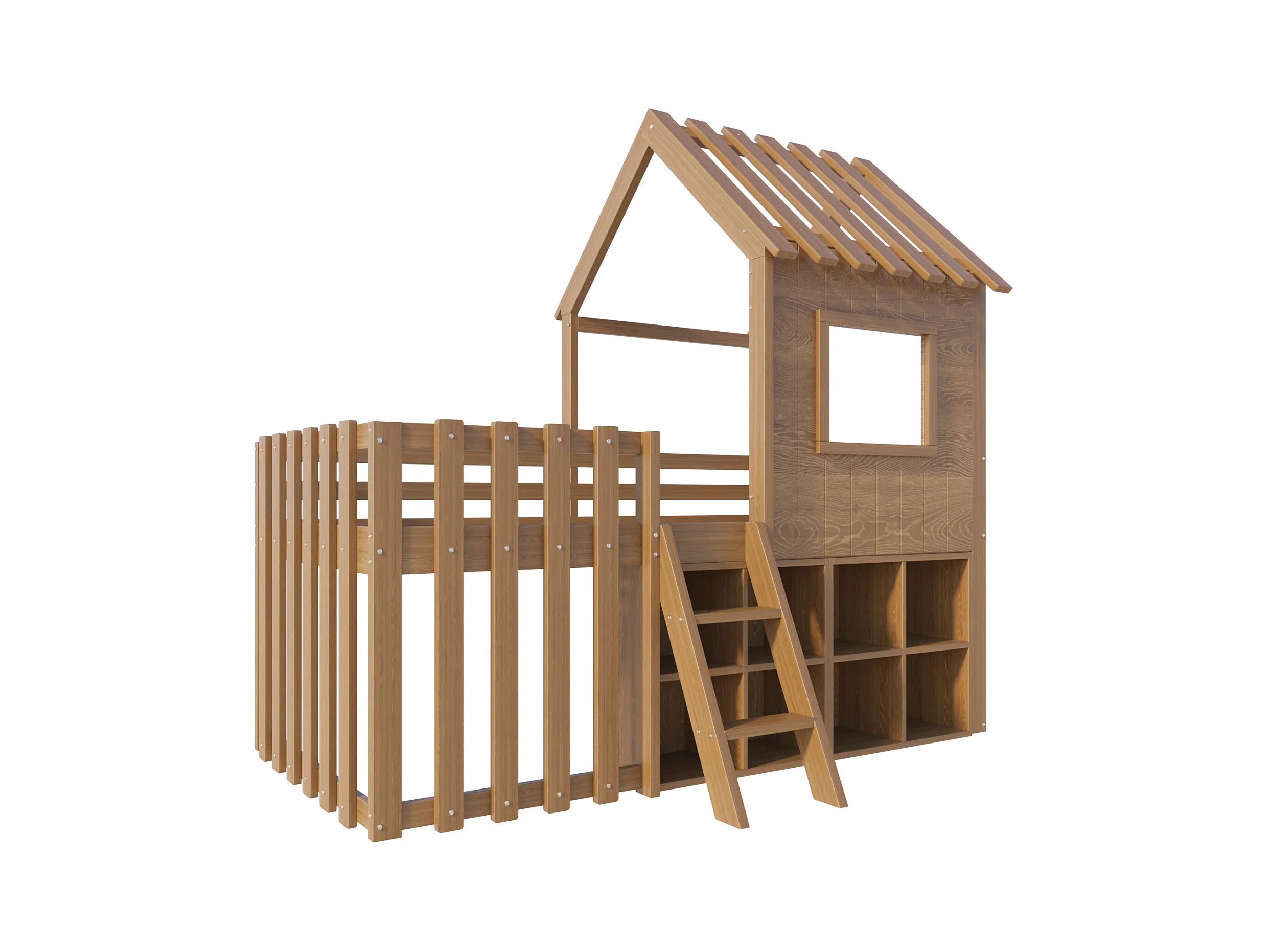 Lit mezzanine pour enfant 90x200, avec toit, fenêtres, espace de rangement et échelle, bois massif, couleur bois naturel (204.5x95x201 cm)