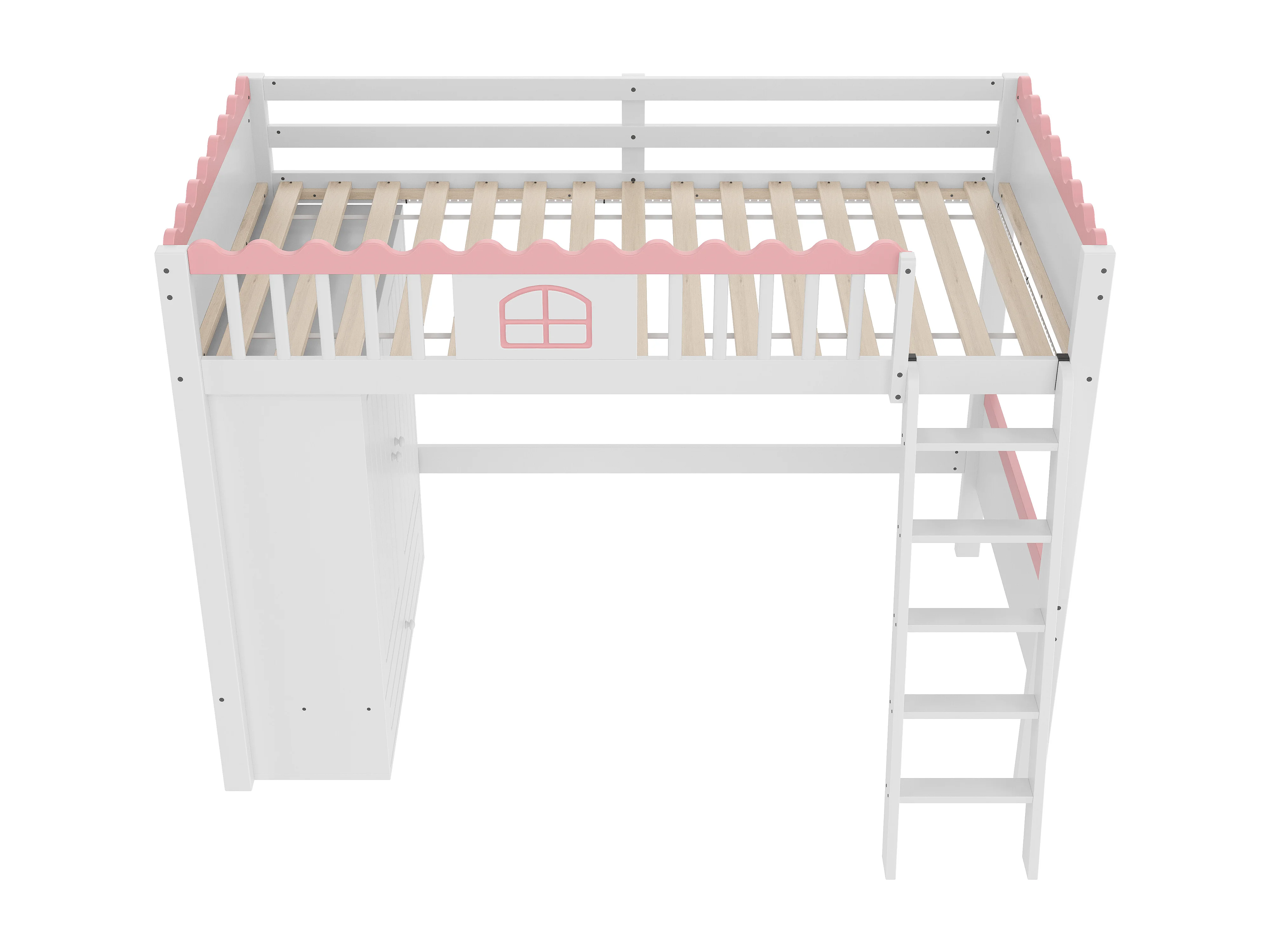 Lit mezzanine simple 90x200cm, lit enfant avec armoire, tiroir et LED, blanc et rose