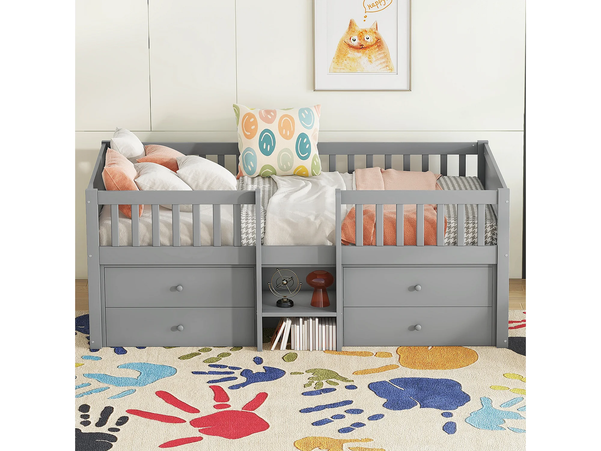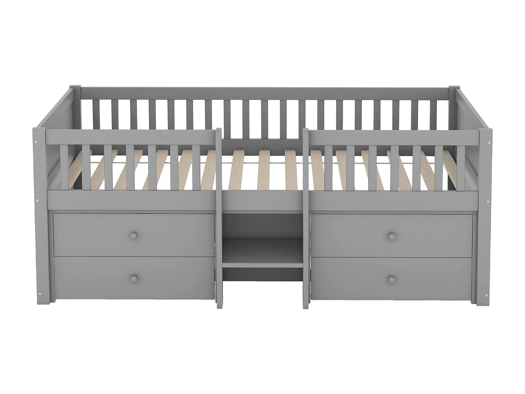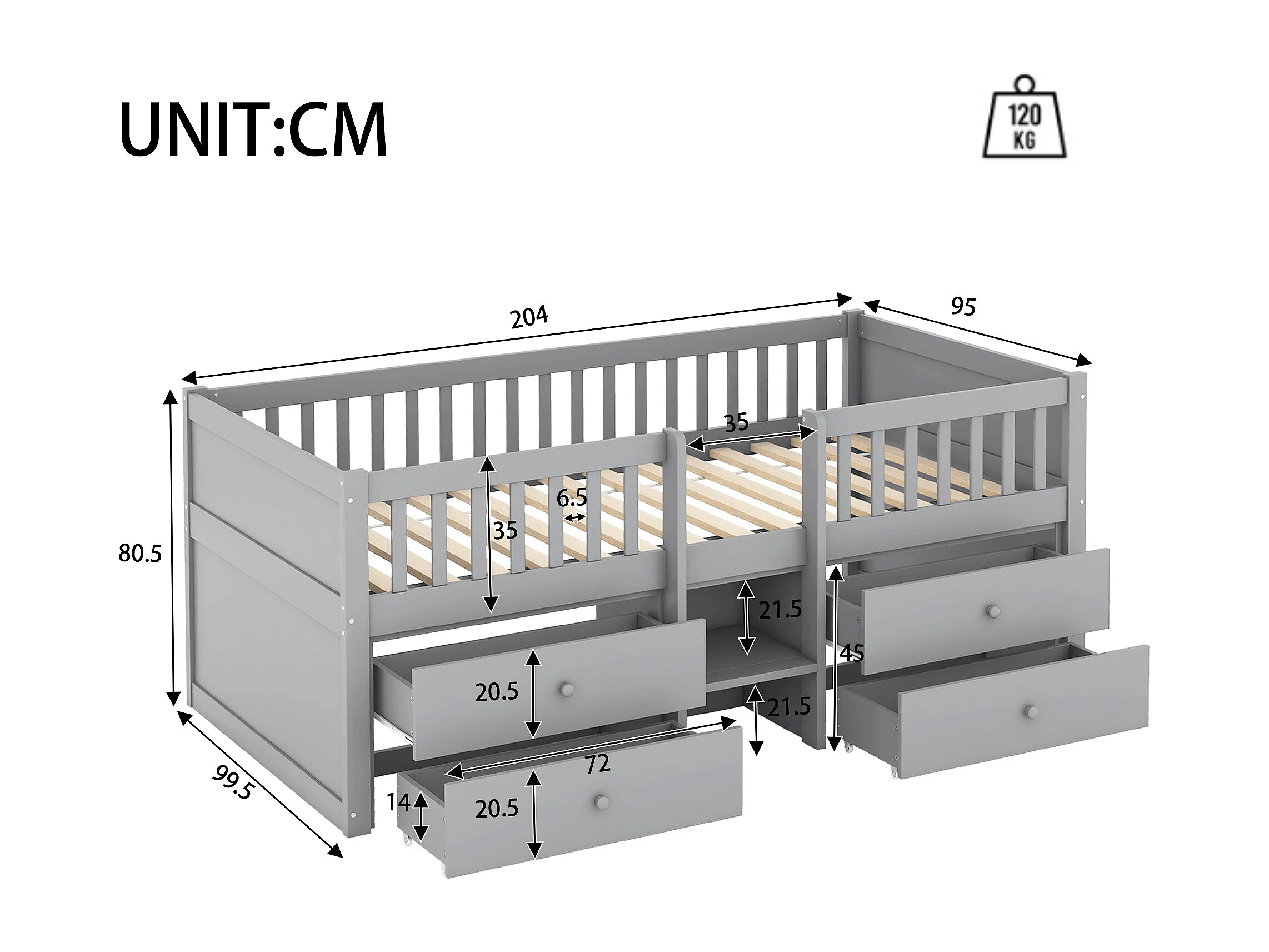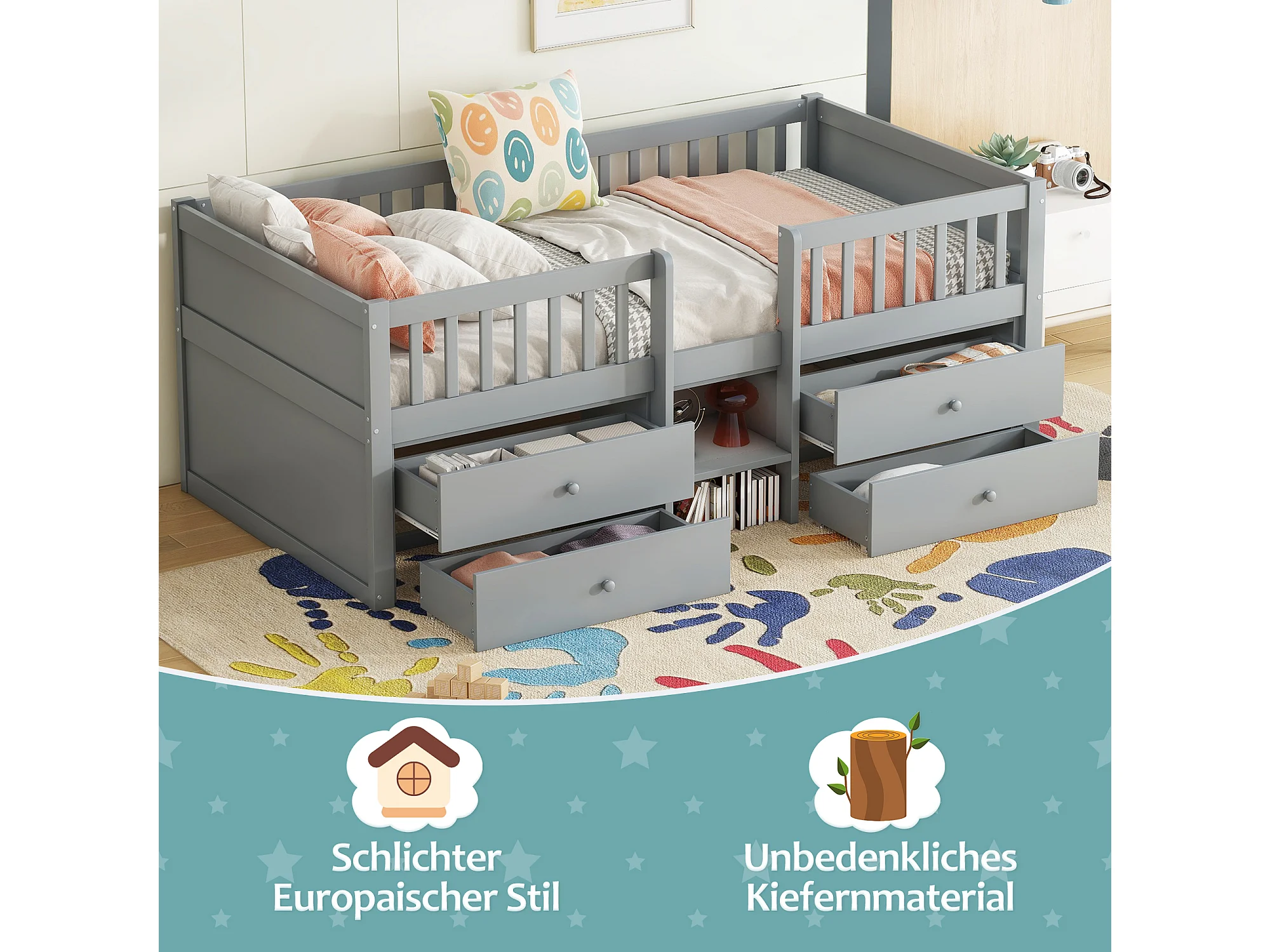 Lit enfant 90 x 200 cm avec 4 tiroirs - Bois de pin + MDF - Sommier à lattes - Gris (sans matelas)