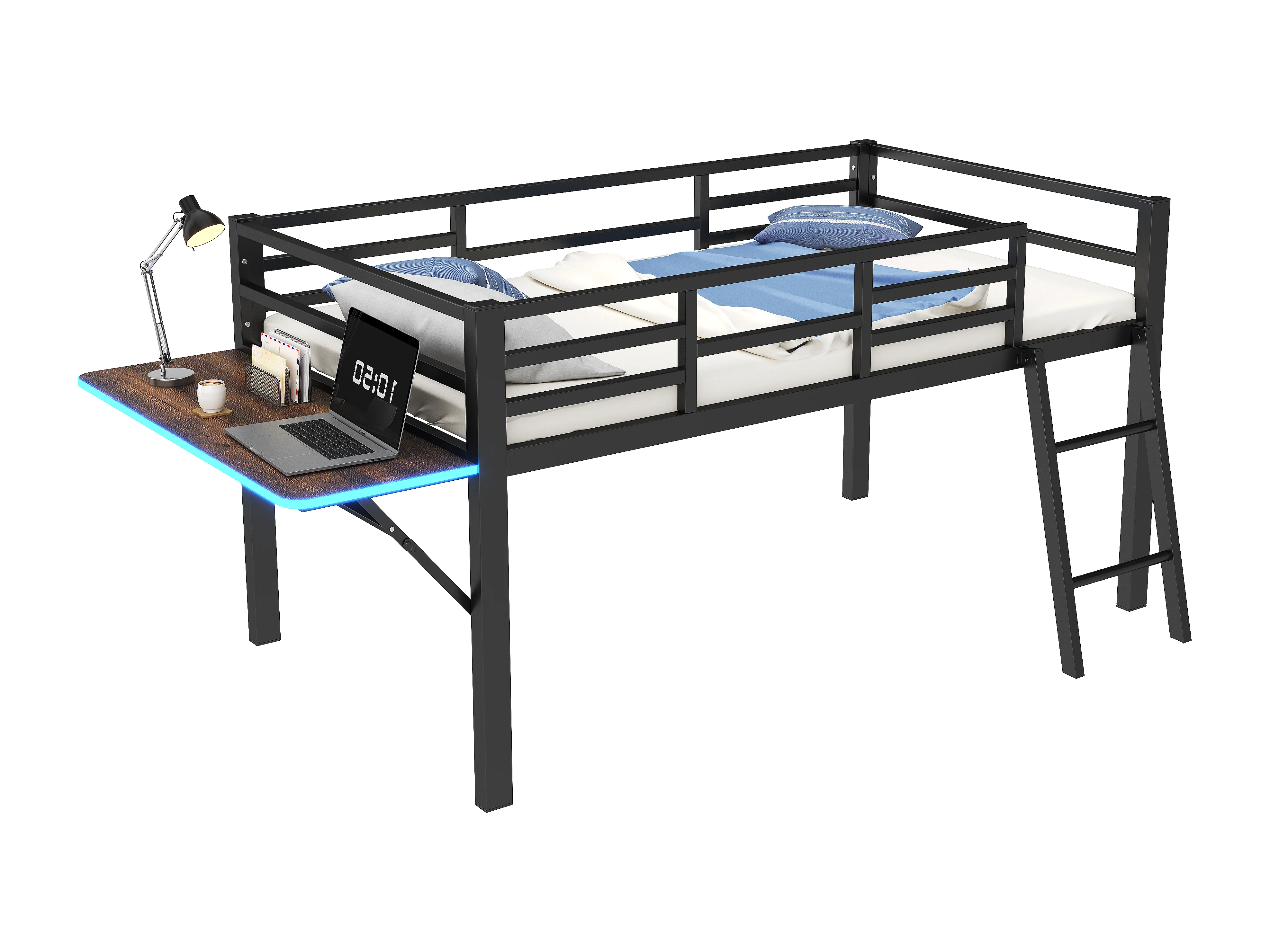 Lit mi-hauteur 90 x 200 cm avec bureau et échelle - Métal - LEDs - Sommier à lattes - Noir (Sans matelas)