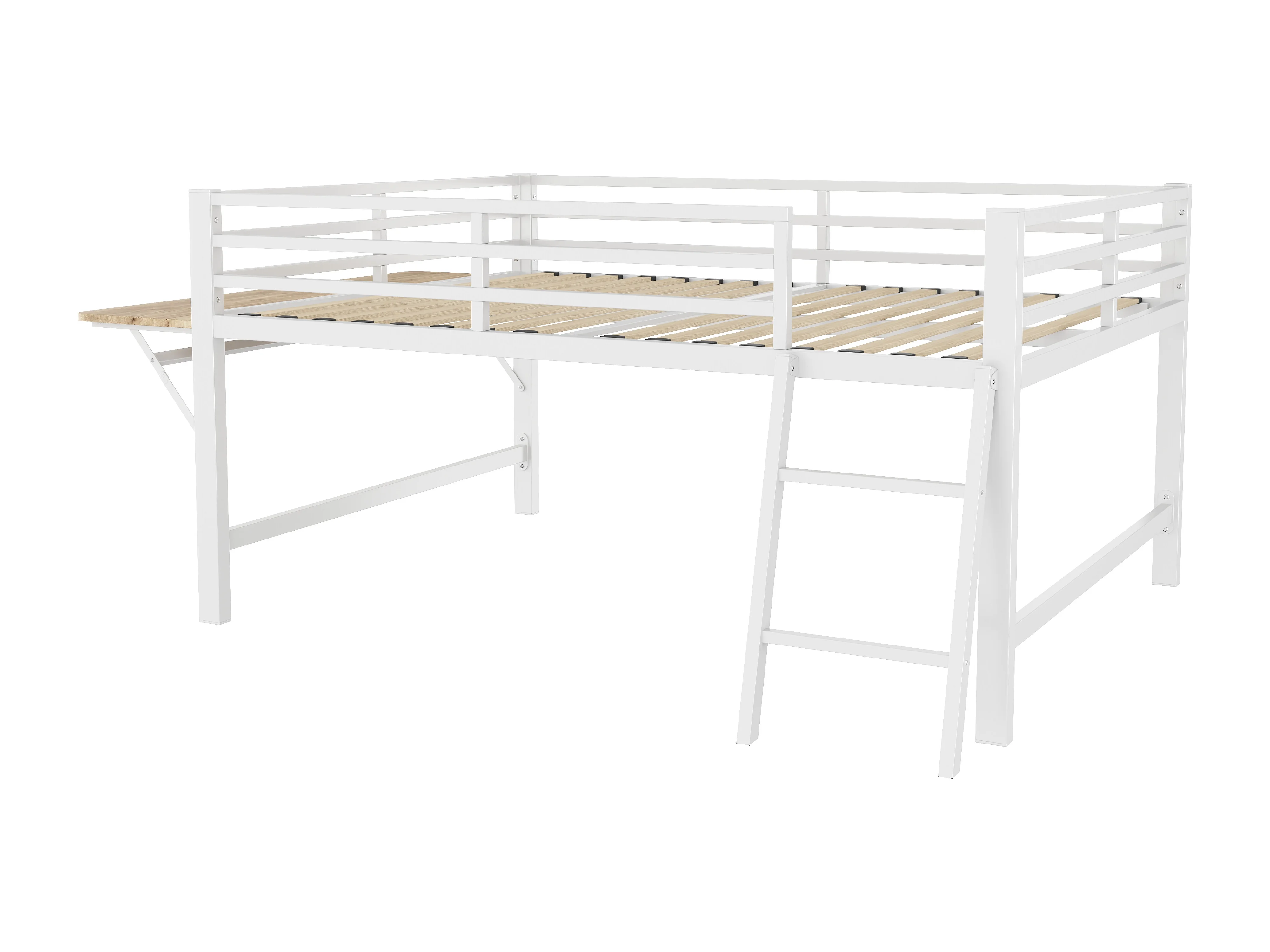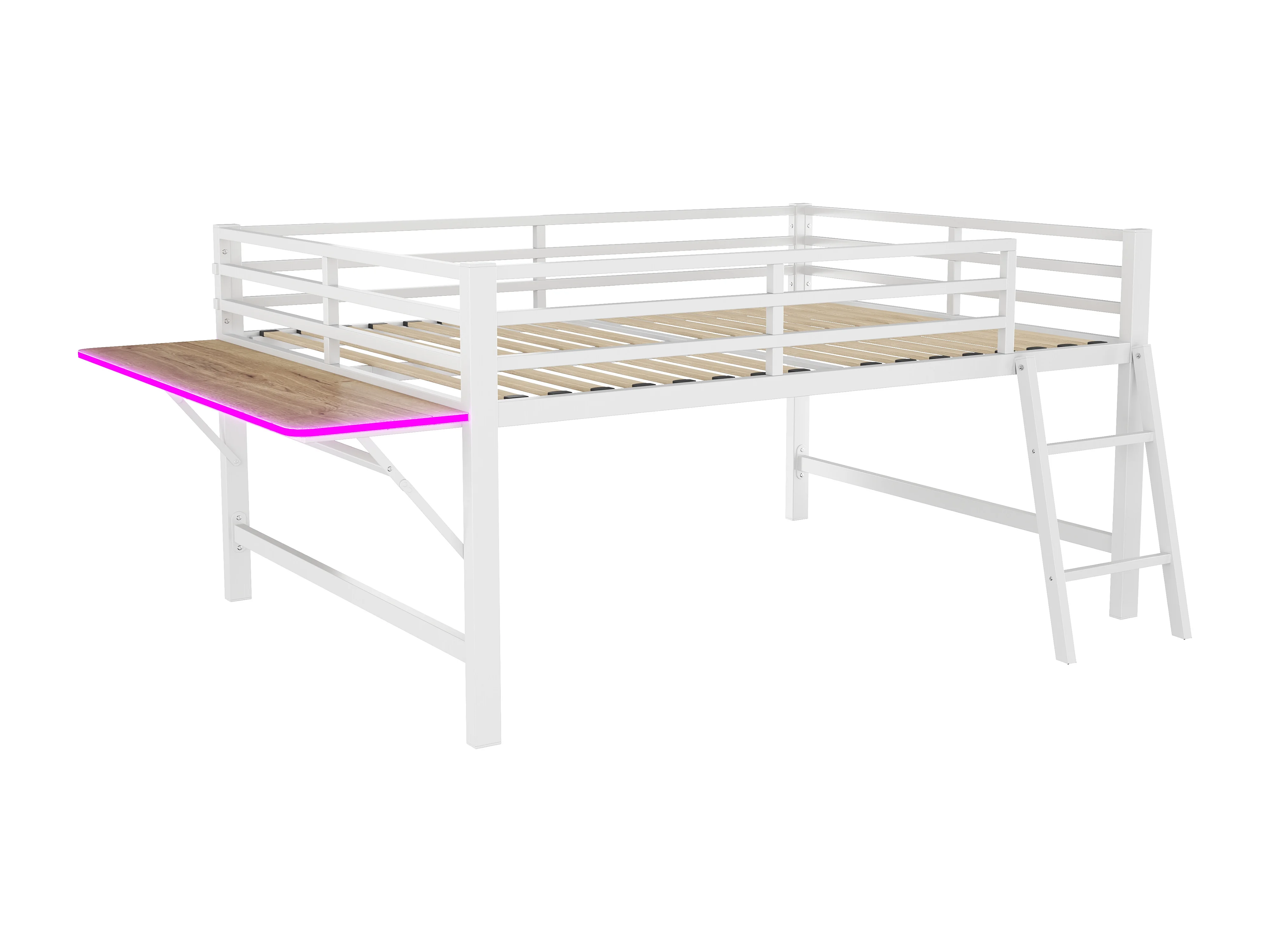 Lit mi hauteur en métal - 140 x 200 cm - avec barrière de sécurité + échelle + bureau + Leds - blanc