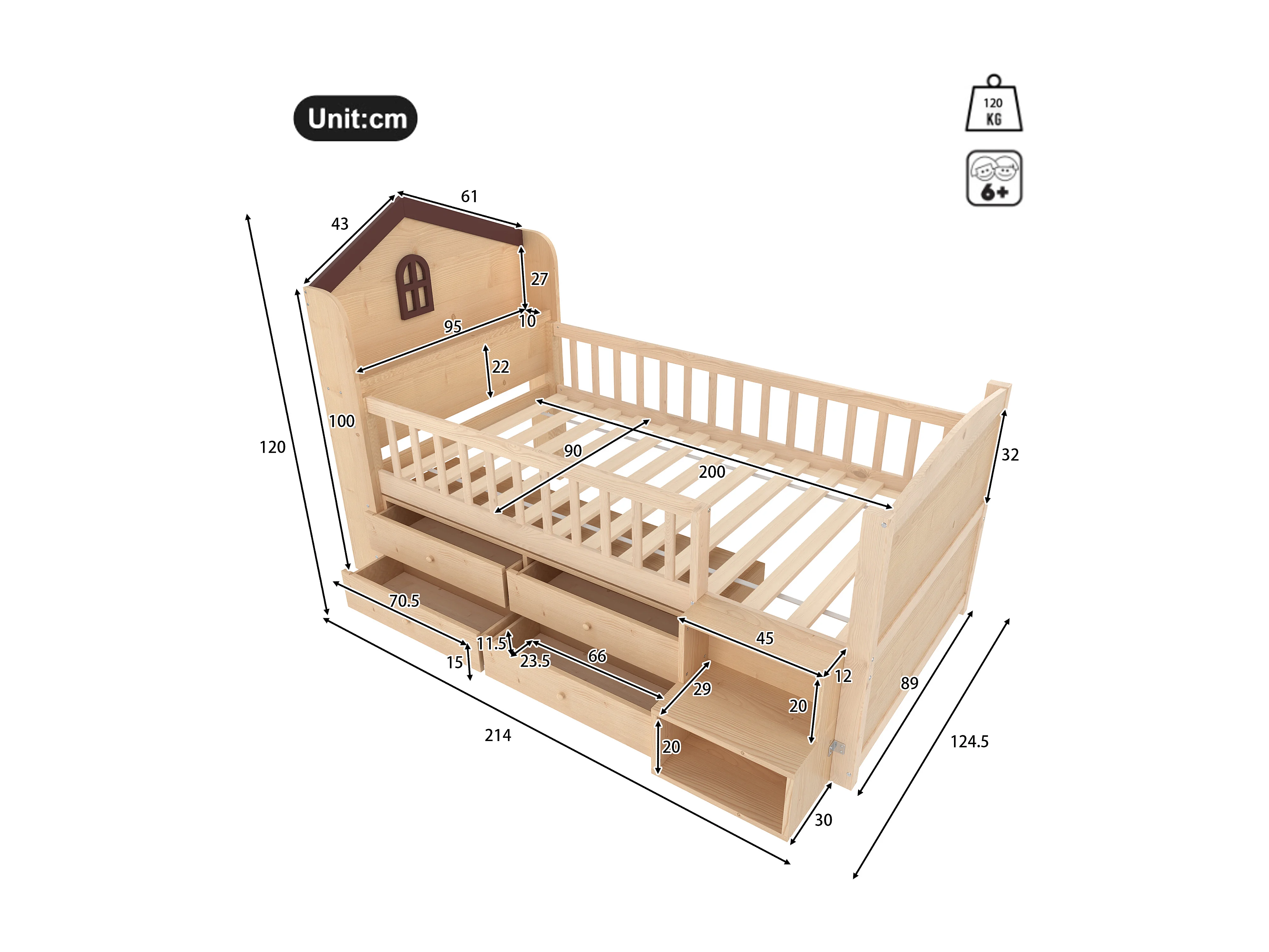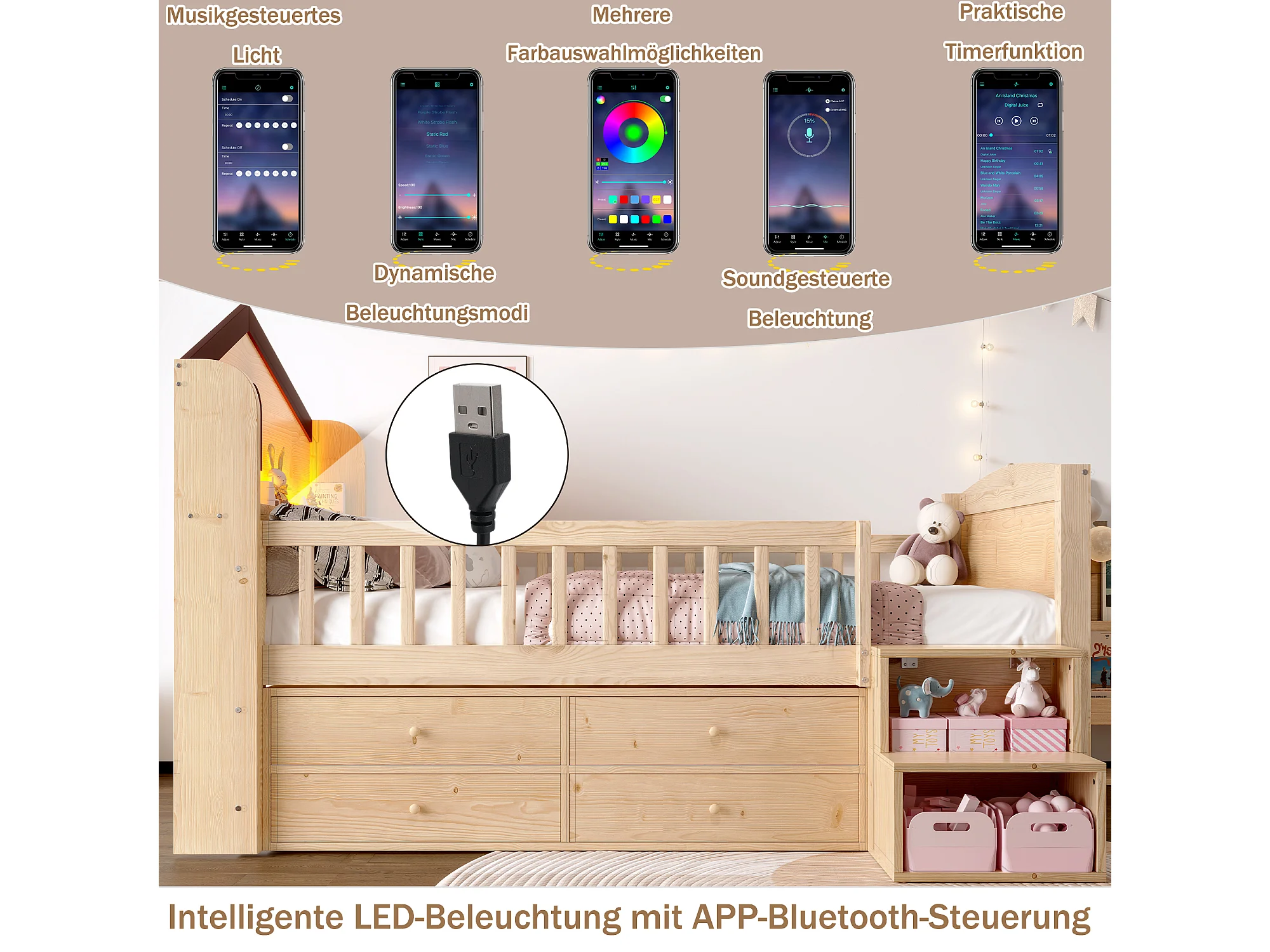 Lit mi-hauteur pour enfant - 90 x 200 cm - forme maison - avec fenêtre + 4 tiroirs + Leds - bois - naturel