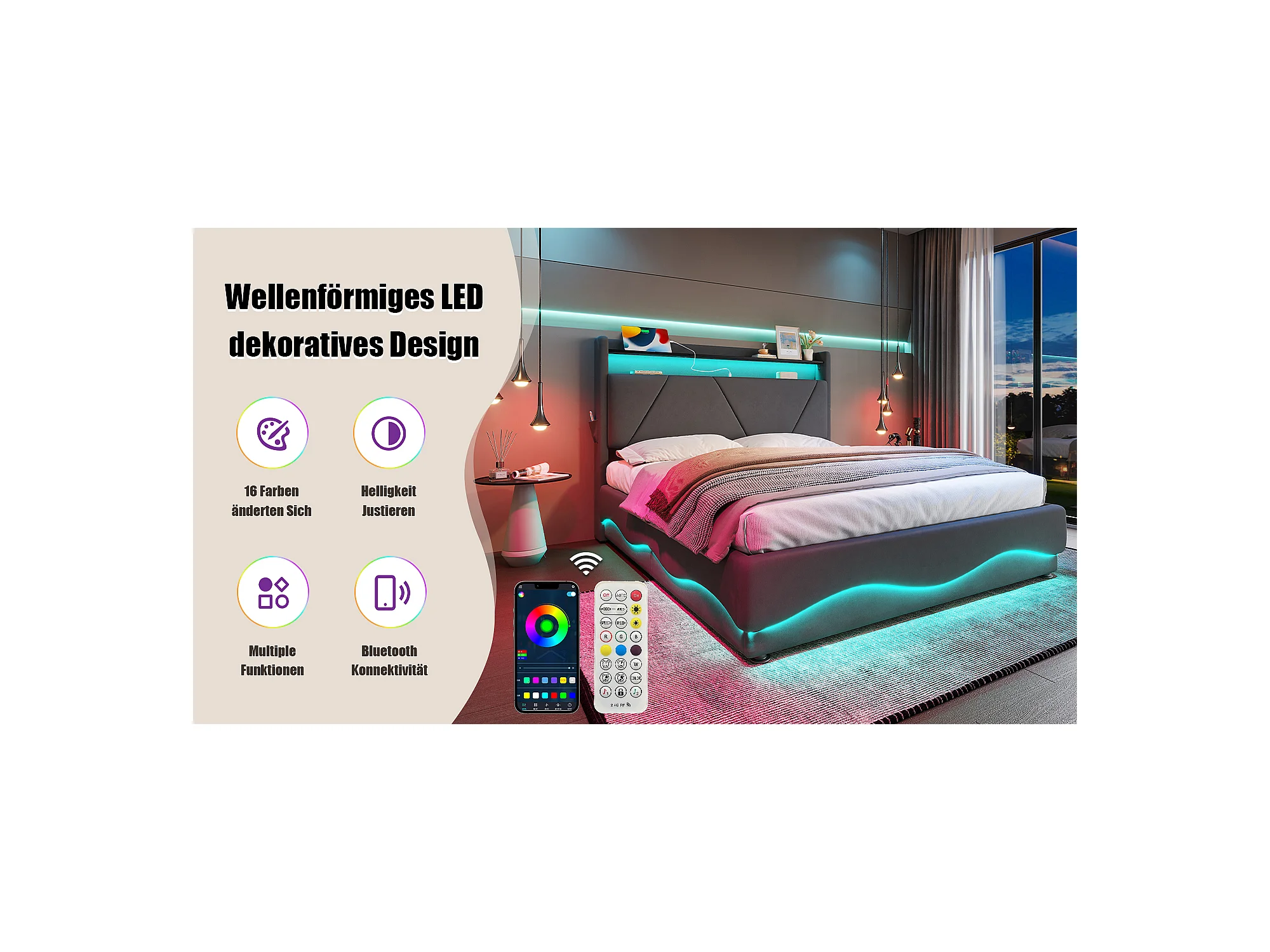 Lit moderne avec tête de lit LED, velours gris, 160x200 cm, coffre de rangement et USB (169x222x170 cm)