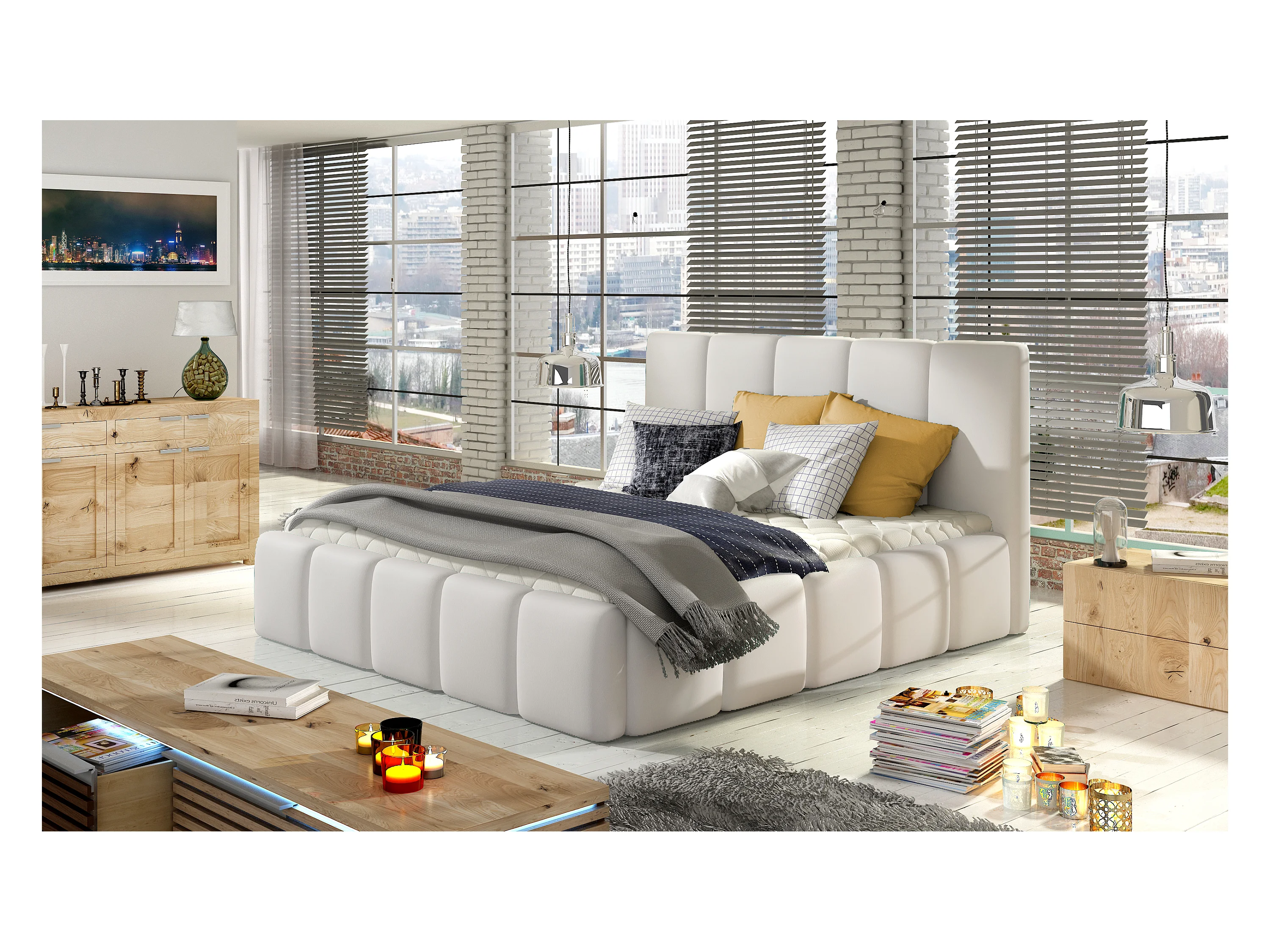 Lit adulte avec coffre de rangement Vika – Simili cuir capitonné-Blanc-140x200