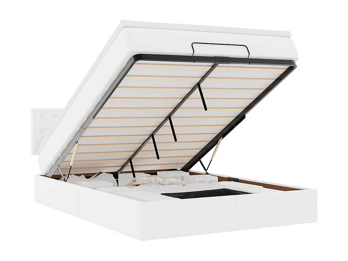 Lit double 140x200, avec rangement hydraulique, tête de lit avec ports USB et éclairage LED, PU blanc (210x170x101 cm)