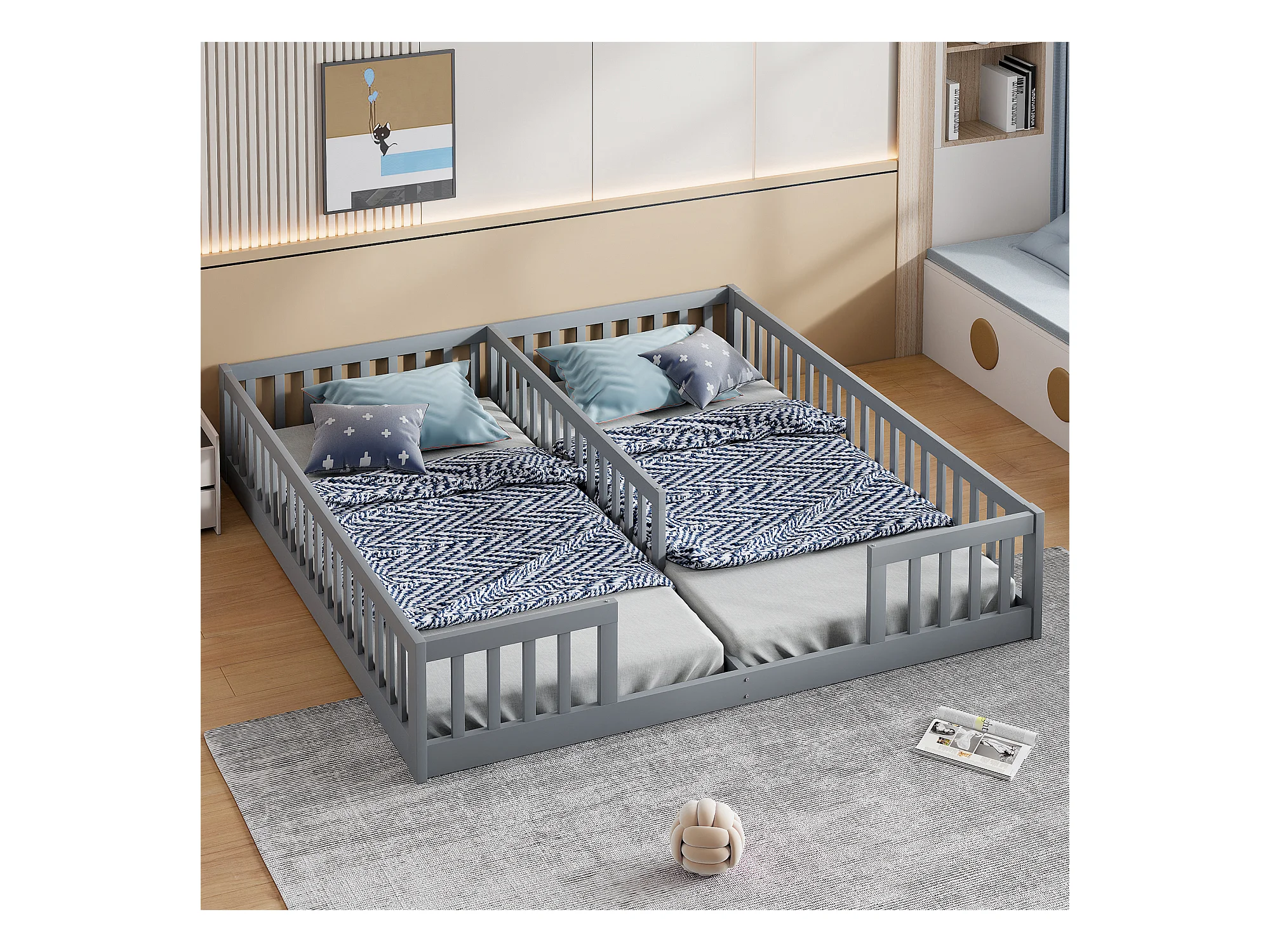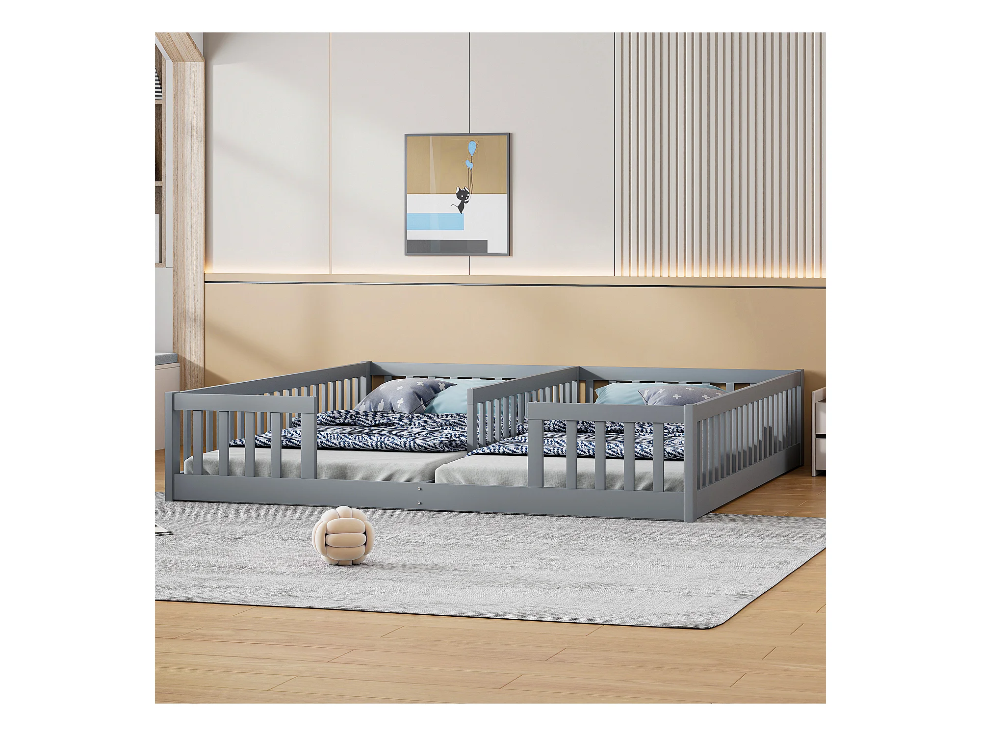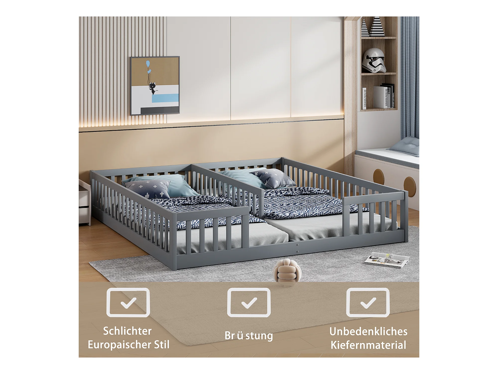 Lit panel 90 x 200 cm, lit enfant avec grille, sans sommier (sans matelas), pour familles avec 2 enfants, pin, style minimaliste, gris (204x187x40 cm)