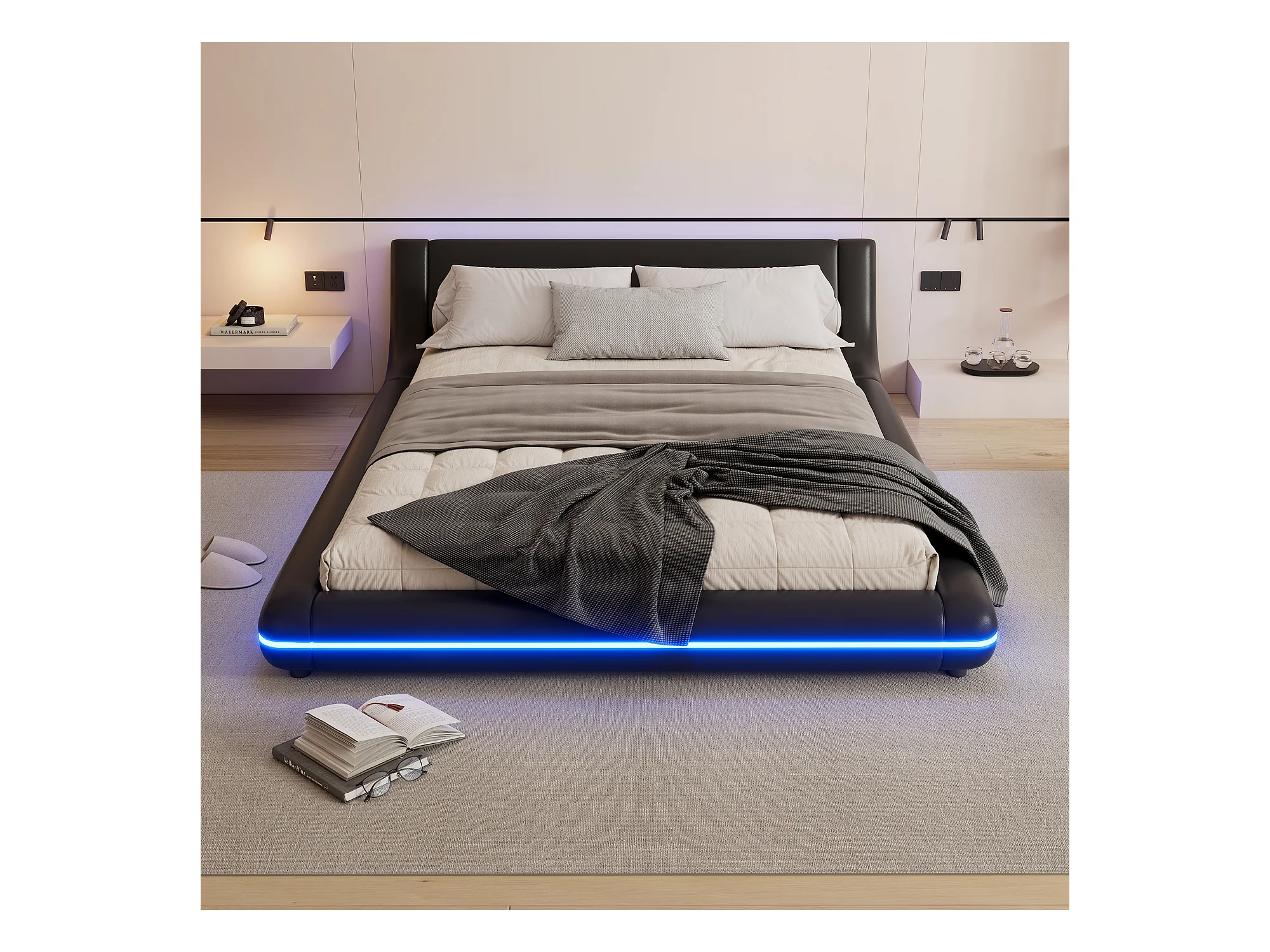 Lit bas 140x200 cm en PU noir avec éclairage LED ambiant, télécommande 24 touches, design minimaliste et pratique pour chambre contemporaine