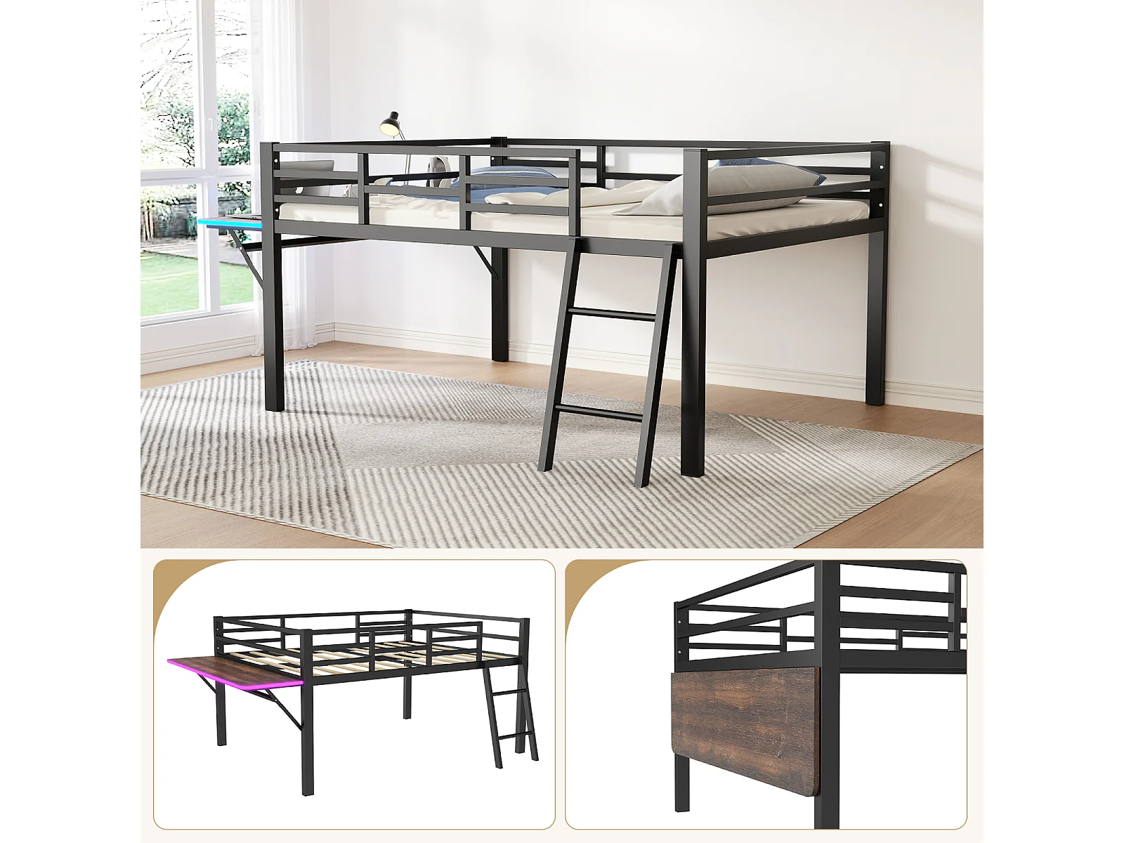 Lit plat 140x200 cm en métal noir avec barrières, échelle, bureau et bande LED télécommandée – lit moderne sans matelas