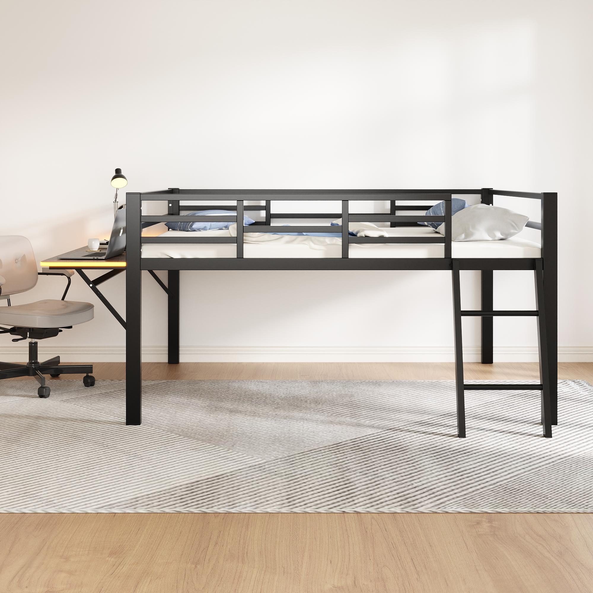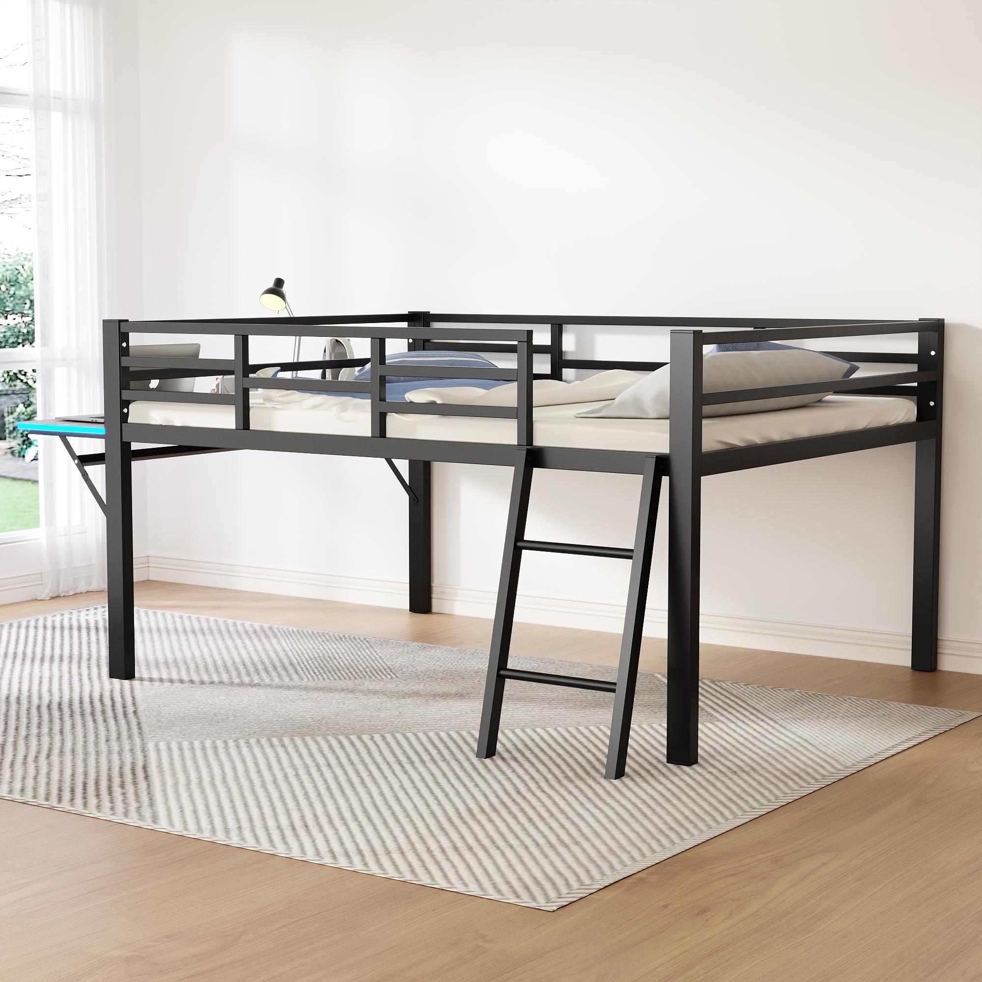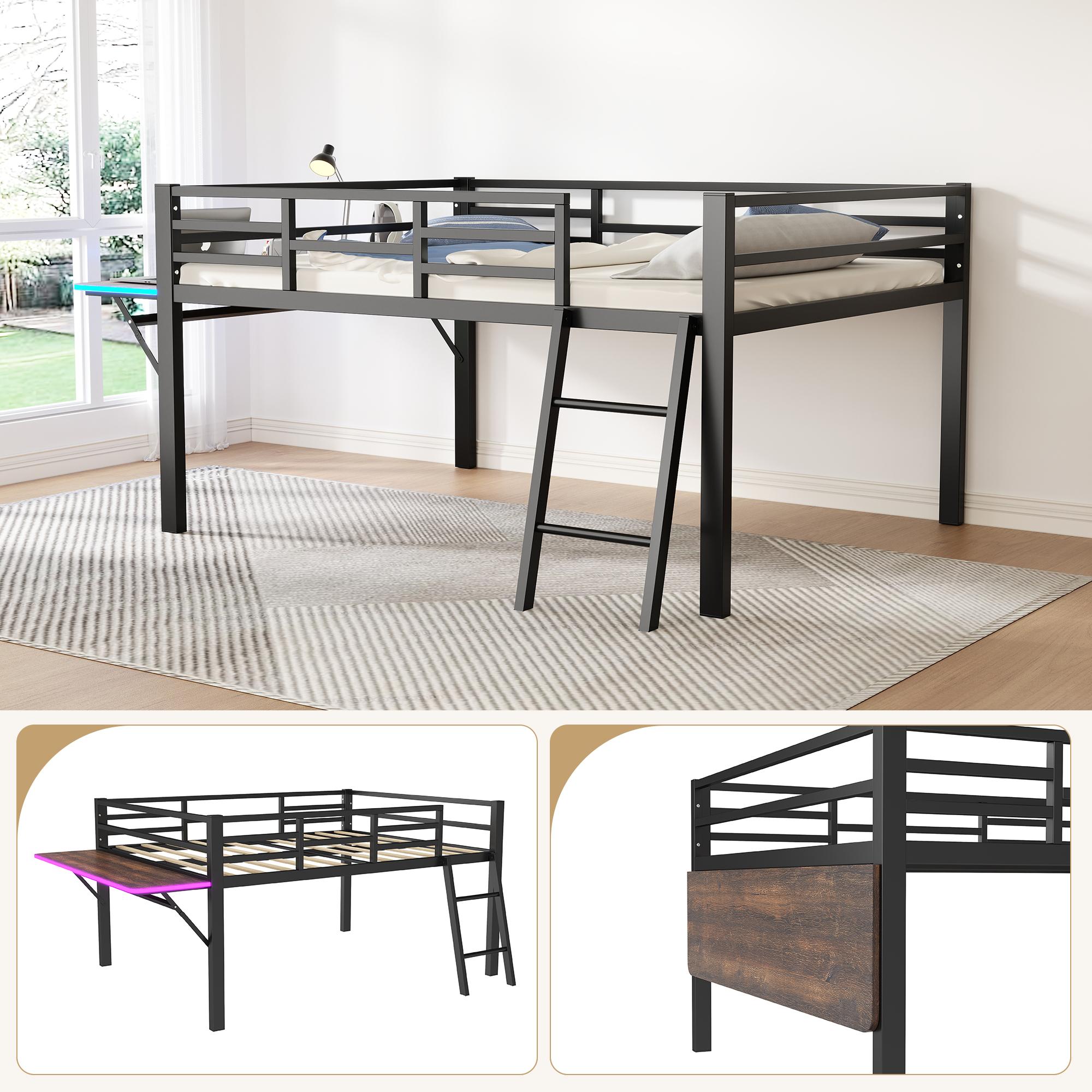 Lit plat, 140x200 cm, lit en métal avec bureau, sans matelas, garde-corps, échelle, bande LED télécommandée, noir (244x144x100 cm)