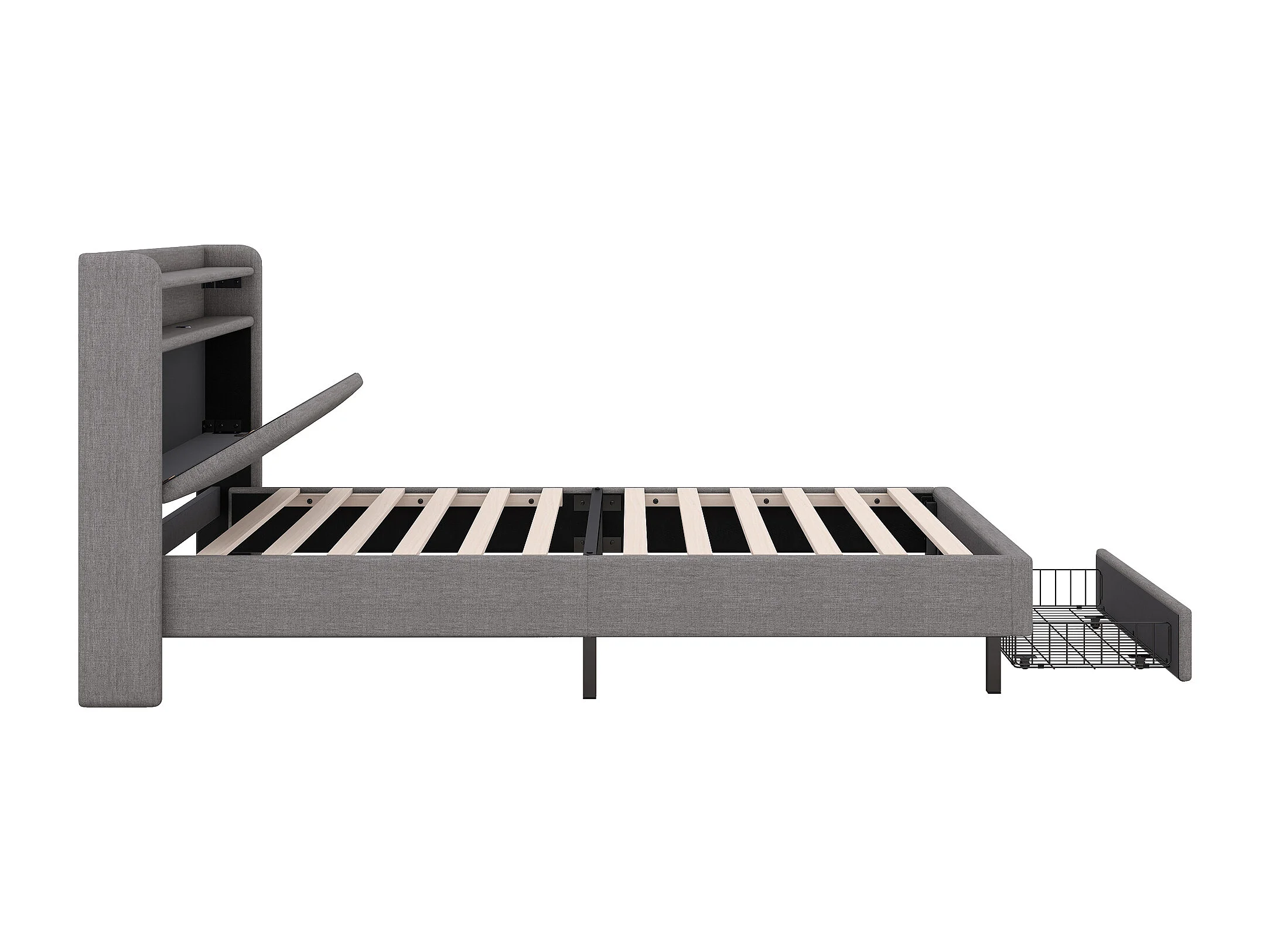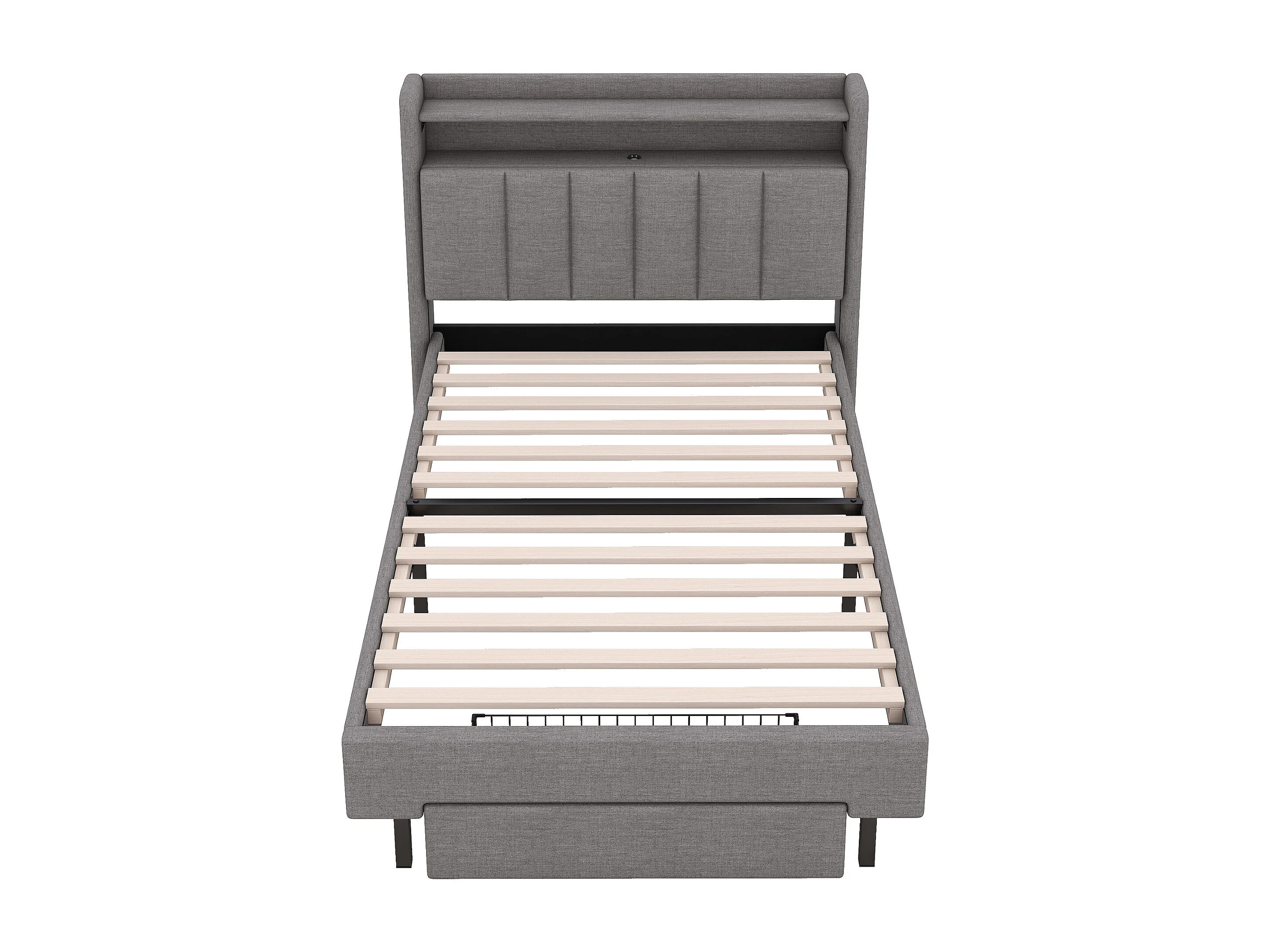 Lit enfant 90x200 cm avec tiroir, tête de lit de rangement avec LED et USB,en lin gris(sans matelas)