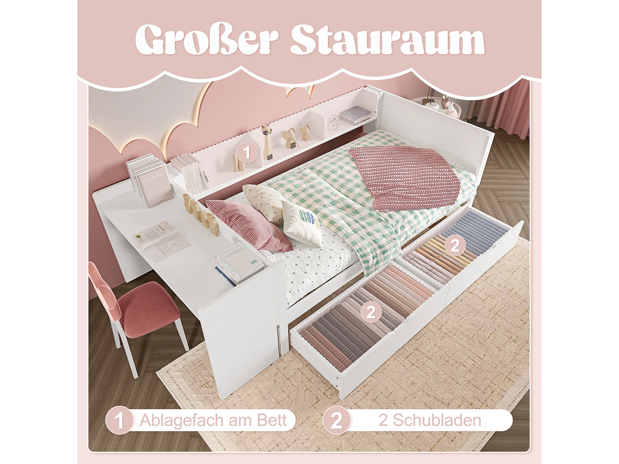 Lit plat avec bureau, tiroirs et étagères, bois de pin, blanc (90x200 cm)