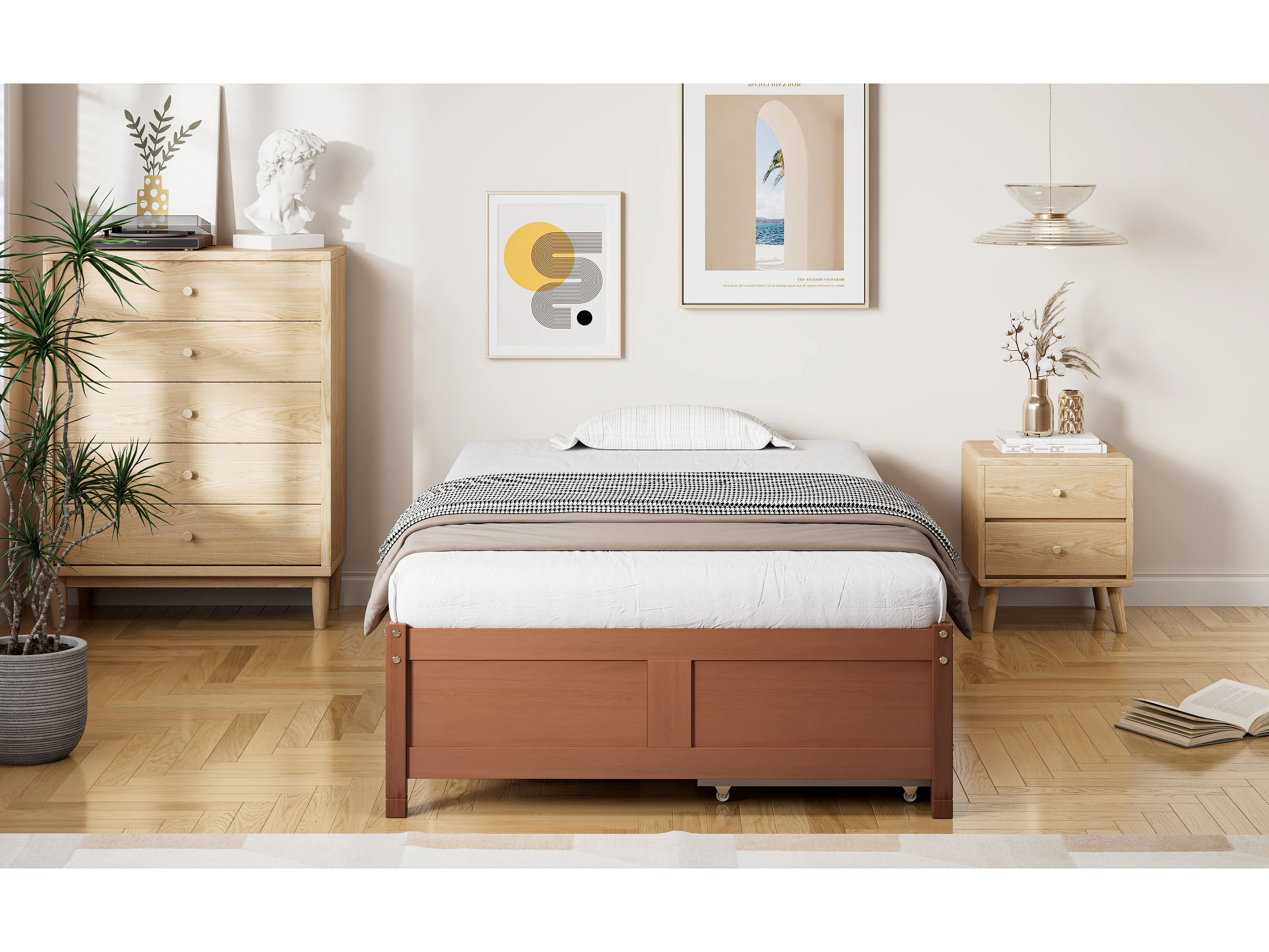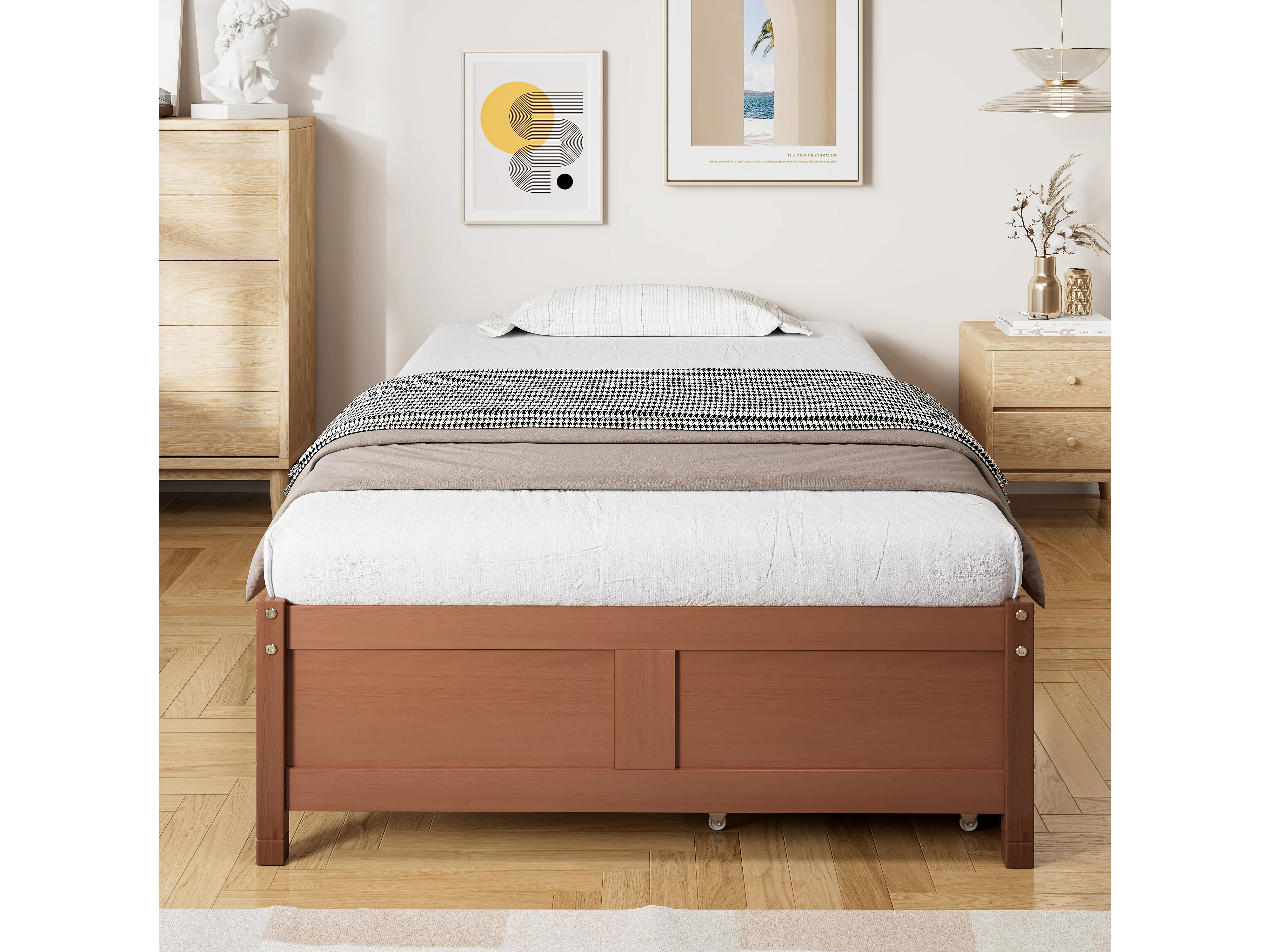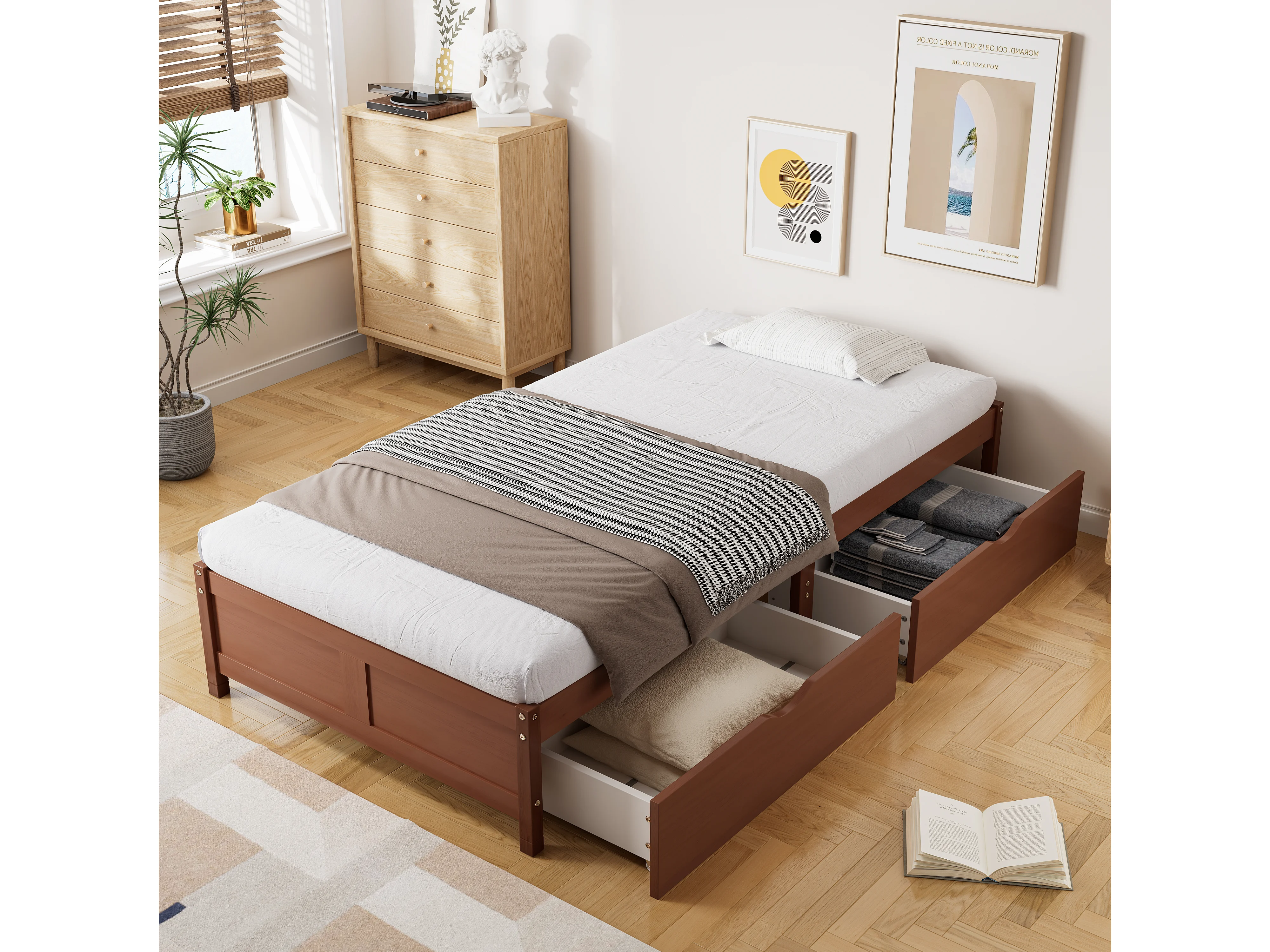Lit plat avec tiroirs roulants, structure en pin et MDF, couleur bois vintage, 90x200 cm (206x96x35 cm)