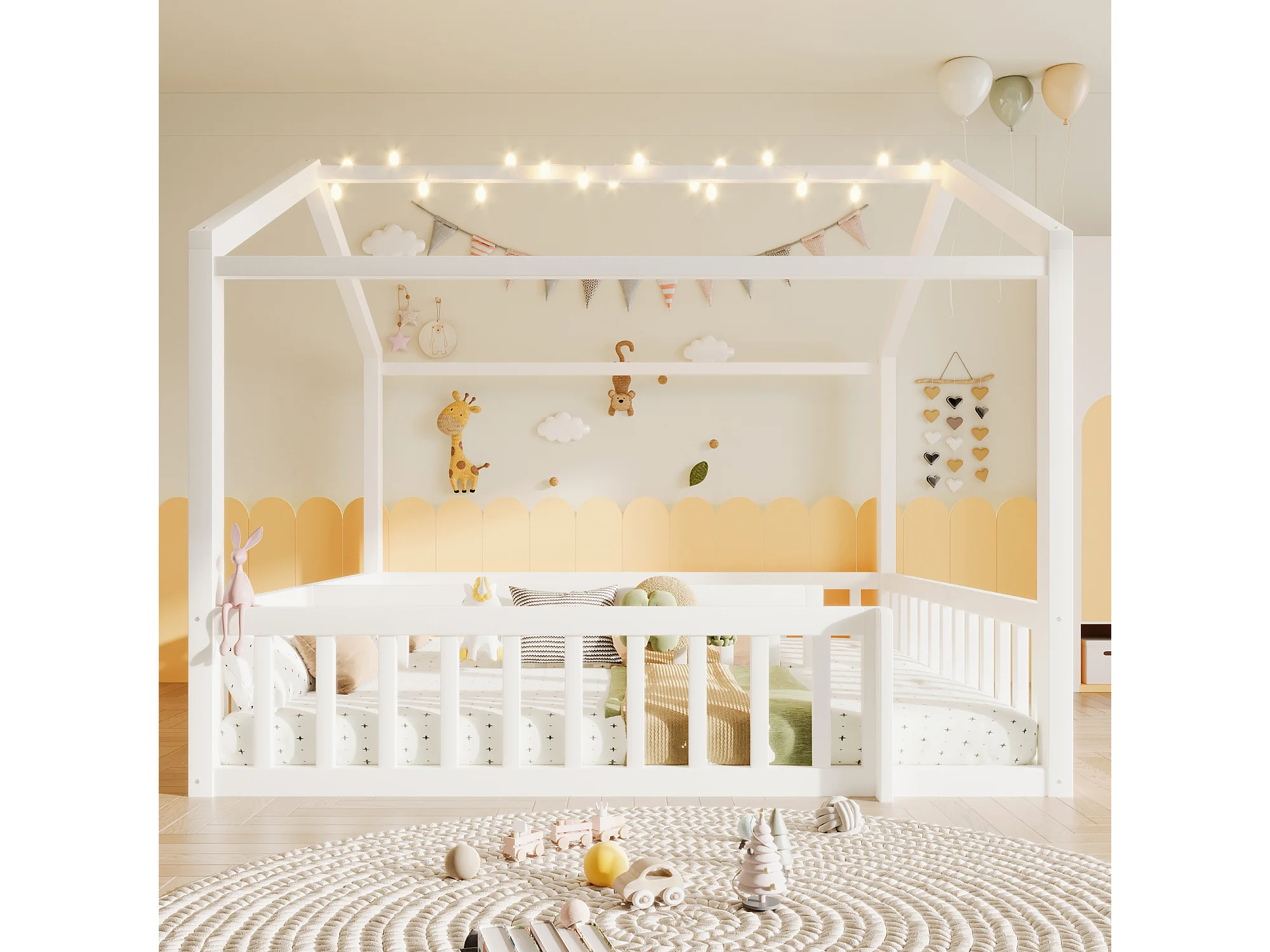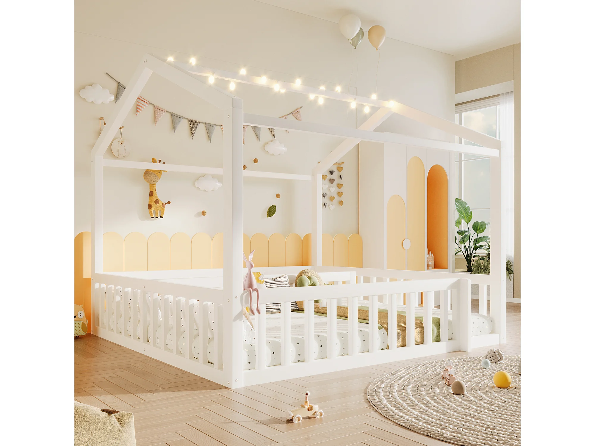 Lit plat pour enfant - 2 x 90 x 190 cm/ 180 x 190 cm - avec barrière de sécurité + Leds - style minimaliste - bois - blanc