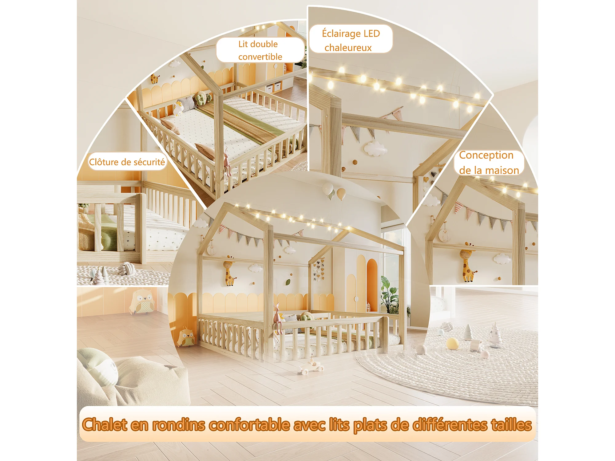 Lit plat pour enfant - 2 x 90 x 190 cm/ 180 x 190 cm - avec barrière de sécurité + Leds - style minimaliste - bois - naturel