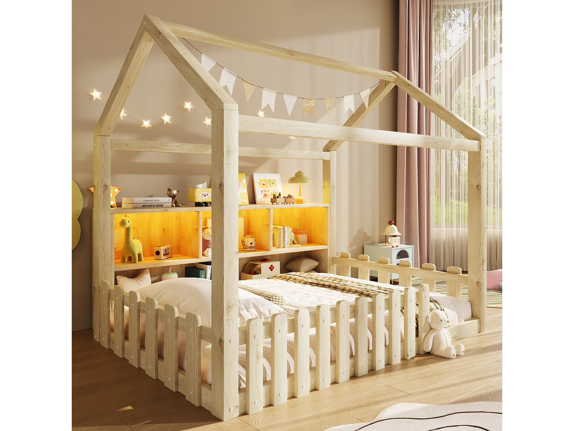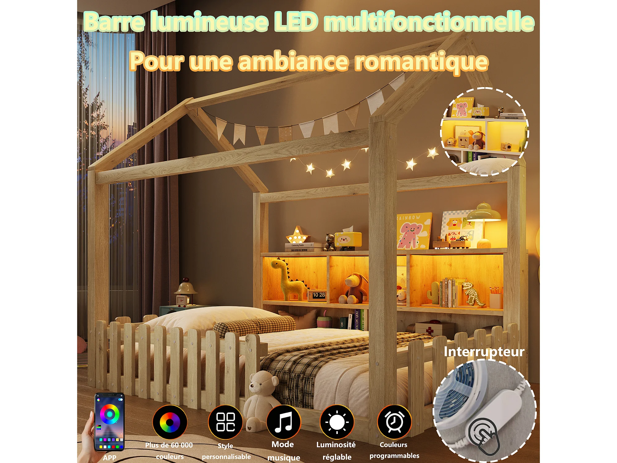 Lit plat pour enfant - 90 x 190 cm - avec barrière de sécurité + Leds + étagère de rangement - design maison - pin - naturel