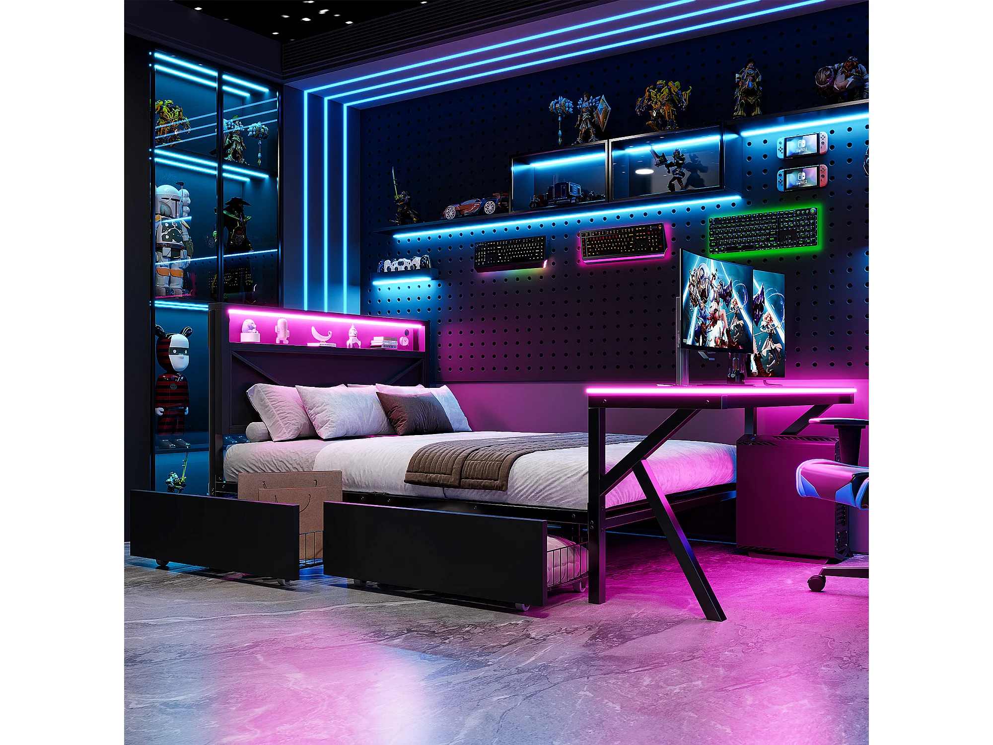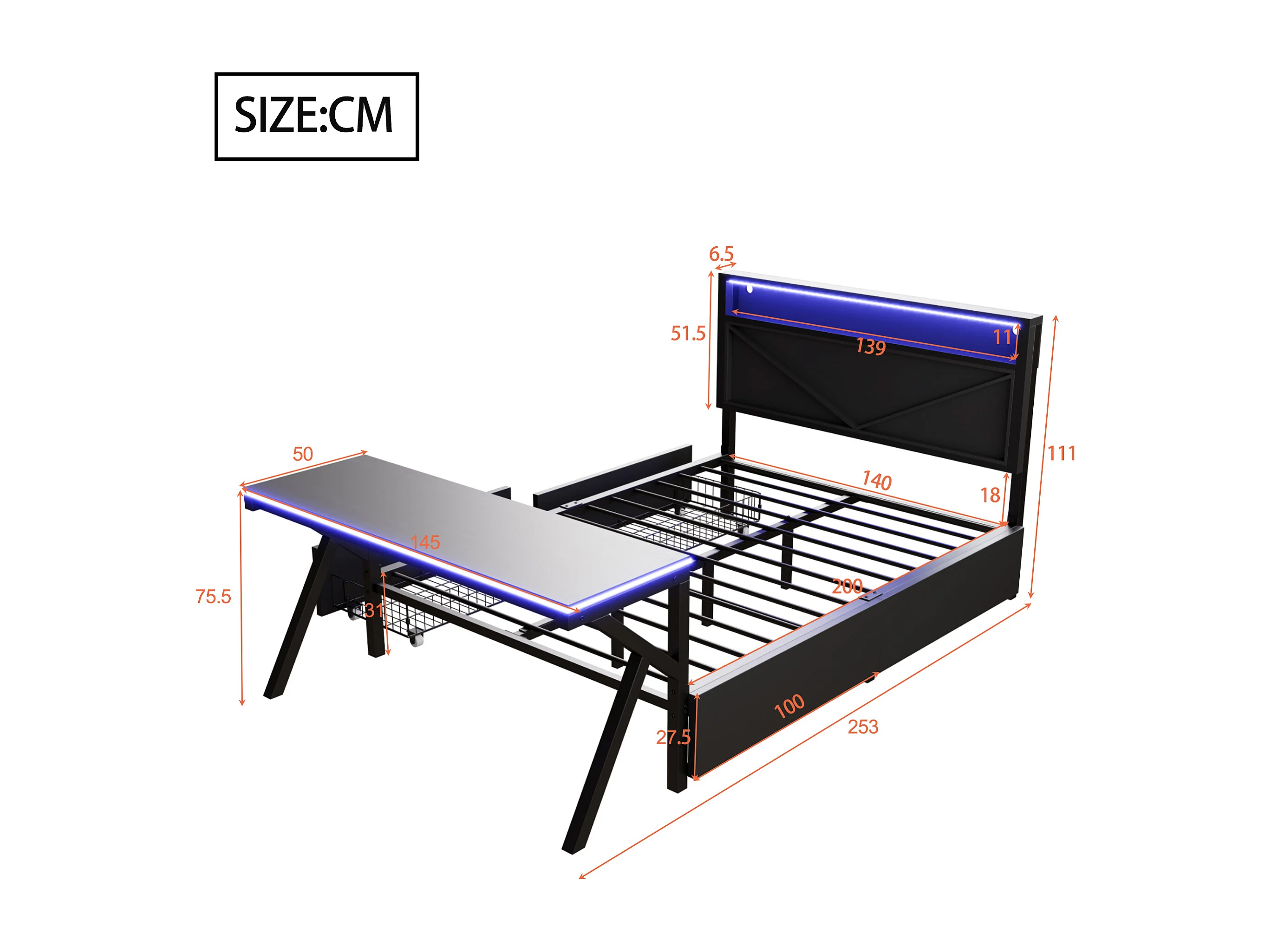 Lit plateforme gaming en métal pour enfant - 140 x 200 cm - avec tête de lit + bureau + 2 tiroirs + Leds - noir