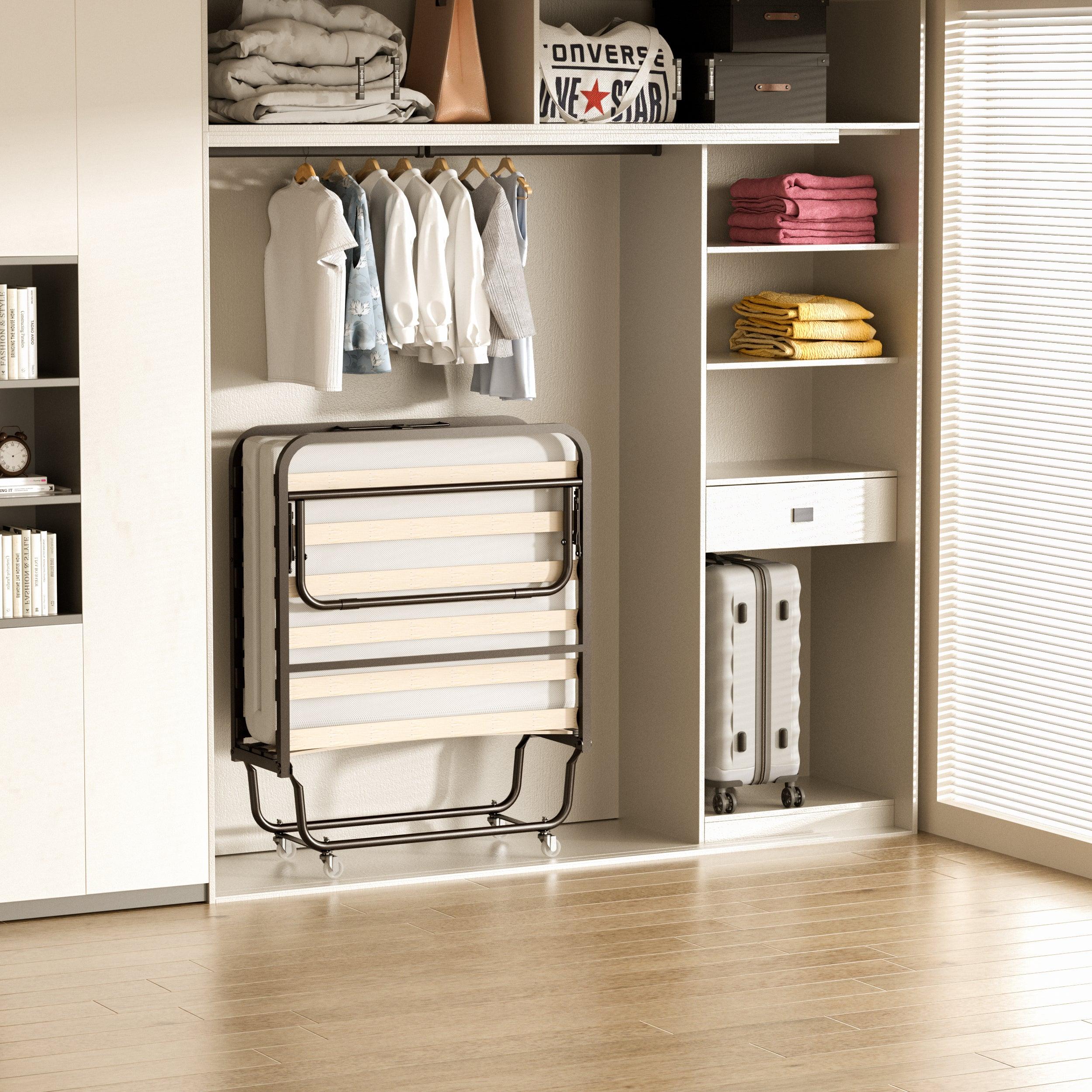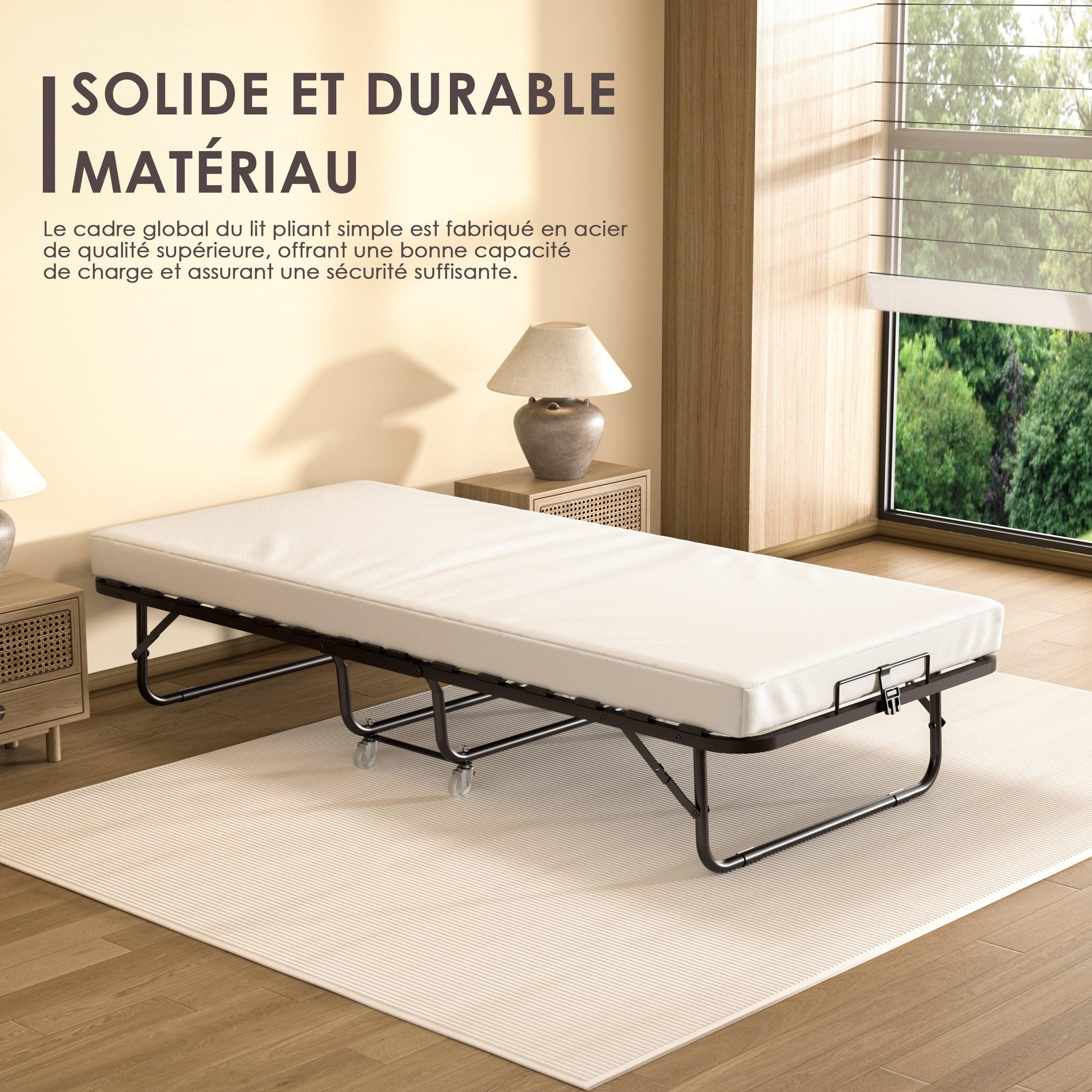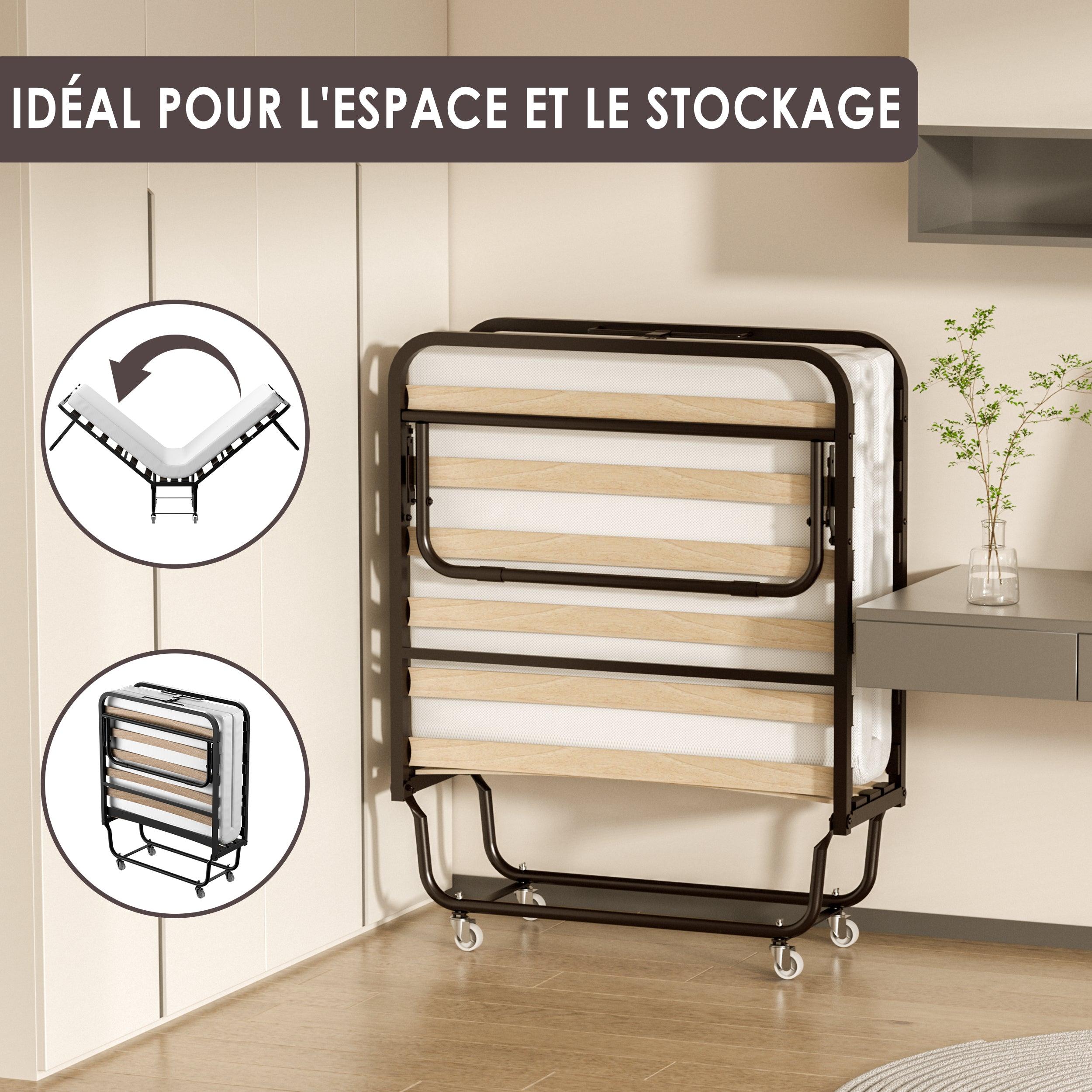 Lit Pliant 90x190 CM avec Matelas de 10cm, Lit Pliable 1 Personne Adulte, 4 roulettes, 2 Min Assembler