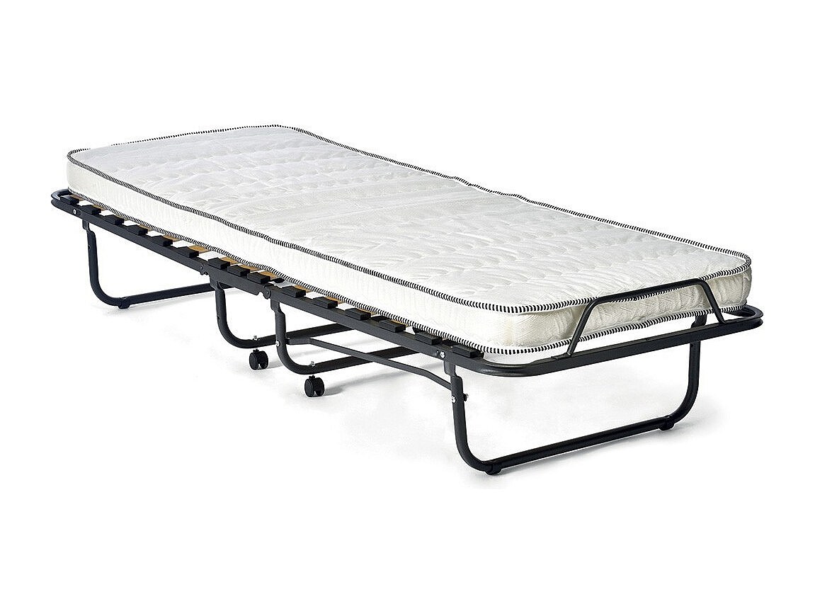 Lit pliant NAZARE – 90x200 cm en métal noir avec roulettes, sommier et matelas inclus