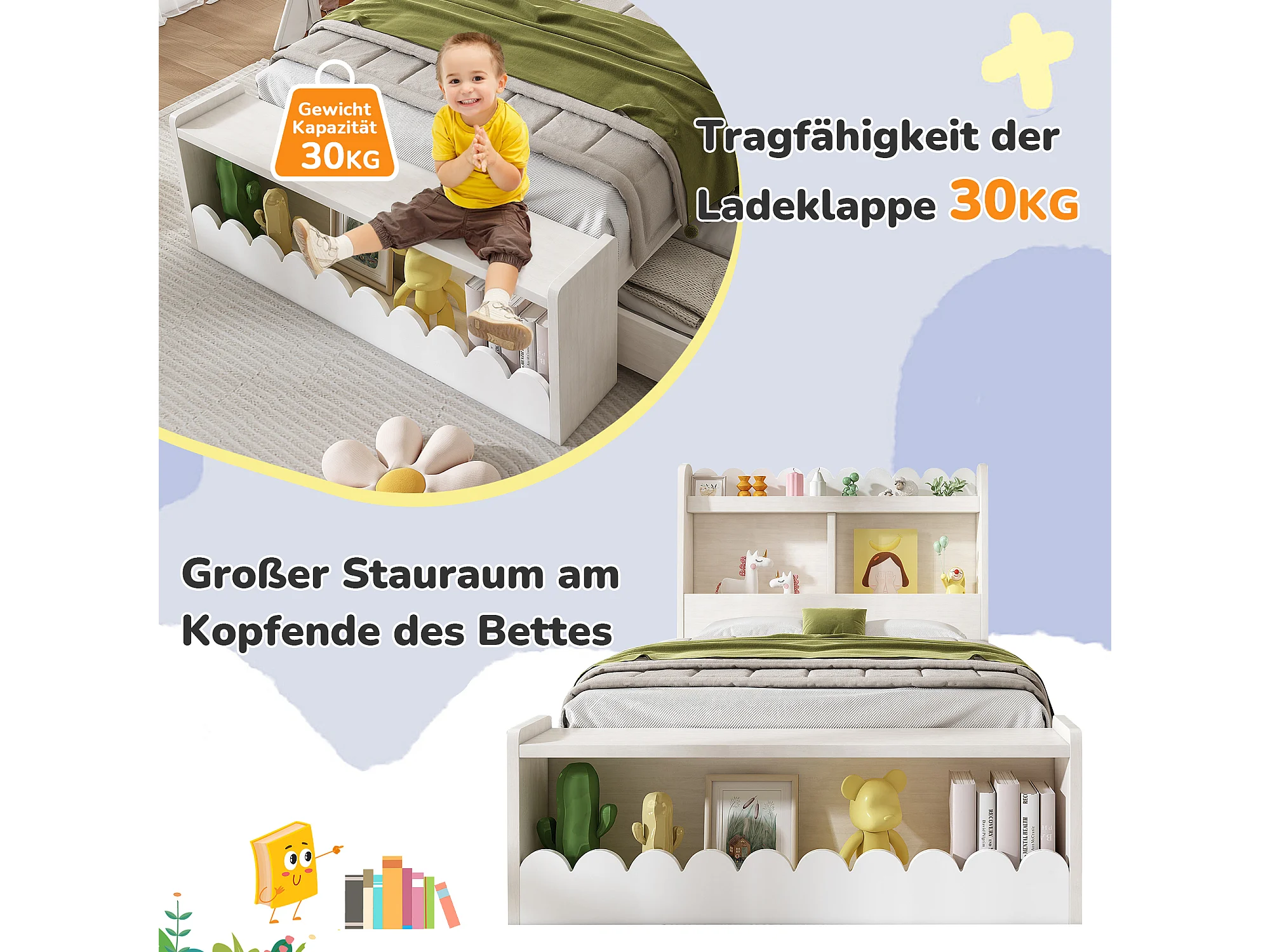 Lit pour enfant 90x190 cm avec rangement, étagères et banc, cadre en bois avec sommier, blanc et chêne clair (230x98x100 cm)