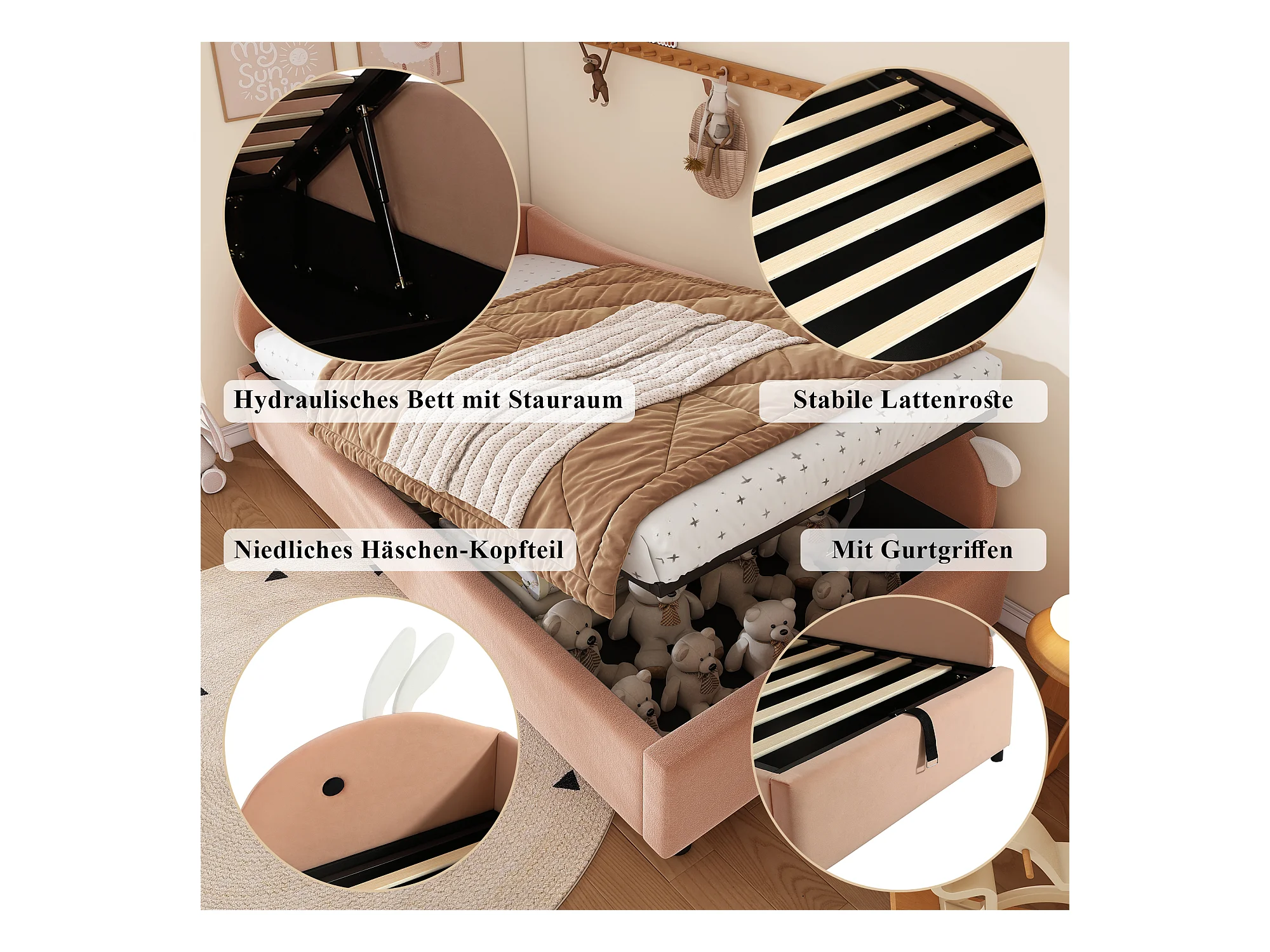 Lit pour enfant 90x200 cm, avec tête de lit en forme de lapin, système hydraulique de rangement, tissu en velours, gris et blanc (205x93.5x92 cm)