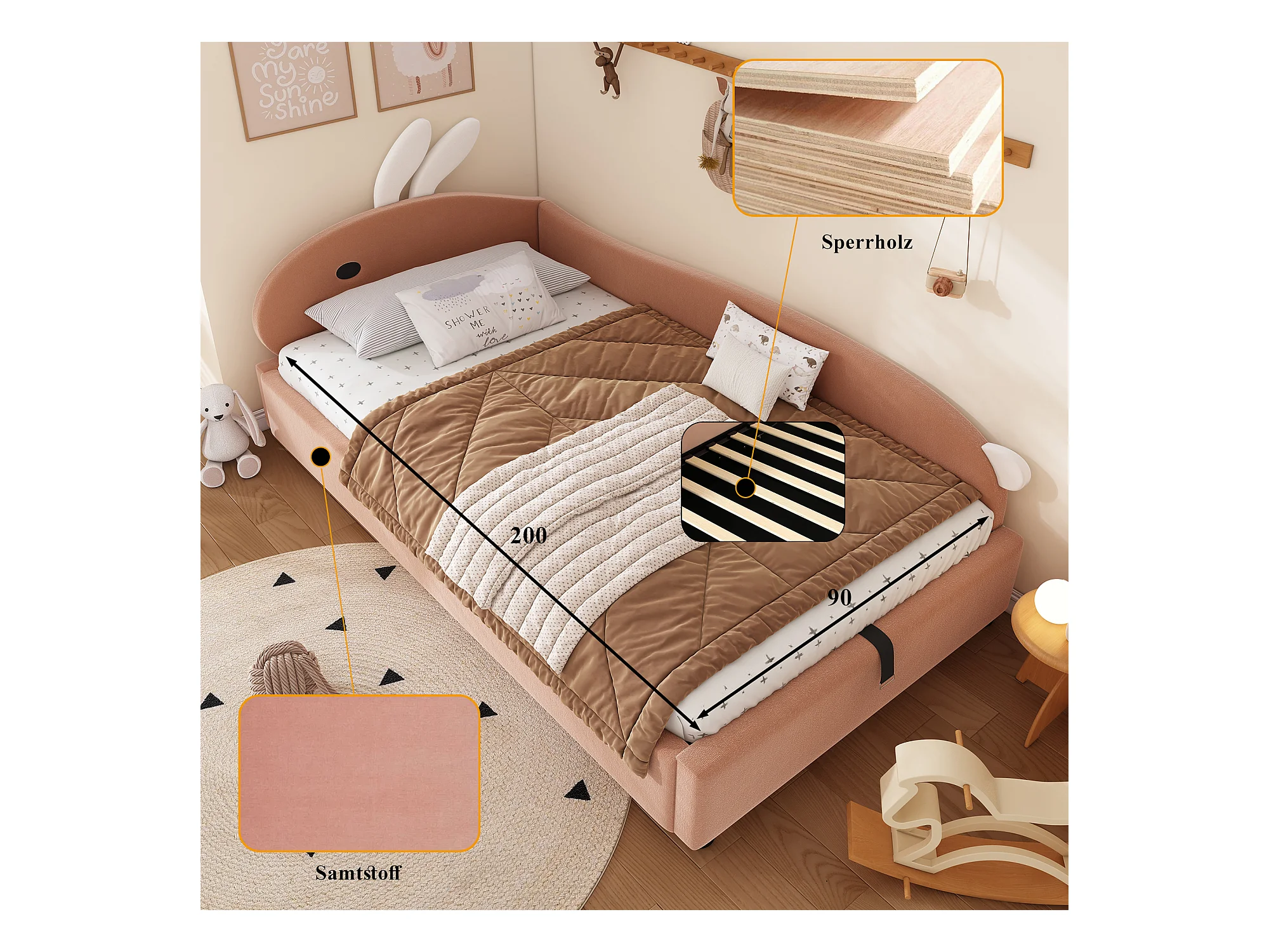 Lit enfant 90x200 cm, avec rangement hydraulique, tête de lit en forme de lapin, tissu en velours, gris et blanc, 205x93.5x92 cm