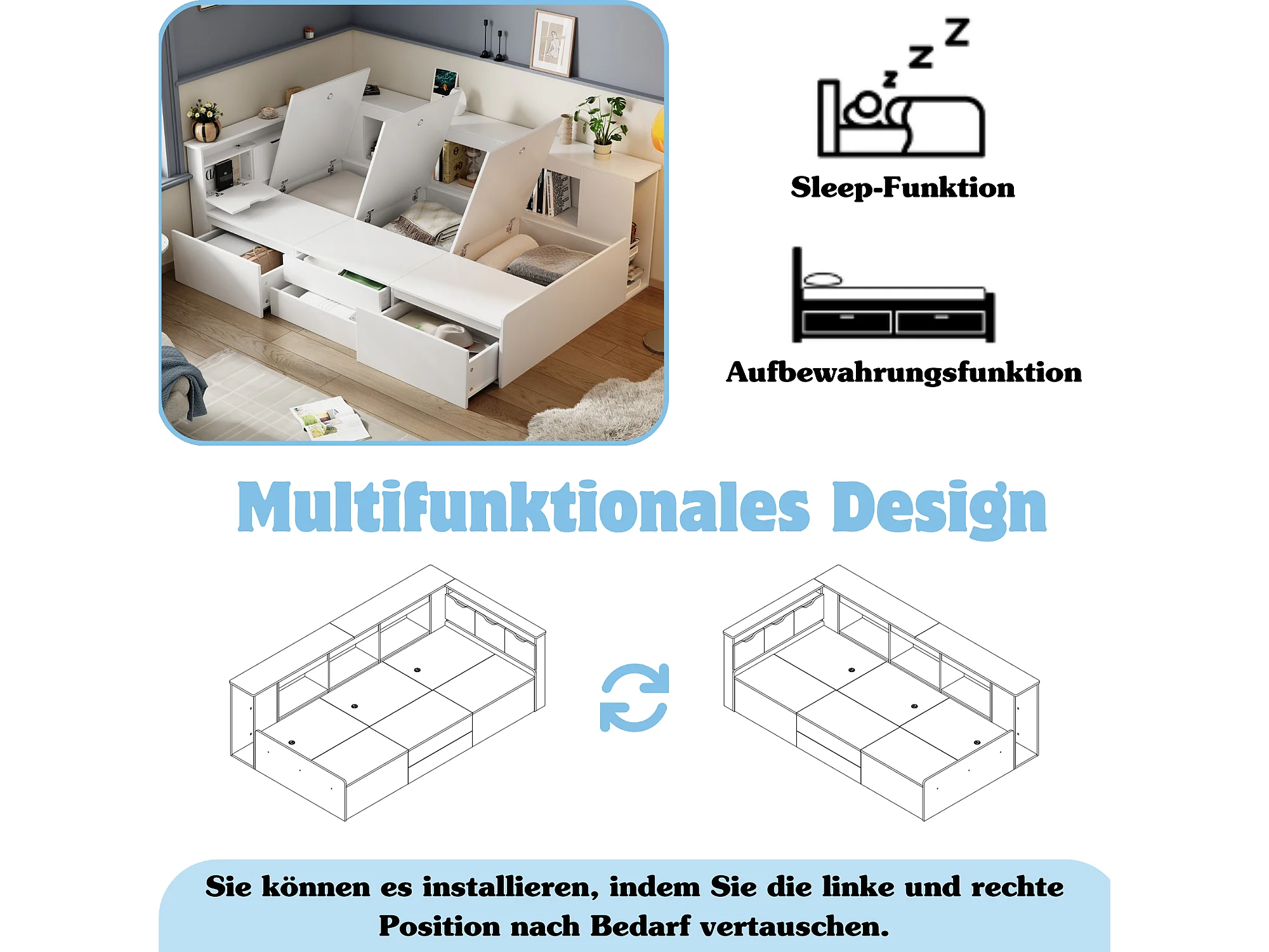 Lit pour enfant, 90x200cm, multifonctionnel avec tiroirs, étagères et coffre de rangement, blanc (Dimensions : 205 x 95 x 161.5 cm)